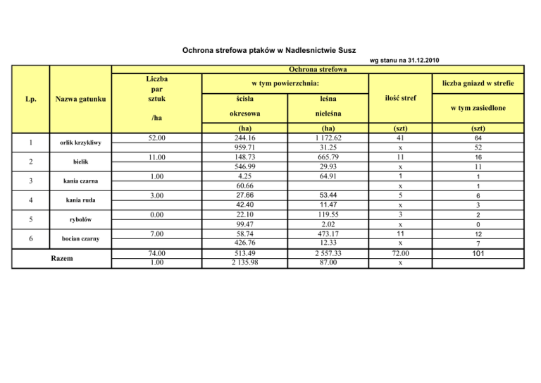 Ochrona strefowa ptaków w Nadlesnictwie Susz wg stanu na 31.12.2010 Ochrona strefowa Lp. Nazwa gatunku Liczba par sztuk /ha 1 orlik krzykliwy 2 bielik 3 kania czarna 4 kania ruda 5 rybołów 6 bocian czarny Razem 52.00 11.00 1.00 3.00 0.00 7.00 74.00 1.00 w tym powierzchnia: liczba gniazd w strefie ścisła leśna okresowa nieleśna (ha) 244.16 959.71 148.73 546.99 4.25 60.66 (ha) 1 172.62 31.25 665.79 29.93 64.91 27.66 42.40 53.44 11.47 22.10 99.47 58.74 426.76 513.49 2 135.98 119.55 2.02 473.17 12.33 2 557.33 87.00 ilość stref w tym zasiedlone (szt) 41 x 11 x (szt) 1 1 x 5 x 3 x 1 3 11 12 x 72.00 x 7 101 64 52 16 11 6 2 0 Ochrona strefowa ptaków w Nadlesnictwie Susz wg stanu na 31.12.2011 Ochrona strefowa Lp. Nazwa gatunku Liczba par sztuk /ha 1 orlik krzykliwy b.d 2 bielik b.d 3 kania czarna 1.00 b.d 4 kania ruda b.d 5 rybołów b.d 6 bocian czarny b.d Razem w tym powierzchnia: ścisła okresowa (ha) 252.45 808.90 133.67 317.72 4.25 30.13 27.66 94.57 30.70 68.76 61.11 372.49 640.69 1692.57 leśna nieleśna (ha) 1 021.87 39.48 428.41 22.98 34.38 106.79 15.44 97.43 2.03 421.9 11.7 2110.78 91.63 liczba gniazd w strefie ilość stref w tym zasiedlone (szt) 47 x 11 x 1.00 x 4 x 3 x 8.00 x 72 x (szt) 69 x 15 x 1.00 x 5 x 2 x 8.00 x 100 x Ochrona strefowa ptaków w Nadlesnictwie Susz wg stanu na 31.12.2012 Ochrona strefowa Lp. Nazwa gatunku Liczba par sztuk /ha 1 orlik krzykliwy b.d 2 bielik b.d 3 kania czarna 1.00 b.d 4 kania ruda b.d 5 rybołów b.d 6 bocian czarny b.d Razem w tym powierzchnia: ścisła okresowa (ha) 254.21 809.69 124.29 310.18 4.25 30.13 27.66 94.57 30.70 68.76 61.11 372.49 510.07 1685.82 leśna nieleśna (ha) 1 024.42 39.48 411.49 22.98 34.38 106.79 15.44 97.43 2.03 421.9 11.7 2104.26 91.63 liczba gniazd w strefie ilość stref w tym zasiedlone (szt) 34 x 10 x 1.00 x 4 x 3 x 11.00 x 64 x (szt) 64 x 13 x 1.00 0 5 x 2 x 12.00 x 98 x