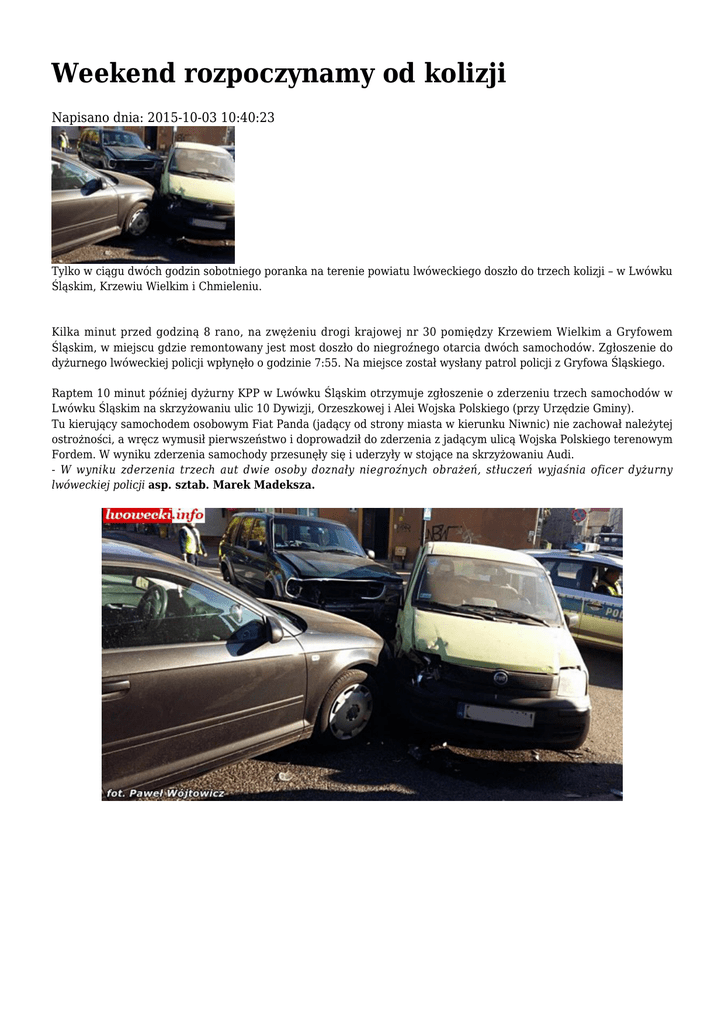 Weekend rozpoczynamy od kolizji Napisano dnia: 2015-10-03 10:40:23 Tylko w ciągu dwóch godzin sobotniego poranka na terenie powiatu lwóweckiego doszło do trzech kolizji – w Lwówku Śląskim, Krzewiu Wielkim i Chmieleniu. Kilka minut przed godziną 8 rano, na zwężeniu drogi krajowej nr 30 pomiędzy Krzewiem Wielkim a Gryfowem Śląskim, w miejscu gdzie remontowany jest most doszło do niegroźnego otarcia dwóch samochodów. Zgłoszenie do dyżurnego lwóweckiej policji wpłynęło o godzinie 7:55. Na miejsce został wysłany patrol policji z Gryfowa Śląskiego. Raptem 10 minut później dyżurny KPP w Lwówku Śląskim otrzymuje zgłoszenie o zderzeniu trzech samochodów w Lwówku Śląskim na skrzyżowaniu ulic 10 Dywizji, Orzeszkowej i Alei Wojska Polskiego (przy Urzędzie Gminy). Tu kierujący samochodem osobowym Fiat Panda (jadący od strony miasta w kierunku Niwnic) nie zachował należytej ostrożności, a wręcz wymusił pierwszeństwo i doprowadził do zderzenia z jadącym ulicą Wojska Polskiego terenowym Fordem. W wyniku zderzenia samochody przesunęły się i uderzyły w stojące na skrzyżowaniu Audi. - W wyniku zderzenia trzech aut dwie osoby doznały niegroźnych obrażeń, stłuczeń wyjaśnia oficer dyżurny lwóweckiej policji asp. sztab. Marek Madeksza. Przed godziną 10-tą do dyżurnego wpłynęło zgłoszenie o zdarzeniu drogowym w Chmieleniu. Na chwilę obecną jeszcze nie wiadomo co tam się stało. Patrol policji jest w drodze. Policjanci apelują o zachowanie ostrożności na drodze. Jesienne drogi są bardzo zdradliwe. Asfalt często pokryty jest mokrymi liśćmi, a znajdujące się nisko nad horyzontem słońce oślepia.
