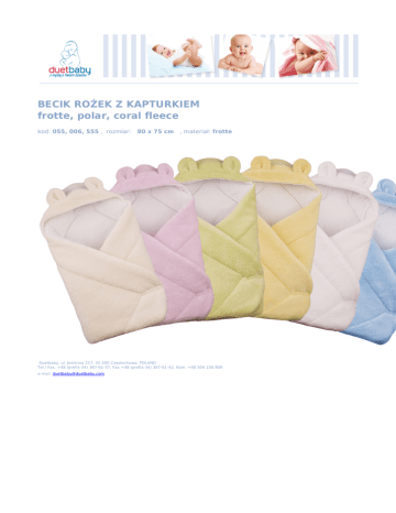 BECIK ROŻEK Z KAPTURKIEM frotte, polar, coral fleece kod: 055, 006, 555 , rozmiar: 80 x 75 cm , materiał: frotte Duetbaby, ul. Jesienna 217, 42-200 Częstochowa, POLAND Tel / Fax. +48 (prefix-34) 387-61-37, Fax +48 (prefix-34) 387-61-42, Kom. +48 504 158 809 e-mail: [email protected] Powered by TCPDF (www.tcpdf.org)
