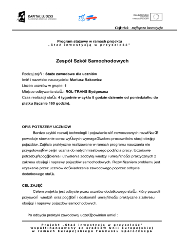 Człowiek - najlepsza inwestycja Program stażowy w ramach projektu „ St aż inw est ycją w p rz yszłość” Zespół Szkół Samochodowych Rodzaj zajęć: Staże zawodowe dla uczniów Imię i nazwisko nauczyciela: Mariusz Rakowicz Liczba uczniów w grupie: 1 Miejsce odbywania stażu: ROL-TRANS Bydgoszcz Czas realizacji stażu: 4 tygodnie w cyklu 8 godzin dziennie od poniedziałku do piątku (łącznie 160 godzin). OPIS POTRZEBY UCZNIÓW Bardzo szybki rozwój technologii i pojawianie się nowoczesnych rozwiązań powoduje stawianie coraz wyższych wymagań wobec pracowników stacji obsługi pojazdów. Zajęcia praktyczne realizowane w ramach programu nauczania nie przygotowują w pełni ucznia do natychmiastowego podjęcia pracy. Uczniowie potrzebują pogłębienia i utrwalenia zdobytej wiedzy i umiejętności praktycznych z zakresu obsługi i naprawy pojazdów samochodowych. Rozwiązaniem problemu jest uzyskanie przez uczniów doświadczenia zawodowego poprzez odbycie dodatkowego stażu. CEL ZAJĘĆ Celem projektu jest odbycie przez uczniów dodatkowego stażu, który pozwoli przyswoić wiedzę oraz pogłębić i doskonalić umiejętności praktyczne z zakresu obsługi i naprawy pojazdów samochodowych. Po odbyciu praktyki zawodowej uczeń powinien umieć: P r o j e k t „ S t a ż i n w e s t y c j ą w p r z y s z ł o ś ć ” w s p ó ł f i n a n s o w a n y z e ś r o d k ó w U n i i E u r o p e j s k i e j w r a m a c h E u r o p e j s k i e g o F u n d u s z u S p o ł e c z n e g o Człowiek - najlepsza inwestycja - korzystać z Dokumentacji Techniczno Rozruchowej, - korzystać z dokumentacji technicznej, - spełniać standardy dot. obsługi klienta w serwisie, - pracować w Biurze Obsługi Klienta, - wykonać czynności związane z obsługą techniczną i naprawą pojazdów samochodowych, - obsłużyć podstawowe urządzenia stanowiące wyposażenie technologiczne zakładu, - dostosować się do wymogów organizacji pracy w zespole i dyscypliny obowiązującej w zakładzie, - zorganizować i utrzymać w należytym porządku swoje miejsce pracy, - ocenić jakość wykonanej pracy, - zastosować się do zasad bhp, p.poż. i ochrony środowiska. ORGANIZACJA ZAJĘĆ Dodatkowy staż odbywać się będzie w przedsiębiorstwie transportowym z własnym zapleczem obsługowo- naprawczym. Zakład ten jest wyposażony w narzędzia i urządzenia do badania, obsługi i naprawy samochodów osobowych i ciężarowych. Specyficzne warunki pracy zakładu przedstawią uczniowi realia z jakimi się spotka w przyszłości podczas wykonywania zawodu. Odpowiednia baza techniczna pozwoli na poznanie stosowanych współcześnie technik i technologii napraw. MATERIAŁ NAUCZANIA Struktura technologiczno – organizacyjna. Obieg dokumentacji w zakładzie. Przyjmowanie pojazdów do obsługi i naprawy. Kontrola stanu technicznego pojazdów i ich zespołów. Zabiegi obsługowo – naprawcze na stanowiskach specjalistycznych. P r o j e k t „ S t a ż i n w e s t y c j ą w p r z y s z ł o ś ć ” w s p ó ł f i n a n s o w a n y z e ś r o d k ó w U n i i E u r o p e j s k i e j w r a m a c h E u r o p e j s k i e g o F u n d u s z u S p o ł e c z n e g o Człowiek - najlepsza inwestycja SZCZEGÓŁOWY PLAN REALIZACJI ZAJĘĆ Nr tematu Temat zajęć Wynik pracy 1/20 Szkolenie BHP, p.poż. i ochr. środowiska Zapoznanie z przepisami BHP, p.poż. i ochrony środowiska Zapoznanie z niebezpieczeństwem czyhającym na stanowisku pracy 2/20 Struktura organizacyjna Zapoznanie z strukturą zakładu 3/20 Dokumentacja zakładu Zapoznanie z procedurą obiegu dokumentów i funkcjonowaniem Biura Obsługi Klienta 4/20 Standardy obsługi klientów w serwisie Zapoznanie z elementami recepcji aktywnej: - przyjęcie zlecenia (zgłoszenia), - powitanie klienta, - przyjęcie pojazdu do naprawy, - konsultacje z mechanikami, - kontakt z klientem podczas obsługi, - przygotowanie pojazdu do wydania, - wydanie pojazdu, - kontakt po obsłudze serwisowej 5/20 Obsługa urządzeń stanowiących wyposażenie zakładu Zapoznanie z Dokumentacją Techniczno-Rozruchową P r o j e k t „ S t a ż i n w e s t y c j ą w p r z y s z ł o ś ć ” w s p ó ł f i n a n s o w a n y z e ś r o d k ó w U n i i E u r o p e j s k i e j w r a m a c h E u r o p e j s k i e g o F u n d u s z u S p o ł e c z n e g o Człowiek - najlepsza inwestycja 6/20 Metody lokalizacji uszkodzeń pojazdów samochodowych Zapoznanie z skutecznością metod wykorzystywanych w lokalizacji uszkodzeń Zapoznanie z skutkami wykonania błędnej diagnozy lub naprawy 7/20 Kontrola stanu technicznego pojazdu Zapoznanie z sposobem wykonywania kontroli stanu technicznego pojazdu i zespołów 8/20 Przeglądy okresowe pojazdu sam. Zapoznanie z realizacją zabiegów obsługi technicznej wg. list przeglądowych 9/20 Zabiegi naprawcze Zapoznanie z technologią napraw 10/20 Układy klimatyzacji Zapoznanie z czynnościami wykonywanymi podczas obsługi i naprawy układów klimatyzacji 11/20 Geometria pojazdu Wykonanie pomiaru i regulacji geometrii zawieszenia pojazdu 12/20 Układ hamulcowy Wykonanie czynności związanych z obsługą i naprawą układu hamulcowego 13/20 Układ kierowniczy Wykonanie czynności związanych z naprawą układu kierowniczego 14/20 Układ zawieszenia Wykonanie czynności związanych z naprawą układu P r o j e k t „ S t a ż i n w e s t y c j ą w p r z y s z ł o ś ć ” w s p ó ł f i n a n s o w a n y z e ś r o d k ó w U n i i E u r o p e j s k i e j w r a m a c h E u r o p e j s k i e g o F u n d u s z u S p o ł e c z n e g o Człowiek - najlepsza inwestycja zawieszenia 15/20 Układ elektryczny Wykonanie czynności związanych z kontrolą i naprawą układów elektrycznych 16/20 Oświetlenie Wykonanie kontroli poprawności ustawienia świateł Regulacja ustawienia świateł 17/20 Opony Zapoznanie z sposobami wykonywania kontroli, wymiany i naprawy opon 18/20 Diagnostyka komputerowa pojazdu sam. Wykonanie monitorów i pomiar warto