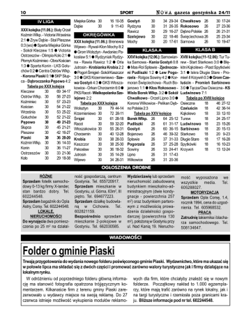 10 SPORT IV LIGA XXX kolejka (11.06.): Bia³y Orze³ Komin Wlkp. - Victoria Wrzenia 2:1 l Zryw D¹bie - Stal Pleszew 0:3 (wo) l Sparta Miejska Górka - Sokó³ Kleczew 1:5 l Victoria Ostrzeszów - Olimpia Ko³o 2:1 l P³omyk Kominiec - Obra Kocian 1:3 l Sparta Konin - LKS Go³uchów 0:2 l Centra Ostrów Wlkp. - Korona Piaski 0:1l SKP S³upca - D¹broczanka Pêpowo 4:2 Tabela po XXX kolejce Kleczew 30 69 34-17 Ostrów Wlkp. 30 58 27-23 Kominiec 30 57 23-23 Kocian 30 54 21-22 Wrzenia 30 53 25-22 Go³uchów 30 52 21-22 Pêpowo 30 49 21-23 S³upca 30 45 21-21 Pleszew 30 42 16-27 Piaski 30 36 20-20 Komin Wlkp. 30 36 14-33 Konin 30 36 11-27 Ostrzeszów 30 33 21-36 Ko³o 30 29 18-38 N O W A gazeta gostyñska 24/11 Miejska Górka 30 D¹bie 30 16 10-35 Gostyñ 30 34 29-34 9 11-43 Rydzyna 30 31 26-35 Rawicz 30 29 16-27 OKRÊGÓWKA Szelejewo 30 22 18-46 XXX kolejka (11.06.): Brenewia Mochy 30 20 17-61 Wijewo - Rywal-Klon Mochy 8:2 KLASA A l Grom Wolsztyn - Awdaniec Pakos³aw 5:1 l Rydzyniak Rydzy- XXVI kolejka (12.06.): Sarnowianna - Rawia Rawicz 1:2 l Orla ka Sarnowa - Kania Gostyñ 0:8 Jutrosin - Krobianka Krobia 2:2 l Mas-Rol Sp³awie - Zjednoczel Pogoñ migiel - Sokó³ Kaszczor ni Pudliszki 1:2 l Lew Pogo3:0 l GKS Krzemieniewo - Sze- rzela - Rolgos Sowiny 4:2 l Korwa Gostyñ 4:3 l GKS W³osza- moran wiêciechowa - Ruch Bokowice - Orkan Chorzemin 6:0 l janowo 1:1 l K³os Rokosowo PKS Racot - Wielkopolanka Sze- Wis³a Borek Wlkp. 3:2 l Sokó³ lejewo 2:2 Chwa³kowo - Orze³ Lipno 3:0 l Korona Wilkowice - Pelikan DêbTabela po XXX kolejce Wolsztyn 30 79 44-14 no Polskie 2:3 Krzemieniewo 30 72 28-11 Tabela po XXV kolejce migiel 30 61 28-18 Borek Wlkp. 26 64 25-12 Racot 30 59 32-20 Pudliszki 26 61 31-17 W³oszakowice 30 55 26-31 Gostyñ 26 60 36-15 Chorzemin 30 40 12-28 Bojanowo 26 46 39-32 Krobia 30 38 28-33 Sp³awie 26 37 31-33 Kaszczor 30 38 25-30 Pogorzela 26 37 25-28 Pakos³aw 30 36 18-32 Sowiny 26 33 24-41 Jutrosin 30 35 14-29 Lipno 26 31 17-43 Wijewo 30 34 26-31 Wilkowice 26 31 20-36 Chwa³kowo 26 Rokosowo 26 Dêbno Polskie 26 wiêciechowa 26 Sarnowa 26 30 27 26 25 10 17-24 23-36 21-31 23-34 19-47 KLASA B XVIII kolejka (11-12.06): Tur Turew - Start Starkowo 3:0 l B³êkitni K¹kolewo - Piast Spytkówki 3:1 l Iskra D³ugie Stare - Promieñ II Krzywiñ 0:3 l Grom Czelucin - Promieñ Sarbinowo 3:0 l Têcza/Osa Osieczna - KS Ludwinowo 7:1 Tabela po XVIII kolejce Osieczna 18 46 27-12 Czelucin 18 42 36-14 K¹kolewo 18 33 12-10 Turew 18 24 25-17 Ludwinowo 18 23 15-26 Sarbinowo 18 20 15-13 Starkowo 18 20 9-23 D³ugie Stare 18 17 16-28 Spytkówki 18 16 10-23 Krzywiñ 18 13 12-24 OG£OSZENIA DROBNE RÓ¯NE Sprzedam fotelik samochodowy 0-13 kg firmy X-lander, stan bardzo dobry. Tel. 602244548. Sprzedam baga¿nik do Opla Astry, Corsy. Tel. 602244548. LOKALE, NIERUCHOMOCI Do wynajêcia dwa pomieszczenia po 25 m2 na dzia³al- noæ gospodarcz¹, centrum Gostynia. Tel. 655720917. Sprzedam mieszkanie w Gostyniu, ul. Górna, 63m2, III piêtro. Tel. 694677223. Sprzedam dzia³kê budowlan¹ w Cichowie. Tel. 602821159. Bezporednio sprzedam mieszkanie 2-pokojowe w Gostyniu. Tel. 662030585. Wydzier¿awiê lub sprzedam nieruchomoæ zabudowan¹ budynkiem mieszkalno-administracyjnym (dwie kondygnacje - powierzchnia 257 m2) oraz budynkiem parterowym z mo¿liwoci¹ prowadzenia dzia³alnoci gospodarczej (powierzchnia 130 m2), po³o¿on¹ w Gostyniu przy ul. Nad Kani¹ 19. Nierucho- moæ wyposa¿ona we wszystkie media. Tel. 605288027. MOTORYZACJA Sprzedam Opla Corsê, 1.4, rocznik 1994, cena do uzgodnienia. Tel. 605968532. PRACA Zatrudniê lakiernika i blacharza samochodowego. Tel. 508134647. WIADOMOCI Folder o gminie Piaski Trwaj¹ przygotowania do wydania nowego folderu powiêconego gminie Piaski. Wydawnictwo, które ma ukazaæ siê w po³owie lipca ma sk³adaæ siê z dwóch czêci i promowaæ zarówno walory turystyczne jak i firmy dzia³aj¹ce na lokalnym rynku. W odró¿nieniu od poprzedniego folderu g³ówn¹ informa- wych dla firm, które chcia³yby znaleæ siê w nowym cjê ma stanowiæ fotografia opatrzona trójjêzycznym ko- folderze. Pocz¹tkowy nak³ad to 1.000 egzemplamentarzem. Kilkanacie firm z terenu gminy Piaski zare- rzy, które maj¹ trafiæ zarówno na rynek lokalny, jak i zerwowa³o u wydawcy miejsce na swoj¹ reklamê. Do 27 na targi turystyczne i rzemios³a poza granicami kraczerwca istnieje mo¿liwoæ wykupienia modu³ów reklamo- ju. Bli¿sze informacje pod nr tel. 602244548.