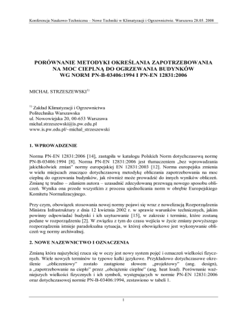 Konferencja Naukowo-Techniczna – Nowe Techniki w Klimatyzacji i Ogrzewnictwie. Warszawa 28.05. 2008 PORÓWNANIE METODYKI OKREŚLANIA ZAPOTRZEBOWANIA NA MOC CIEPLNĄ DO OGRZEWANIA BUDYNKÓW WG NORM PN-B-03406:1994 I PN-EN 12831:2006 MICHAŁ STRZESZEWSKI1) Zakład Klimatyzacji i Ogrzewnictwa Politechnika Warszawska ul. Nowowiejska 20, 00-653 Warszawa [email protected] www.is.pw.edu.pl/~michal_strzeszewski 1) 1. WPROWADZENIE Norma PN-EN 12831:2006 [14], zastąpiła w katalogu Polskich Norm dotychczasową normę PN-B-03406:1994 [8]. Norma PN-EN 12831:2006 jest tłumaczeniem „bez wprowadzania jakichkolwiek zmian” normy europejskiej EN 12831:2003 [12]. Norma europejska zmienia w wielu miejscach znacząco dotychczasową metodykę obliczania zapotrzebowania na moc cieplną do ogrzewania budynków, jak również może prowadzić do innych wyników obliczeń. Zmianę tę trudno – zdaniem autora – uzasadnić zdecydowaną przewagą nowego sposobu obliczeń. Wynika ona przede wszystkim z procesu ujednolicania norm w obrębie Europejskiego Komitetu Normalizacyjnego. Przy czym, obowiązek stosowania nowej normy pojawi się wraz z nowelizacją Rozporządzenia Ministra Infrastruktury z dnia 12 kwietnia 2002 r. w sprawie warunków technicznych, jakim powinny odpowiadać budynki i ich usytuowanie [15], w zakresie i terminie, które zostaną podane w rozporządzeniu [2]. W związku z tym do czasu wejścia w życie zmiany powyższego rozporządzenia istnieje paradoksalna sytuacja, w której obowiązkowe jest wykonywanie obliczeń wg normy archiwalnej. 2. NOWE NAZEWNICTWO I OZNACZENIA Zmianą która najszybciej rzuca się w oczy jest nowy system pojęć i oznaczeń wielkości fizycznych. Wiele nowych terminów to typowe kalki językowe. Przykładowo dotychczasowe określenie „obliczeniowy” zostało zastąpione słowem „projektowy” (ang. design), a „zapotrzebowanie na ciepło” przez „obciążenie cieplne” (ang. heat load). Porównanie ważniejszych wielkości fizycznych i ich symboli, występujących w normie PN-EN 12831:2006 oraz dotychczasowej normie PN-B-03406:1994, zestawiono w tabeli 1. 1 Konferencja Naukowo-Techniczna – Nowe Techniki w Klimatyzacji i Ogrzewnictwie. Warszawa 28.05. 2008 Tabela 1. Porównanie wybranych wielkości i symboli występujących w normach PN-EN 12831:2006 i PN-B-03406:1994 [14, 8] PN-EN 12831:2006 PN-B-03406:1994 Pojęcie Symbol Jednostka Pojęcie Symbol Jednostka całkowita projektowa strata Φ W ciepła zapotrzebowanie na ciepło Q W projektowe obciążenie cieplne ΦHL W projektowa strata ciepła przez ΦT W straty ciepła przez przenikanie Qp W przenikanie projektowa wentylacyjna strata ΦV W zapotrzebowanie na ciepło do Qw W ciepła wentylacji nadwyżka mocy cieplnej wyΦRH W – – – magana do skompensowania skutków osłabienia ogrzewania współczynnik projektowej H W/K – – – straty ciepła projektowa temperatura weθint ºC obliczeniowa temperatura ti ºC wnętrzna1 powietrza w pomieszczeniu projektowa temperatura zeθe ºC obliczeniowa temperatura te ºC wnętrzna powietrza zewnętrznego średnia roczna temperatura θm,e ºC – – – zewnętrzna 1 temperatura operacyjna w centralnym miejscu przestrzeni ogrzewanej (na wysokości między 0,6 m a 1,6 m) stosowana do obliczeń projektowych strat ciepła. 3. DANE KLIMATYCZNE W zakresie danych klimatycznych nie ma większych zmian w stosunku do normy PN-82/B02403 [7]. Podział Polski na strefy klimatyczne i temperatury zewnętrzne pozostają takie same. Główną zmianą jest uzupełnienie danych o wartości średniorocznej temperatury zewnętrznej (tabela 2). Wprowadzona została również pewna zmiana porządkowa. Zgodnie z koncepcją normy PN-EN 12831, dane klimatyczne podane są w załączniku krajowym do tej normy, a nie w osobnej normie. Tabela 2. Projektowa temperatura zewnętrzna i średnia roczna temperatura zewnętrzna [14] Strefa klimatyczna I II III IV V Projektowa Średnia roczna temperatura temperatura zewnętrzna, zewnętrzna, ºC ºC –16 7,7 –18 7,9 –20 7,6 –22 6,9 –24 5,5 2 Konferencja Naukowo-Techniczna – Nowe Techniki w Klimatyzacji i Ogrzewnictwie. Warszawa 28.05. 2008 4. „CAŁKOWITA PROJEKTOWA STRATA CIEPŁA” A „PROJEKTOWE OBCIĄŻENIE CIEPLNE” Norma PN-B-03406:1994 zakładała, że zapotrzebowanie na ciepło jest równe stratom ciepła w warunkach ustalonych. Natomiast nowa norma w „projektowym obciążeniu cieplnym” (odpowiednik „zapotrzebowania na moc cieplną”) umożliwia uwzględnienie dodatkowo nadwyżki mocy cieplnej do skompensowania skutków osłabienia ogrzewania (rys. 1). Jednak bardzo wyraźnie zaznacza, że uwzględnienie tej nadwyżki jest opcjonalne i należy to uzgodnić z inwestorem. Projektowa strata ciepła przez przenikanie Projektowe obciążenie cieplne Wentylacyjna strata ciepła Całkowita projektowa strata ciepła Nadwyżka mocy cieplnej (skompensowanie skutków osłabienia ogrzewania) Rys. 1. Porównanie pojęć „całkowita projektowa strata ciepła” i „projektowe obciążenie cieplne” Projektowe obciążenie cieplne przestrzeni ogrzewanej oblicza się w następujący sposób: ΦHL,i ΦT ,i ΦV ,i ΦRH ,i , W (1) gdzie: ΦT,i – projektowa strata ciepła ogrzewanej przestrzeni (i) przez przenikanie, W; ΦV,i – projektowa wentylacyjna strata ciepła ogrzewanej przestrzeni (i), W; ΦRH,i – nadwyżka mocy cieplnej wymagana do skompensowania skutków osłabienia ogrzewania strefy ogrzewanej (i), W. W normie PN-B-03406:1994 zrezygnowano z występującego wcześniej „dodatku na przerwy w działaniu ogrzewania” (czyli odpowiednika wprowadzonej obecnie „nadwyżki mocy cieplnej”). W momencie wprowadzenia normy PN-B-03406:1994 wycofanie tego dodatku uzasadniono względami ekonomicznymi [8]. Miało to zapobiegać znacznemu wzrostowi kosztów elementów instalacji (źródeł ciepła, grzejników, przewodów). Dlatego założono ciągłość działania instalacji przy temperaturze równej lub niższej ni