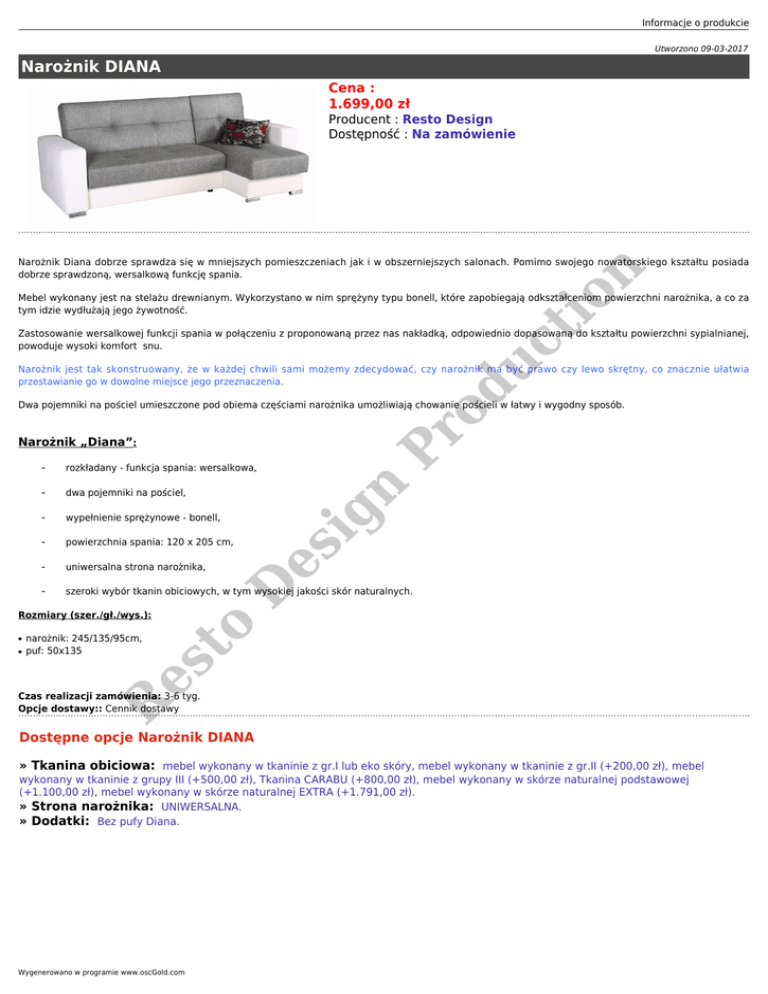 Informacje o produkcie Utworzono 09-03-2017 Narożnik DIANA Cena : 1.699,00 zł Producent : Resto Design Dostępność : Na zamówienie Pr od uc ti o n Narożnik Diana dobrze sprawdza się w mniejszych pomieszczeniach jak i w obszerniejszych salonach. Pomimo swojego nowatorskiego kształtu posiada dobrze sprawdzoną, wersalkową funkcję spania. Mebel wykonany jest na stelażu drewnianym. Wykorzystano w nim sprężyny typu bonell, które zapobiegają odkształceniom powierzchni narożnika, a co za tym idzie wydłużają jego żywotność. Zastosowanie wersalkowej funkcji spania w połączeniu z proponowaną przez nas nakładką, odpowiednio dopasowaną do kształtu powierzchni sypialnianej, powoduje wysoki komfort snu. Narożnik jest tak skonstruowany, że w każdej chwili sami możemy zdecydować, czy narożnik ma być prawo czy lewo skrętny, co znacznie ułatwia przestawianie go w dowolne miejsce jego przeznaczenia. Dwa pojemniki na pościel umieszczone pod obiema częściami narożnika umożliwiają chowanie pościeli w łatwy i wygodny sposób. Narożnik „Diana”: rozkładany - funkcja spania: wersalkowa, - dwa pojemniki na pościel, - wypełnienie sprężynowe - bonell, - powierzchnia spania: 120 x 205 cm, - uniwersalna strona narożnika, - szeroki wybór tkanin obiciowych, w tym wysokiej jakości skór naturalnych. ● narożnik: 245/135/95cm, puf: 50x135 D es es t ● o Rozmiary (szer./gł./wys.): ig n - R Czas realizacji zamówienia: 3-6 tyg. Opcje dostawy:: Cennik dostawy Dostępne opcje Narożnik DIANA » Tkanina obiciowa: mebel wykonany w tkaninie z gr.I lub eko skóry, mebel wykonany w tkaninie z gr.II (+200,00 zł), mebel wykonany w tkaninie z grupy III (+500,00 zł), Tkanina CARABU (+800,00 zł), mebel wykonany w skórze naturalnej podstawowej (+1.100,00 zł), mebel wykonany w skórze naturalnej EXTRA (+1.791,00 zł). » Strona narożnika: UNIWERSALNA. » Dodatki: Bez pufy Diana. Wygenerowano w programie www.oscGold.com