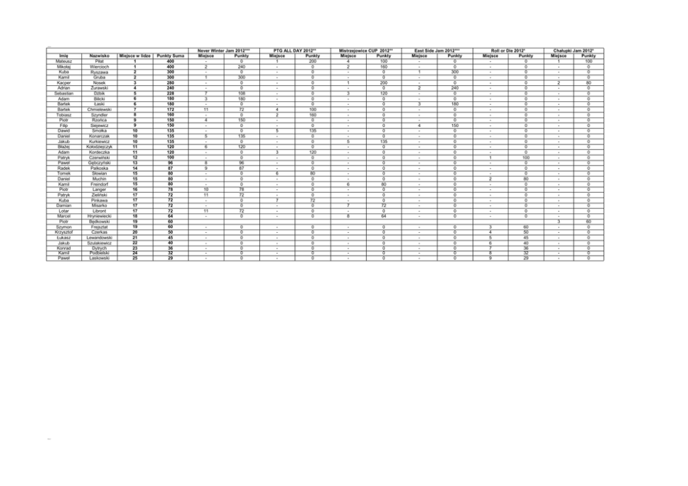 Arkusz1 Imię Mateusz Mikołaj Kuba Kamil Kacper Adrian Sebastian Adam Bartek Bartek Tobiasz Piotr Filip Dawid Daniel Jakub Błażej Adam Patryk Paweł Radek Tomek Daniel Kamil Piotr Patryk Kuba Damian Lotar Marcel Piotr Szymon Krzysztof Łukasz Jakub Konrad Kamil Paweł Strona 1 Nazwisko Piłat Wiercioch Ryszawa Gruba Nosek Żurawski Dżbik Bilicki Łaski Chmielewski Szyndler Rzońca Siejewicz Smołka Konarczak Kurkiewicz Kołodziejczyk Kordeczka Czerwiński Gębczyński Palkoska Słowian Muchin Freindorf Langer Zieliński Pinkawa Misarko Libront Hryniewiecki Będkowski Frejsztat Czerkas Lewandowski Szulakiewicz Dytrych Podbielski Laskowski Miejsce w lidze 1 1 2 2 3 4 5 6 6 7 8 9 9 10 10 10 11 11 12 13 14 15 15 15 16 17 17 17 17 18 19 19 20 21 22 23 24 25 Punkty Suma 400 400 300 300 280 240 228 180 180 172 160 150 150 135 135 135 120 120 100 96 87 80 80 80 78 72 72 72 72 64 60 60 50 45 40 36 32 29 Never Winter Jam 2012*** Miejsce Punkty 0 2 240 0 1 300 0 0 7 108 3 180 0 11 72 0 4 150 0 0 5 135 0 6 120 0 0 8 96 9 87 0 0 0 10 78 11 72 0 0 11 72 0 - 0 0 0 0 0 0 0 PTG ALL DAY 2012** Miejsce Punkty 1 200 0 0 0 0 0 0 0 0 4 100 2 160 0 0 5 135 0 0 0 3 120 0 0 0 6 80 0 0 0 0 7 72 0 0 0 - 0 0 0 0 0 0 0 Mistrzejowice CUP 2012** Miejsce Punkty 4 100 2 160 0 0 1 200 0 3 120 0 0 0 0 0 0 0 0 5 135 0 0 0 0 0 0 0 6 80 0 0 0 7 72 0 8 64 - 0 0 0 0 0 0 0 East Side Jam 2012*** Miejsce Punkty 0 0 1 300 0 0 2 240 0 0 3 180 0 0 0 4 150 0 0 0 0 0 0 0 0 0 0 0 0 0 0 0 0 0 - 0 0 0 0 0 0 0 Roll or Die 2012* Miejsce Punkty 0 0 0 0 0 0 0 0 0 0 0 0 0 0 0 0 0 0 1 100 0 0 0 2 80 0 0 0 0 0 0 0 3 4 5 6 7 8 9 60 50 45 40 36 32 29 Chałupki Jam 2012* Miejsce Punkty 1 100 0 0 0 2 80 0 0 0 0 0 0 0 0 0 0 0 0 0 0 0 0 0 0 0 0 0 0 0 0 0 3 60 0 0 0 0 0 0 0