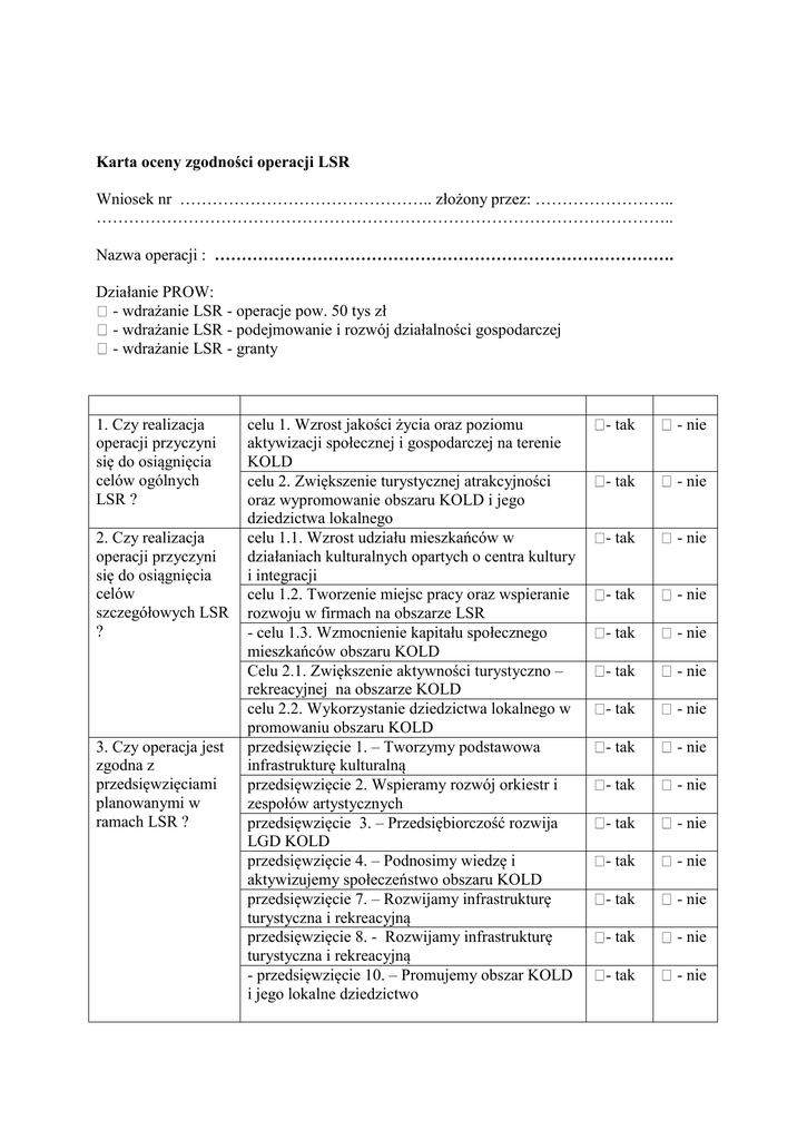 Karta oceny zgodności operacji LSR Wniosek nr ……………………………………….. złożony przez: …………………….. …………………………………………………………………………………………….. Nazwa operacji : …………………………………………………………………………. Działanie PROW: - wdrażanie LSR - operacje pow. 50 tys zł - wdrażanie LSR - podejmowanie i rozwój działalności gospodarczej - wdrażanie LSR - granty 1. Czy realizacja operacji przyczyni się do osiągnięcia celów ogólnych LSR ? 2. Czy realizacja operacji przyczyni się do osiągnięcia celów szczegółowych LSR ? 3. Czy operacja jest zgodna z przedsięwzięciami planowanymi w ramach LSR ? celu 1. Wzrost jakości życia oraz poziomu aktywizacji społecznej i gospodarczej na terenie KOLD celu 2. Zwiększenie turystycznej atrakcyjności oraz wypromowanie obszaru KOLD i jego dziedzictwa lokalnego celu 1.1. Wzrost udziału mieszkańców w działaniach kulturalnych opartych o centra kultury i integracji celu 1.2. Tworzenie miejsc pracy oraz wspieranie rozwoju w firmach na obszarze LSR - celu 1.3. Wzmocnienie kapitału społecznego mieszkańców obszaru KOLD Celu 2.1. Zwiększenie aktywności turystyczno – rekreacyjnej na obszarze KOLD celu 2.2. Wykorzystanie dziedzictwa lokalnego w promowaniu obszaru KOLD przedsięwzięcie 1. – Tworzymy podstawowa infrastrukturę kulturalną przedsięwzięcie 2. Wspieramy rozwój orkiestr i zespołów artystycznych przedsięwzięcie 3. – Przedsiębiorczość rozwija LGD KOLD przedsięwzięcie 4. – Podnosimy wiedzę i aktywizujemy społeczeństwo obszaru KOLD przedsięwzięcie 7. – Rozwijamy infrastrukturę turystyczna i rekreacyjną przedsięwzięcie 8. - Rozwijamy infrastrukturę turystyczna i rekreacyjną - przedsięwzięcie 10. – Promujemy obszar KOLD i jego lokalne dziedzictwo - tak - nie - tak - nie - tak - nie - tak - nie - tak - nie - tak - nie - tak - nie - tak - nie - tak - nie - tak - nie - tak - nie - tak - nie - tak - nie - tak - nie Uzasadnienie zgodności operacji z przedsięwzięciami planowanymi w ramach LSR ( w uzasadnieniu wykazać, że ocenianą operację można uznać za operację rekomendowaną w ramach LSR) : …………………………………………………………………………………. …………………………………………………………………………………………………. ………………………………………………………………………………………………….. …………………………………………………………………………………………………. …………………………………………………………………………………………………. …………………………………………………………………………………………………. Głosuję za uznaniem/ nie uznaniem *operacji za zgodną z LSR …………………… ………………………………………… …………………………….. Data wypełnienia Imię i nazwisko członka Rady podpis członka Rady LOKALNE KRYTERIA WYBORU wdrażanie LSR - operacje pow. 50 tys. zł Treść 1. Wnioskodawca 2. Innowacyjność projektu odpowiedz a. złożył wszystkie wymagane załączniki związane z kompletnością wniosku celem jak najszybszej i prawidłowej realizacji projektu b. nie złożył wszystkich wymaganych załączników a. jest innowacyjny o charakterze eksperymentalnym, nowatorskim w nawiązaniu do lokalnych tradycji i zasobów lokalnych oraz pozytywnie oddziałuje na ochronę środowiska i przeciwdziała zmianom klimatycznym oraz pozytywnie oddziałuje na zwalczanie ubóstwa i włączenie społeczne b. jest innowacyjny o charakterze eksperymentalnym, nowatorskim w nawiązaniu do lokalnych tradycji i zasobów lokalnych oraz : pozytywnie oddziałuje na ochronę środowiska i przeciwdziała zmianom klimatycznym lub pozytywnie oddziałuje na zwalczanie ubóstwa i włączenie społeczne c. jest innowacyjny o charakterze eksperymentalnym, nowatorskim w nawiązaniu do lokalnych tradycji i zasobów lokalnych d. nie jest innowacyjny Zakres punktów 2 pkt. Przyznana ocena 0 pkt. 3 pkt. 2 pkt. 1 pkt. 0 pkt. Uzasadnienie: ………………………………………………………………………………………………… ………………………………………………………………………………………………… ……………………………………………………………………………………………….. 3. Operacja zakłada integrację środowiska lokalnego a. Tak 2 pkt. W operacji zaangażowana będzie społeczność lokalna ( konsultacje , spotkania) od etapu tworzenia projektu w tym osoby spoza członków Wnioskodawcy b. Nie 0 pkt. W operacji nie są angażowane osoby spoza Wnioskodawcy Uzasadnienie: ………………………………………………………………………………………………… ………………………………………………………………………………………………… ……………………………………………………………………………………………….. 4. Wnioskodawca wziął udział w szkoleniu LGD KOLD przygotowującym do danego naboru wniosków 5. Realizacja operacji przyniesie następujące efekty dla lokalnej społeczności 6. Wnioskodawca oświadczył, że oznaczy zrealizowaną inwestycję tabliczką LGD KOLD 7. Celem części inwestycji objętej wnioskiem jest ochrona środowiska i przeciwdziałanie zmianom klimatycznym 8. W przypadku operacji dotyczących niekomercyjnej i ogólnodostępnej infrastruktury (rekreacyjnej, turystycznej lub kulturalnej) miejscowość, w której realizowana jest operacja zamieszkuje do 5 000 mieszkańców a. Tak Preferowane projekty korzystających ze szkoleń organizowanych przez LGD cele prawidłowego zapewnienia przygotowania 