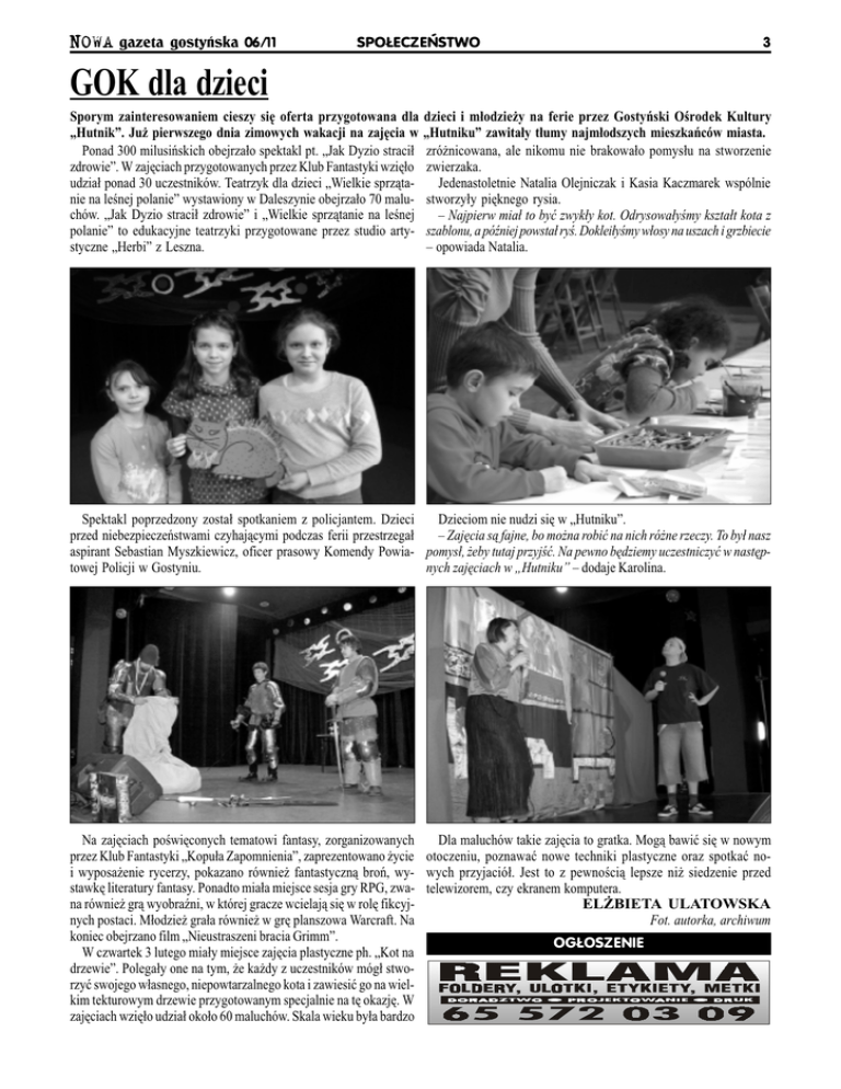 NOWA gazeta gostyñska 06/11 SPO£ECZEÑSTWO 3 GOK dla dzieci Sporym zainteresowaniem cieszy siê oferta przygotowana dla dzieci i m³odzie¿y na ferie przez Gostyñski Orodek Kultury Hutnik. Ju¿ pierwszego dnia zimowych wakacji na zajêcia w Hutniku zawita³y t³umy najm³odszych mieszkañców miasta. Ponad 300 milusiñskich obejrza³o spektakl pt. Jak Dyzio straci³ zró¿nicowana, ale nikomu nie brakowa³o pomys³u na stworzenie zdrowie. W zajêciach przygotowanych przez Klub Fantastyki wziê³o zwierzaka. udzia³ ponad 30 uczestników. Teatrzyk dla dzieci Wielkie sprz¹taJedenastoletnie Natalia Olejniczak i Kasia Kaczmarek wspólnie nie na lenej polanie wystawiony w Daleszynie obejrza³o 70 malu- stworzy³y piêknego rysia. chów. Jak Dyzio straci³ zdrowie i Wielkie sprz¹tanie na lenej Najpierw mia³ to byæ zwyk³y kot. Odrysowa³ymy kszta³t kota z polanie to edukacyjne teatrzyki przygotowane przez studio arty- szablonu, a póniej powsta³ ry. Doklei³ymy w³osy na uszach i grzbiecie styczne Herbi z Leszna. opowiada Natalia. Spektakl poprzedzony zosta³ spotkaniem z policjantem. Dzieci Dzieciom nie nudzi siê w Hutniku. przed niebezpieczeñstwami czyhaj¹cymi podczas ferii przestrzega³ Zajêcia s¹ fajne, bo mo¿na robiæ na nich ró¿ne rzeczy. To by³ nasz aspirant Sebastian Myszkiewicz, oficer prasowy Komendy Powia- pomys³, ¿eby tutaj przyjæ. Na pewno bêdziemy uczestniczyæ w nastêptowej Policji w Gostyniu. nych zajêciach w Hutniku dodaje Karolina. Na zajêciach powiêconych tematowi fantasy, zorganizowanych Dla maluchów takie zajêcia to gratka. Mog¹ bawiæ siê w nowym przez Klub Fantastyki Kopu³a Zapomnienia, zaprezentowano ¿ycie otoczeniu, poznawaæ nowe techniki plastyczne oraz spotkaæ noi wyposa¿enie rycerzy, pokazano równie¿ fantastyczn¹ broñ, wy- wych przyjació³. Jest to z pewnoci¹ lepsze ni¿ siedzenie przed stawkê literatury fantasy. Ponadto mia³a miejsce sesja gry RPG, zwa- telewizorem, czy ekranem komputera. EL¯BIETA ULATOWSKA na równie¿ gr¹ wyobrani, w której gracze wcielaj¹ siê w rolê fikcyjFot. autorka, archiwum nych postaci. M³odzie¿ gra³a równie¿ w grê planszowa Warcraft. Na koniec obejrzano film Nieustraszeni bracia Grimm. OG£OSZENIE W czwartek 3 lutego mia³y miejsce zajêcia plastyczne ph. Kot na drzewie. Polega³y one na tym, ¿e ka¿dy z uczestników móg³ stworzyæ swojego w³asnego, niepowtarzalnego kota i zawiesiæ go na wielkim tekturowym drzewie przygotowanym specjalnie na tê okazjê. W zajêciach wziê³o udzia³ oko³o 60 maluchów. Skala wieku by³a bardzo