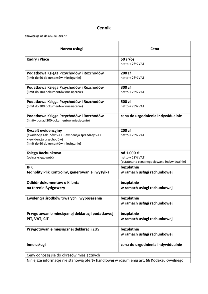 Cennik obowiązuje od dnia 01.01.2017 r. Nazwa usługi Kadry i Płace Cena 50 zł/os netto + 23% VAT Podatkowa Księga Przychodów i Rozchodów 200 zł (limit do 60 dokumentów miesięcznie) netto + 23% VAT Podatkowa Księga Przychodów i Rozchodów 300 zł (limit do 100 dokumentów miesięcznie) netto + 23% VAT Podatkowa Księga Przychodów i Rozchodów 500 zł (limit do 200 dokumentów miesięcznie) netto + 23% VAT Podatkowa Księga Przychodów i Rozchodów cena do uzgodnienia indywidualnie (limity ponad 200 dokumentów miesięcznie) Ryczałt ewidencyjny 200 zł (ewidencja zakupów VAT + ewidencja sprzedaży VAT + ewidencja przychodów) (limit do 60 dokumentów miesięcznie) netto + 23% VAT Księga Rachunkowa od 1.000 zł (pełna księgowość) netto + 23% VAT (ostateczna cena negocjowana indywidualnie) JPK Jednolity Plik Kontrolny, generowanie i wysyłka bezpłatnie w ramach usługi rachunkowej Odbiór dokumentów u Klienta na terenie Bydgoszczy bezpłatnie w ramach usługi rachunkowej Ewidencja środków trwałych i wyposażenia bezpłatnie w ramach usługi rachunkowej Przygotowanie miesięcznej deklaracji podatkowej PIT, VAT, CIT bezpłatnie w ramach usługi rachunkowej Przygotowanie miesięcznej deklaracji ZUS bezpłatnie w ramach usługi rachunkowej Inne usługi cena do uzgodnienia indywidualnie Ceny odnoszą się do okresów miesięcznych Niniejsze informacje nie stanowią oferty handlowej w rozumieniu art. 66 Kodeksu cywilnego