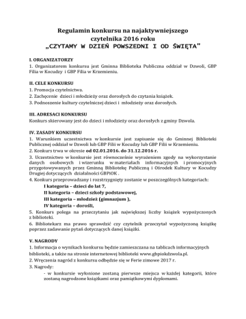 Regulamin konkursu na najaktywniejszego czytelnika 2016 roku „CZYTAMY W DZIEŃ POWSZEDNI I OD ŚWIĘTA” I. ORGANIZATORZY 1. Organizatorem konkursu jest Gminna Biblioteka Publiczna oddział w Dzwoli, GBP Filia w Kocudzy i GBP Filia w Krzemieniu. II. CELE KONKURSU 1. Promocja czytelnictwa. 2. Zachęcenie dzieci i młodzieży oraz dorosłych do czytania książek. 3. Podnoszenie kultury czytelniczej dzieci i młodzieży oraz dorosłych. III. ADRESACI KONKURSU Konkurs skierowany jest do dzieci i młodzieży oraz dorosłych z gminy Dzwola. IV. ZASADY KONKURSU 1. Warunkiem uczestnictwa w konkursie jest zapisanie się do Gminnej Biblioteki Publicznej oddział w Dzwoli lub GBP Filii w Kocudzy lub GBP Filii w Krzemieniu. 2. Konkurs trwa w okresie od 02.01.2016. do 31.12.2016 r. 3. Uczestnictwo w konkursie jest równocześnie wyrażeniem zgody na wykorzystanie danych osobowych i wizerunku w materiałach informacyjnych i promocyjnych przygotowywanych przez Gminną Bibliotekę Publiczną i Ośrodek Kultury w Kocudzy Drugiej dotyczących działalności GBPiOK . 4. Konkurs przeprowadzany i rozstrzygnięty zostanie w poszczególnych kategoriach: I kategoria – dzieci do lat 7, II kategoria – dzieci szkoły podstawowej, III kategoria – młodzież (gimnazjum ), IV kategoria – dorośli, 5. Konkurs polega na przeczytaniu jak największej liczby książek wypożyczonych z biblioteki. 6. Bibliotekarz ma prawo sprawdzić czy czytelnik przeczytał wypożyczoną książkę poprzez zadawanie pytań dotyczących danej książki. V. NAGRODY 1. Informacja o wynikach konkursu będzie zamieszczana na tablicach informacyjnych biblioteki, a także na stronie internetowej biblioteki www.gbpiokdzwola.pl. 2. Wręczenia nagród z konkursu odbędzie się w Ferie zimowe 2017 r. 3. Nagrody: · w konkursie wyłonione zostaną pierwsze miejsca w każdej kategorii, które zostaną nagrodzone książkami oraz pamiątkowymi dyplomami. VI. POSTANOWIENIA KOŃCOWE 1. Wyniki konkursu zostaną ogłoszone na stronie internetowej Gminnej Biblioteki Publicznej i Ośrodka Kultury w Kocudzy Drugiej . 2. W kwestiach spornych ostateczna decyzja należy do organizatora. 3. Informacji o konkursie udziela Gminna Biblioteka Publiczna oddział w Dzwoli oraz Filie Biblioteczne w Kocudzy i Krzemieniu.