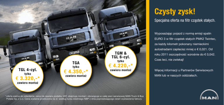 Czysty zysk! Specjalna oferta na filtr cząstek stałych. Wyposażając pojazd z normą emisji spalin EURO 3 w filtr cząstek stałych PMK2 Twintec, za każdy kilometr pokonany niemieckimi TGM & TGL 6-cyl. TGA TGL 4-cyl. tylko € 3.320,-* tylko € 4.350,-* tylko € 4.220,-* zawiera montaż zawiera montaż zawiera montaż *oferta ważna do odwołania, cena nie zawiera podatku VAT, obejmuje montaż i obowiązuje w całej sieci serwisowej MAN Truck & Bus Polska Sp. z o.o. Cena zostanie przeliczona na zł. według kursu średniego NBP z dnia poprzedzającego dzień wystawienia faktury. autostradami zapłacisz mniej o € 0,021. Od roku 2011 oszczędność wzrośnie do € 0,042. Czas leci, nie zwlekaj! Więcej informacji u Partnerów Serwisowych MAN lub w naszych oddziałach. www.man-mn.pl Ekologiczne oszczędności • dzięki zainstalowaniu filtra cząstek stałych PMK2 Twintec, pojazd z normą emisji spalin EURO 3 jest klasyfikowany do opłat drogowych za przejazd niemieckimi autostradami Toll Collect tak jak pojazd z normą emisji spalin EURO 4, • prawo do umieszczenia na przedniej szybie zielonej naklejki, możliwość wjazdu do zielonych stref, • podniesienie wartości pojazdu, • elementy składowe wykonane ze stali nierdzewnej eliminują ewentualny koszt wymiany tłumika, • szybka i prosta instalacja, • jazda przyjazna środowisku, • brak kosztów utrzymania i serwisowania. Więcej informacji u Partnerów Serwisowych MAN lub w jednym z naszych oddziałów: MAN Truck & Bus Center Warszawa, Al. Katowicka 9, Wolica, 05-830 Nadarzyn, tel.: +48 22 738 69 50 / 51 / 53 MAN Truck & Bus Center Poznań, Sady, ul. Poznańska 4A, 62-080 Tarnowo Podgórne, tel.: +48 61 816 75 21 / 22 / 26 Filtr cząstek stałych PMK2 Twintec w przekroju MAN Truck & Bus Center Katowice, ul. Handlowa 1, 41-250 Czeladź, tel.: +48 32 296 09 06 / 07 / 10