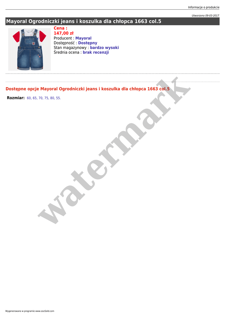 Informacje o produkcie Utworzono 09-03-2017 Mayoral Ogrodniczki jeans i koszulka dla chłopca 1663 col.5 Cena : 147,00 zł Producent : Mayoral Dostępność : Dostępny Stan magazynowy : bardzo wysoki Średnia ocena : brak recenzji w at Rozmiar: 60, 65, 70, 75, 80, 55. er m ar k Dostępne opcje Mayoral Ogrodniczki jeans i koszulka dla chłopca 1663 col.5 Wygenerowano w programie www.oscGold.com