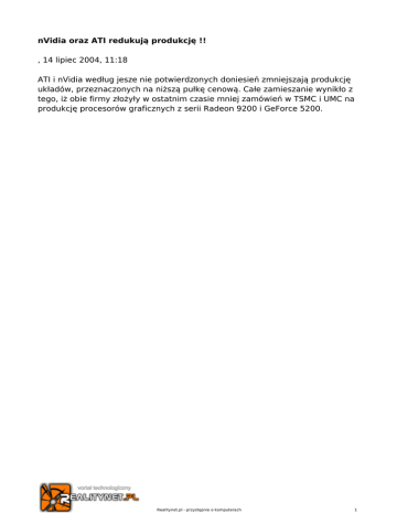 nVidia oraz ATI redukują produkcję !! , 14 lipiec 2004, 11:18 ATI i nVidia według jesze nie potwierdzonych doniesień zmniejszają produkcję układów, przeznaczonych na niższą pułkę cenową. Całe zamieszanie wynikło z tego, iż obie firmy złożyły w ostatnim czasie mniej zamówień w TSMC i UMC na produkcję procesorów graficznych z serii Radeon 9200 i GeForce 5200. Realitynet.pl - przystępnie o komputerach 1