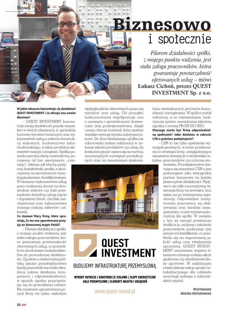 Biznes Biznesowo i społecznie Filarem działalności spółki, z mojego punktu widzenia, jest stała załoga pracowników, która gwarantuje powtarzalność oferowanych usług – mówi Łukasz Cichoń, prezes QUEST INVESTMENT Sp. z o.o. W jakim obszarze koncentruje się działalność QUEST INVESTMENT i co oferuje ona swoim klientom? – QUEST INVESTMENT koncentruje swoją działalność przede wszystkim w dwóch obszarach, tj. sprzedaży hurtowej wyrobów hutniczych oraz wykonawstwie usług z zakresu konstrukcji stalowych, budownictwa infrastrukturalnego, a także produkcji elementów maszyn i urządzeń. Spółka posiada szeroką ofertę materiałową, począwszy od tzw. asortymentu „czarnego”, takiego jak blachy, pręty, rury, kształtowniki, profile, a skończywszy na asortymencie wysokogatunkowym, kwalifikowanym. W obszarze wykonawstwa usług poza realizacją zleceń na konstrukcje stalowe czy hale przemysłowe świadczy usługi cięcia i wypalania blach, obróbki mechanicznej oraz wykonawstwa różnego rodzaju odlewów i odkuwek. Co stanowi filary firmy, które sprawiają, że ma ona ugruntowaną pozycję na biznesowej mapie Polski? – Filarem działalności spółki, z mojego punktu widzenia, jest stała załoga pracowników, która gwarantuje powtarzalność oferowanych usług, co pozwoliło na zbudowanie zaufania klientów do prowadzonej działalności. Zgodnie z realizowaną polityką jakości przedsiębiorstwa każdy pracownik ma ściśle określony zakres działania, kompetencji i odpowiedzialności, w sposób zgodny przyczyniając się do powodzenia całości. Na uzyskanie ugruntowanej pozycji firmy na rynku stalowym 56 VIP wpłynęła jakość oferowanych przez nią wyrobów oraz usług. Od początku funkcjonowania współpracuje ona z uznanymi i sprawdzonymi dostawcami oraz podwykonawcami, dzięki czemu oferuje materiał, który spełnia wszelkie wymogi wyrobu najwyższej jakości. Do dnia dzisiejszego spółka nie odnotowała żadnej reklamacji w zakresie jakości produktów czy usług. Jej konkurencyjność opiera się na rozwoju innowacyjnych rozwiązań produkcyjnych oraz na nieustannym doskona- leniu wewnętrznych procesów komunikacji i zarządzania. W spółce został wdrożony, a co najważniejsze, funkcjonuje system zarządzania jakością zgodny z normą PN-EN ISO 9001. Dlaczego warto być firmą odpowiedzialną społecznie? Jakie działania w zakresie CSR-u państwo podejmujecie? – CSR to nie tylko spełnienie wymagań prawnych, w moim przekonaniu to strategia firmy, uwzględniająca nieustanne inwestycje w środowisko lokalne, pracowników czy ochronę środowiska. Przedsiębiorstwo kierujące się zasadami CSR-u jest postrzegane jako wiarygodny partner biznesowy na każdej płaszczyźnie działalności. Wpływa to nie tylko na pozytywny wizerunek firmy na zewnątrz, lecz także na jej wewnętrzną organizację. Odpowiednio zmotywowani pracownicy są efektywniejsi oraz bardziej zaangażowani, co jest wymierną korzyścią dla spółki. W związku z tym jej zarząd przekazuje środki m.in. na kursy i szkolenia pracowników, podnosząc tym samym ich kwalifikacje, co przekłada się na wspomnianą jakość usług oraz zwiększenie sprzedaży. QUEST INVESTMENT nieustannie wspiera finansowo różnego rodzaju akcje społeczne czy młodzieżowe kluby sportowe. W najbliższym czasie planuje zakup sprzętu rehabilitacyjnego dla oddziału neurologii jednego z zabrzańskich szpitali. Rozmawiała Monika Michałowska