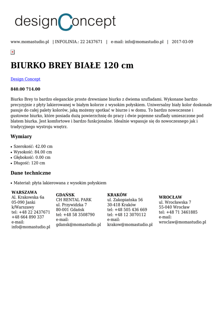 www.momastudio.pl | INFOLINIA.: 22 2437671 | e-mail: [email protected] | 2017-03-09 BIURKO BREY BIAŁE 120 cm Design Concept 840.00 714.00 Biurko Brey to bardzo eleganckie proste drewniane biurko z dwiema szufladami. Wykonane bardzo precyzyjnie z płyty lakierowanej w białym kolorze z wysokim połyskiem. Uniwersalny biały kolor doskonale pasuje do całej palety kolorów, jaką możemy spotkać w biurze i w domu. To bardzo nowoczesne i gustowne biurko, które posiada dużą powierzchnię do pracy i dwie pojemne szuflady umieszczone pod blatem biurka. Jest komfortowe i bardzo funkcjonalne. Idealnie wspasuje się do nowoczesnego jak i tradycyjnego wystroju wnętrz. Wymiary ● ● ● ● Szerokość: 42.00 cm Wysokość: 84.00 cm Głębokość: 0.00 cm Długość: 120 cm Dane techniczne ● Materiał: płyta lakierowana z wysokim połyskiem WARSZAWA Al. Krakowska 6a 05-090 Janki k/Warszawy tel: +48 22 2437671 +48 664 890 337 e-mail: [email protected] GDAŃSK CH RENTAL PARK ul. Przywidzka 7 80-001 Gdańsk tel: +48 58 3508790 e-mail: [email protected] KRAKÓW ul. Zakopiańska 56 30-418 Kraków tel: +48 505 436 669 tel: +48 12 3070112 e-mail: [email protected] WROCŁAW ul. Wrocławska 7 55-040 Wrocław tel: +48 71 3461885 e-mail: [email protected]