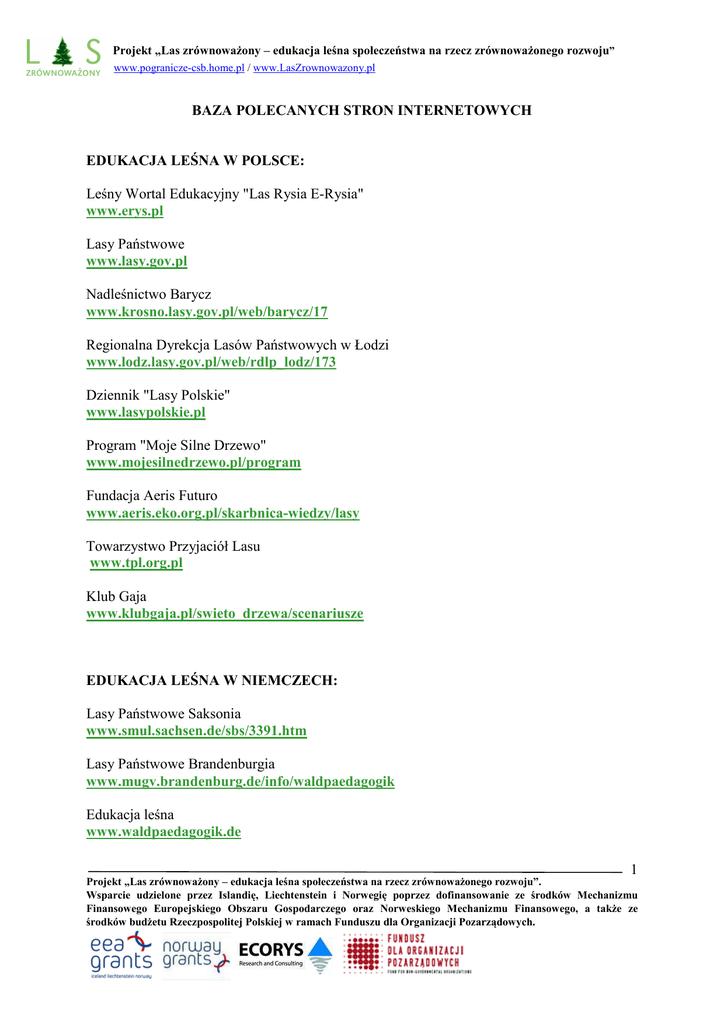 Projekt „Las zrównoważony – edukacja leśna społeczeństwa na rzecz zrównoważonego rozwoju” www.pogranicze-csb.home.pl / www.LasZrownowazony.pl BAZA POLECANYCH STRON INTERNETOWYCH EDUKACJA LEŚNA W POLSCE: Leśny Wortal Edukacyjny "Las Rysia E-Rysia" www.erys.pl Lasy Państwowe www.lasy.gov.pl Nadleśnictwo Barycz www.krosno.lasy.gov.pl/web/barycz/17 Regionalna Dyrekcja Lasów Państwowych w Łodzi www.lodz.lasy.gov.pl/web/rdlp_lodz/173 Dziennik "Lasy Polskie" www.lasypolskie.pl Program "Moje Silne Drzewo" www.mojesilnedrzewo.pl/program Fundacja Aeris Futuro www.aeris.eko.org.pl/skarbnica-wiedzy/lasy Towarzystwo Przyjaciół Lasu www.tpl.org.pl Klub Gaja www.klubgaja.pl/swieto_drzewa/scenariusze EDUKACJA LEŚNA W NIEMCZECH: Lasy Państwowe Saksonia www.smul.sachsen.de/sbs/3391.htm Lasy Państwowe Brandenburgia www.mugv.brandenburg.de/info/waldpaedagogik Edukacja leśna www.waldpaedagogik.de 1 Projekt „Las zrównoważony – edukacja leśna społeczeństwa na rzecz zrównoważonego rozwoju”. Wsparcie udzielone przez Islandię, Liechtenstein i Norwegię poprzez dofinansowanie ze środków Mechanizmu Finansowego Europejskiego Obszaru Gospodarczego oraz Norweskiego Mechanizmu Finansowego, a także ze środków budżetu Rzeczpospolitej Polskiej w ramach Funduszu dla Organizacji Pozarządowych. Projekt „Las zrównoważony – edukacja leśna społeczeństwa na rzecz zrównoważonego rozwoju” www.pogranicze-csb.home.pl / www.LasZrownowazony.pl EDUKACJA LEŚNA W CZECHACH: Leśny Portal Edukacyjny www.mezistromy.cz Lasy Państwowe Republiki Czeskiej www.lesycr.cz Projekt "Las w szkole - szkoła w lesie" www.lesveskole.terezanet.cz EDUKACJA EKOLOGICZNA - INNE POLECANE STRONY: Program edukacji ekologicznej "Czym skorupka za młodu nasiąknie" www.czymskorupka.pl Portal edukacji ekologicznej www.zielonalekcja.pl Wiedza o ochronie przyrody, przyrodzie i środowisku www.wiedza.ekologia.pl Ekoedukacja - baza materiałów do edukacji ekologicznej www.ekoedukacja.pl Ekopedagog - serwis poświęcony edukacji ekologicznej www.ekopedagog.net Ośrodek działań ekologicznych "Źródła" www.zrodla.org Ministerstwo Środowiska - strona dla dzieci www.dzieci.mos.gov.pl Stan: 31.07.2010 Opracowanie własne P-ZFST „Pogranicze” na podstawie danych internetowych. 2 Projekt „Las zrównoważony – edukacja leśna społeczeństwa na rzecz zrównoważonego rozwoju”. Wsparcie udzielone przez Islandię, Liechtenstein i Norwegię poprzez dofinansowanie ze środków Mechanizmu Finansowego Europejskiego Obszaru Gospodarczego oraz Norweskiego Mechanizmu Finansowego, a także ze środków budżetu Rzeczpospolitej Polskiej w ramach Funduszu dla Organizacji Pozarządowych.