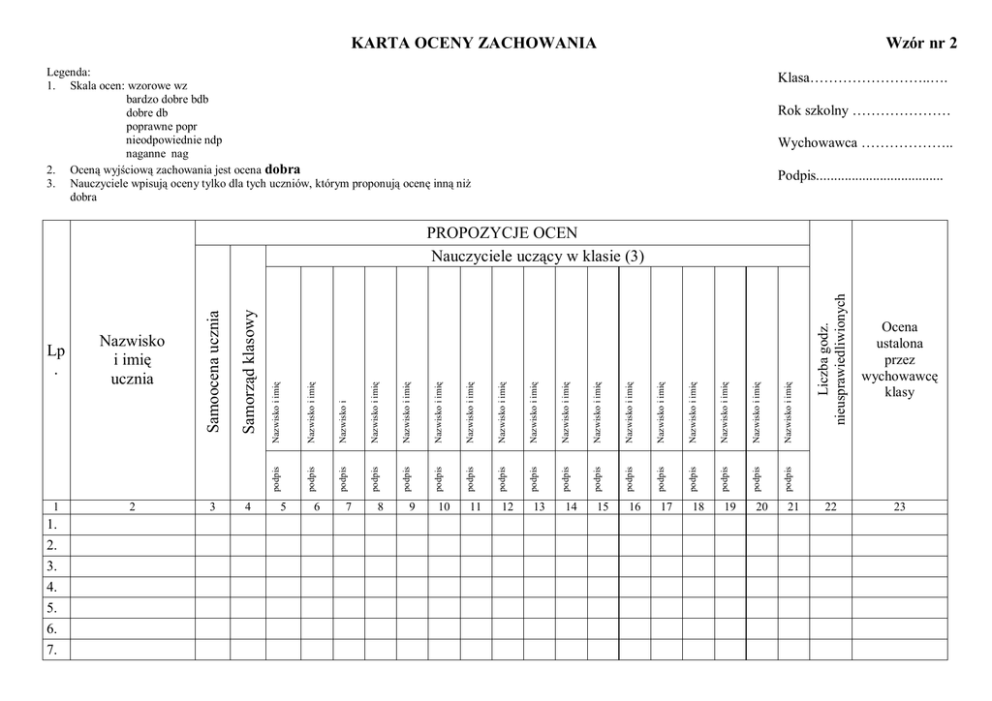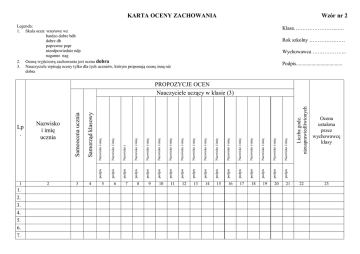 KARTA OCENY ZACHOWANIA Wzór nr 2 Legenda: 1. Skala ocen: wzorowe wz bardzo dobre bdb dobre db poprawne popr nieodpowiednie ndp naganne nag 2. Oceną wyjściową zachowania jest ocena dobra 3. Nauczyciele wpisują oceny tylko dla tych uczniów, którym proponują ocenę inną niż dobra Klasa……………………..…. Rok szkolny ………………… Wychowawca ……………….. Podpis.................................... 1. 2. 3. 4. 5. 6. 7. Nazwisko i Nazwisko i imię Nazwisko i imię Nazwisko i imię Nazwisko i imię Nazwisko i imię Nazwisko i imię Nazwisko i imię Nazwisko i imię Nazwisko i imię Nazwisko i imię Nazwisko i imię Nazwisko i imię Nazwisko i imię Nazwisko i imię podpis podpis podpis podpis podpis podpis podpis podpis podpis podpis podpis podpis podpis podpis podpis 5 6 7 8 9 10 11 12 13 14 15 16 17 18 19 20 21 Liczba godz. nieusprawiedliwionych Nazwisko i imię 4 podpis 3 Nazwisko i imię 2 podpis 1 Samorząd klasowy Lp . Nazwisko i imię ucznia Samoocena ucznia PROPOZYCJE OCEN Nauczyciele uczący w klasie (3) Ocena ustalona przez wychowawcę klasy 22 23 1 8. 9. 10. 11. 12. 13. 14. 15. 16. 17. 18. 19. 20. 21. 22. 23. 24. 25. 26. 27. 28. 29. 30. 31. 32. 33. 34. 35. 2 3 4 5 6 7 8 9 10 11 12 13 14 15 16 17 18 19 20 21 22 23