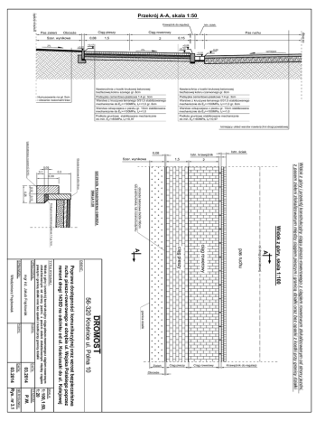 - 0,02 Nawierzchnia z kostki brukowej betonowej bezfazowej koloru czerwonego gr. 8cm Podsypka cementowo-piaskowa 1:4 gr. 3cm Warstwa z kruszywa amanego 0/31,5 stabilizowanego mechanicznie do E2 >=100MPa, Is>=1,0 gr. 8cm Podsypka cementowo-piaskowa 1:4 gr. 3cm Warstwa z kruszywa amanego 0/31,5 stabilizowanego mechanicznie do E2 >=100MPa, Is>=1,0 gr. 8cm Warstwa ods czajaca z piasku gr. 10cm stabilizowana mechanicznie do E2 >=100MPa, Is>=1,0 Warstwa ods czajaca z piasku gr. 10cm stabilizowana mechanicznie do E2>=100MPa, Is>=1,0 Pod e gruntowe stabilizowane mechanicznie do min. E2 >=80MPa, Is>=0,97 Pod e gruntowe stabilizowane mechanicznie do min. E2 >=80MPa, Is>=0,97 granica dzia ki Widok z góry i przekrój konstrukcyjny ci gu pieszo-rowerowego z ci giem rowerowym zlokalizowanym od strony jezdni, z pasem zieleni zlokalizowanym mi dzy ci giem pieszym i granic dzia ki oraz bez opaski z kostki przy granicy dzia ki A o drogi powiatowej pas ruchu ci g pieszy A DROMOS T 56-320 Kro nice ul. Polna 10 W odzimierz Fr ckowiak SPRAWDZI : mgr in . Jakub Fr ckowiak OPRACOWA : PODPIS: PODPIS: 03.2014 DATA: 03.2014 DATA: Widok z góry i przekrój konstrukcyjny ci gu pieszo-rowerowego z ci giem rowerowym zlokalizowanym od strony jezdni, z pasem zieleni zlokalizowanym mi dzy ci giem pieszym i granic dzia ki oraz bez opaski z kostki przy granicy dzia ki TYTU RYSUNKU: Rys. nr 3.1 NR RYSUNKU: P.W. STADIUM: 1:100,1:50, 1:20 SKALA: Poprawa dost pno ci komunikacyjnej oraz wzrost bezpiecze stwa ruchu pieszo-rowerowego w obr bie ul. Wojska Polskiego poprzez remont drogi 1430D na odcinku od ul. Ko ciuszki do ul. Kolejowej OBIEKT: nik do regulacji Kraw Ci g rowerowy Ci g pieszy Ziele ci g rowerowy Podsypka cementowo-piaskowa 1:4 gr. 5cm Obrze e Widok z góry, skala 1:100 obrze e betonowe 8x30x100cm lub podmurówka, lub ciana budynku 0,12 0,25 0,13 SZCZEGÓ POSADOWIENIA OBRZE A SKALA 1:20 0,30 awa betonowa z oporem (C12/15) 0,05 Istn. ciek nik Istn. kraw 0,08 istniej ce 0,00 +0,08 +0,10 2% 2 1,5 Szer. wynikowa Obrze e betonowe 8x30x100cm 0,3 0,1 Nawierzchnia z kostki brukowej betonowej bezfazowej koloru szarego gr. 8cm Humusowanie na g . 5cm i obsianie nasionami traw o drogi 2 Pas ruchu Ci g rowerowy 1,5 0,08 Szer. wynikowa +0,17 +0,21 2% 0,15 Ci g pieszy Obrze e Pas zieleni Istn. ciek nik do regulacji Kraw granica dzia ki Przekrój A-A, skala 1:50 Istniej cy uk ad warstw nawierzchni drogi powiatowej