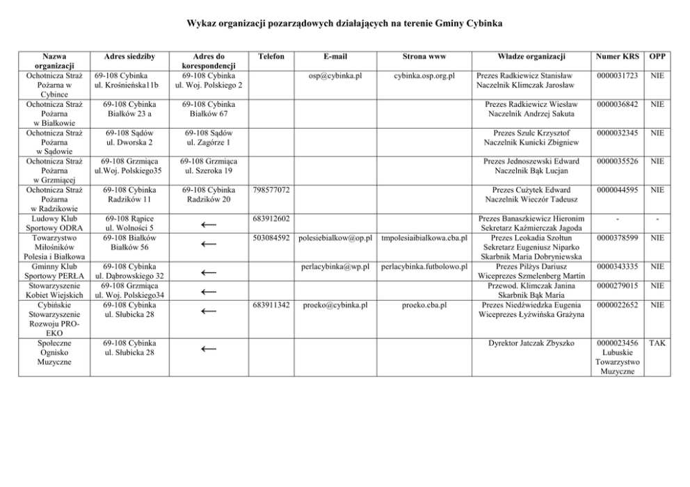 Wykaz organizacji pozarządowych działających na terenie Gminy