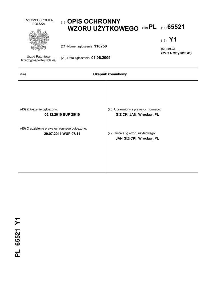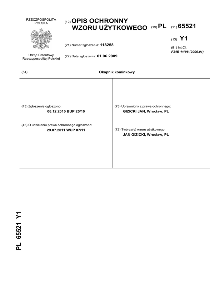 RZECZPOSPOLITA POLSKA (12) OPIS OCHRONNY WZORU UŻYTKOWEGO (19) PL (11) (13) (21) Numer zgłoszenia: 118258 Urząd Patentowy Rzeczypospolitej Polskiej Okapnik kominkowy (43) Zgłoszenie ogłoszono: 06.12.2010 BUP 25/10 (73) Uprawniony z prawa ochronnego: GIZICKI JAN, Wrocław, PL (45) O udzieleniu prawa ochronnego ogłoszono: 29.07.2011 WUP 07/11 (72) Twórca(y) wzoru użytkowego: JAN GIZICKI, Wrocław, PL PL 65521 Y1 Y1 (51) Int.Cl. F24B 1/198 (2006.01) (22) Data zgłoszenia: 01.06.2009 (54) 65521 2 PL 65 521 Y1 Opis wzoru Przedmiotem wzoru użytkowego jest okapnik kominkowy, stanowiący górny element kominków, zwłaszcza kominków z płaszczem wodnym, oraz pieców wolnostojących. Znane okapniki kominkowe, stanowiące osłonę przedniej oraz bocznych stron górnej części kominka w obszarze dystrybutora ciepłego powietrza i komory dekompresyjnej, wykonane są w postaci ścianek z izolowanej termicznie od wewnątrz wełną mineralną płyty gipsowo-kartonowej lub płyty krzemianowo-wapniowej albo ścianek murowanych z cegły, prefabrykatów z betonu komórkowego, kamienia lub kafli. Okapnik kominkowy według wzoru użytkowego, stanowiący osłonę przedniej i bocznych stron górnej części kominka w obszarze dystrybutora ciepłego powietrza i komory dekompresyjnej, składa się z dwóch usytuowanych względem siebie równolegle i oddalonych od siebie powierzchni osłon wykonanych z żaroodpornego płótna rozpiętego na sztywnym niepalnym stelażu, stalowym lub z włókna szklanego, z osłony wewnętrznej, którą stanowi dystrybutor ciepłego powietrza i komora dekompresyjna, oraz z abażurowej ozdobnej osłony zewnętrznej, pomiędzy którymi w istniejącej między tymi osłonami szczelinie schładzającej zainstalowane są podświetlające lampy. Okapnik kominkowy według wzoru użytkowego stanowi wyrób przemysłowy przygotowany w całości u producenta, a następnie dostarczony klientowi i w łatwy i szybki sposób u niego zmontowany, podczas gdy znane okapniki kominkowe są wykonywane w miejscu ich zainstalowania z materiałów budowlanych w ciągu znacznie dłuższego czasu, zwykle w ciągu kilku dni. Okapnik kominkowy według wzoru użytkowego może składać się z dwóch osłon, to znaczy z osłony wewnętrznej, którą stanowi dystrybutor ciepłego powietrza i komora dekompresyjna, oraz z abażurowej ozdobnej osłony zewnętrznej, albo może zawierać tylko jedną z tych osłon. Każda z nich może bowiem funkcjonować niezależnie od drugiej i stanowić odrębny wyrób dostarczany użytkownikowi kominka. Równie łatwy i szybki, jak montaż okapnika kominkowego według wzoru użytkowego, jest jego demontaż, co jest niezbędne w przypadku konieczności dokonania naprawy, czyszczenia lub przeprowadzenia konserwacji osłoniętych przez okapnik elementów wkładu kominkowego. W przypadku natomiast istnienia znanych okapników kominkowych przeprowadzenie tych czynności wymaga wyburzenia okapnika i potem ponownego jego zbudowania. Okapnik kominkowy według wzoru użytkowego jest znacznie tańszy od znanego okapnika. Znacznie niższe są bowiem koszty jego materiałów i robocizny. Przy jego budowie nie używa się szeregu materiałów i elementów stosowanych przy wykonawstwie znanych okapników, jak na przykład materiałów budowlanych, kratek wentylacyjnych czy szkodliwej dla środowiska człowieka izolacyjnej wełny mineralnej. Podświetlenie zewnętrznej abażurowej ozdobnej osłony daje w pomieszczeniu, w którym zbudowany jest kominek, przyjemne dla oka nastrojowe światło, wystarczające do oświetlenia pomieszczenia bez dodatkowych źródeł światła. Ponadto dystrybucja ciepłego powietrza w tym okapniku może być wspomagana wentylatorem typu ecofan zasilanym z termoogniwa, umieszczonym w okapniku, co umożliwione jest dzięki elastyczności jego osłon. Przedmiot wzoru użytkowego pokazany jest na rysunku, na którym fig. 1 przedstawia podłużny boczny przekrój kominka z zainstalowanym okapnikiem, a fig. 2 - przekrój poprzeczny kominka, zaznaczony na fig. 1 A - A. Jak pokazuje to rysunek, okapnik kominkowy stanowi osłonę przedniej i bocznych stron górnej części kominka w obszarze dystrybutora ciepłego powietrza 1 i dekompresyjnej komory 2 i składa się z dwóch usytuowanych względem siebie równolegle i oddalonych od siebie powierzchni osłon wykonanych z żaroodpornego płótna, rozpiętego na sztywnym niepalnym stelażu 3, stalowym lub z włókna szklanego, z wewnętrznej osłony 4, którą stanowi dystrybutor ciepłego powietrza 1 i dekompresyjna komora 2 oraz z abażurowej ozdobnej zewnętrznej osłony 5, pomiędzy którymi w istniejącej między nimi schładzającej szczelinie 6 zainstalowane są podświetlające lampy 7. Zastrzeżenie ochronne Okapnik kominkowy, stanowiący osłonę przedniej i bocznych stron górnej części kominka w obszarze dystrybutora ciepłego powietrza i dekompresyjnej komory, znamienny tym, że składa się z dwóch usytuowanych względem siebie równolegle i oddalonych od siebie powierzchni osłon, wykonanych z żaroodpornego płótna rozpiętego na sztywnym niepalnym stelażu (3), z wewnętrznej osłony (4), którą stanowi dystrybutor ciepłego powietrza (1) i dekompresyjna komora (2), oraz z abażurowej ozdobnej ze- PL 65 521 Y1 3 wnętrznej osłony (5), pomiędzy którymi w istniejącej między nimi schładzającej szczelinie (6) zainstalowane są podświetlające lampy (7). Rysunki 4 PL 65 521 Y1 Departament Wydawnictw UP RP