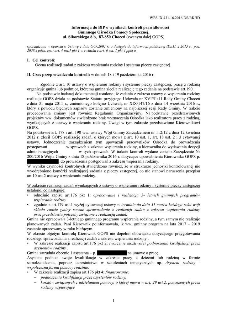 WPS.IX.431.16.2016.DS/RK/JD Informacja do BIP o wynikach kontroli prawidłowości Gminnego Ośrodka Pomocy Społecznej, ul. Sikorskiego 8 b, 87-850 Choceń (zwanym dalej GOPS) sporządzona w oparciu o Ustawę z dnia 6.09.2001 r. o dostępie do informacji publicznej (Dz.U. z 2015 r., poz. 2058 z późn. zm.) art. 4 ust.1 pkt 1 w związku z art. 6 ust. 1 pkt 4 ppkt a I. Cel kontroli: Ocena realizacji zadań z zakresu wspierania rodziny i systemu pieczy zastępczej. II. Czas przeprowadzenia kontroli: w dniach 18 i 19 października 2016 r. Zgodnie z art. 10 ustawy o wspieraniu rodziny i systemie pieczy zastępczej, pracę z rodziną organizuje gmina lub podmiot, któremu gmina zleciła realizację tego zadania na podstawie art.190. Na podstawie badanej dokumentacji ustalono, iż zadania z zakresu ustawy o wspieraniu rodziny realizuje GOPS działa na podstawie Statutu przyjętego Uchwałą nr XVI/51/11 Rady Gminy Choceń z dnia 31 maja 2011 r., zmienionego kolejno Uchwałą nr XIX/147/16 z dnia 14 września 2016 r., który z powodu błędnych zapisów zostanie zmieniony na najbliższej sesji Rady Gminy. W trakcie procedowania zmiany jest również Regulamin Organizacyjny. Na podstawie przedstawionych projektów ww. dokumentów stwierdzono brak wyznaczenia Ośrodka jako realizatora pracy z rodziną, wynikających z ustawy o wspieraniu rodziny. Uwagi w tym zakresie przedstawiono Kierownikowi GOPS. Na podstawie art. 178 i art. 190 ww. ustawy Wójt Gminy Zarządzeniem nr 112/12 z dnia 12 kwietnia 2012 r. zlecił GOPS realizację zadań, o których mowa z art. 10 ust. 1, art. 18 ust. 2 i 3 cytowanej ustawy. Jednocześnie zarządzeniem tym upoważnił pracowników Ośrodka do prowadzenia postępowań w sprawach z zakresu wspierania rodziny, a kierownika do wydawania decyzji administracyjnych w tych sprawach. W trakcie kontroli wydane zostało Zarządzenie Nr 200/2016 Wójta Gminy z dnia 18 października 2016 r. dotyczące upoważnienia Kierownika GOPS p. xxxxxxxxxxxxxxx, do prowadzenia postępowań z zakresu wspierania rodziny. W wyniku czynności kontrolnych stwierdzono również, że w strukturze jednostki kontrolowanej nie wyodrębniono komórki realizującej zadania z pieczy zastępczej, co nie stanowi naruszenia przepisu art.10 ust.2 ustawy o wspieraniu rodziny. W zakresie realizacji zadań wynikających z ustawy o wspieraniu rodziny i systemie pieczy zastępczej ustalono, co następuje: • odnośnie zapisu art.176 pkt 1: opracowanie i realizacja 3- letnich gminnych programów wspierania rodziny • zgodnie z art.179 ust.1 wyżej cytowanej ustawy w terminie do dnia 31 marca każdego roku wójt składa radzie gminy roczne sprawozdanie z realizacji zadań z zakresu wspierania rodziny oraz przedstawia potrzeby związane z realizacją zadań. Gmina nie opracowała 3-letniego gminnego programu wspierania rodziny, a tym samym nie realizuje planowanych zadań. Pani Kierownik poinformowała, iż ww. gminny program na lata 2017 – 2019 zostanie opracowany w roku bieżącym. W okresie objętym kontrolą Kierownik GOPS nie dopełnił obowiązku dotyczącego przygotowania rocznego sprawozdania z realizacji zadań z zakresu wspierania rodziny . • W zakresie realizacji zapisu art.176 pkt 2: tworzenie możliwości podnoszenia kwalifikacji przez asystentów rodziny . Gmina zatrudnia obecnie 1 asystenta – p. xxxxxxxxxxxxxx na umowę o pracę. Asystent podnosi swoje kwalifikacje w zakresie pracy z dziećmi lub rodziną w formie samokształcenia, poprzez uczestnictwo w szkoleniach tematycznych np. Asystent rodziny współczesna forma pomocy rodzinie. • W zakresie realizacji zapisu art.176 pkt 4: finansowanie: − podnoszenia kwalifikacji przez asystentów rodziny, − kosztów związanych z udzielaniem pomocy, o której mowa w art. 29 ust.2, ponoszonych przez rodziny wspierające 1 W budżecie Ośrodka zostały zagwarantowane środki finansowe na szkolenia w kwocie 500 zł, w celu umożliwienia asystentowi rodziny podnoszenia kwalifikacji zawodowych. Finansowanie kosztów związanych z funkcjonowaniem rodzin wspierających, z uwagi na brak rodzin – nie dotyczy. • W zakresie realizacji zapisu art.176 pkt 3: tworzenie oraz rozwój systemu opieki nad dzieckiem, w tym placówek wsparcia dziennego, oraz praca z rodziną przeżywającą trudności w wypełnianiu funkcji opiekuńczo - wychowawczych przez: − zapewnienie rodzinie przeżywającej trudności wsparcia i pomocy asystenta rodziny oraz dostępu do specjalistycznego poradnictwa, − organizowanie szkoleń i tworzenie warunków do działania rodzin wspierających, − prowadzenie placówek wsparcia dziennego oraz zapewnienie w nich miejsc dla dzieci. W okresie objętym kontrolą, na terenie gminy nie funkcjonowały rodziny wspierające. Z informacji przekazanych przez Kierownika GOPS wiadomo, iż nie była prowadzona dotychczas żadna kampania informująca środowisko lokalne o możliwości pełnienia funkcji rodziny wspierającej. W okresie objętym kontrolą na terenie gminy nie funkcjonowały placówki wsparcia dziennego. Ustalono, że działania w zakresie zagospodarowania czasu wolnego dzieciom i młodzieży prowadzone są przez Choceńskie Centrum Kultury w formie zajęć tematycznych np. nauka gry na instrumentach, zajęcia taneczne, warsztaty rękodzieła. Gmina zapewniała rodzinie przeżywającej trudności dostęp do specjalistycznego poradnictwa (prawnego, psychologicznego, socjalnego, rodzinnego) poprzez różne instytucje działające na terenie gminy np. pomoc prawną i psychologiczną w Choceńskim Centrum Kultury, Punkt Konsultacyjny dla osób uzależnionych od alkoholu i ich rodzin w Remizie OSP Choceń, Zespół Interdyscyplinarny do spraw Przeciwdziałania Przemocy w Rodzinie. Informacje w tym zakresie są przekazywane poprzez ogłoszenia i zamieszczane na stronie internetowej Gminy. W okresie objętym kontrolą praca z rodzinami prowadzona była przez asystenta rodziny i pracowników socjalnych. Zgodnie z zapisami art. 11 ust. 