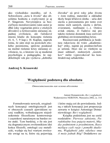 Рецензии, заметки 268 ako východisko morálky, od A. Schweitzera „úctu k životu“ ako absolútnu hodnotu a ovplyvnený je aj P. Singerom. Nevyčerpáva sa bezcieľnym moralizovaním (sám autor je dlhé roky vegetarián práve z etických dôvodov) a kritizovaním súčasnej západnej civilizácie, ale ťažiskové miesta kladie do konceptu rieńenia (4, 6, 7, 9 kap.). H. Kaplan, napriek tomu, že sám stojí na pozíciách etického pesimizmu, správne poukázal na možné rieńenie krízy súčasnej civilizácie, to, o ktorom vie aj moderná psychológia a pedagogika, že najdôležitejńí vek pre výchovu „dobrého človeka“ sú prvé roky jeho života v čom rodina, materské a základné ńkoly hrajú kľúčovú úlohu – učia deti súcitu a porozumeniu pre tento svet mimo nich samých, súcitu s deťmi, zvieratami, rastlinami (...). Ostáva avńak otázne, či ľudstvo má pre takéto rieńenie dostatok času zočivoči globálnej environmentálnej kríze. Recenzovaná publikácia je hodenou rukavicou do tváre „akademickej“ etiky, najmä jej predstaviteľom je určená. Hoci nie so vńetkým sa musí súhlasiť, niektorých „teoretikov“ môže vyprovokovať ku konńtruktívnej sebakritike. Andrzej S. Krasowski Względność podstawą dla absolutu Относительность как основа абсолюта Antoni Domaniewski, Byt i względność, Wydawnictwo NERITON, Warszawa 2002, ss. 314 Formułowanie nowych, oryginalnych koncepcji ontologicznych jest w obecnych czasach zjawiskiem raczej rzadkim, wzbudzającym niejednokrotnie filozoficzne kontrowersje i częstokroć narażonym na bardzo ostre ataki. Tym bardziej, o ile nie jest się dogmatycznym zwolennikiem idei końca filozofii, ontologii czy metafizyki, wydaje się być wartym zwrócenie uwagi na te, które się pojawiają i które mają coś do powiedzenia. Jedną z takich koncepcji jest propozycja zawarta w książce Antoniego Domaniewskiego: Byt i względność. Książka podzielona jest na sześć rozdziałów: Pierwsze założenie, Paradoksalne losy pojęcia materii, Między podmiotem a przedmiotem, Rzecz myśląca czyli racje i pomyłki dualizmu, Względność jako odsyłacz oraz A może jednak Bóg? Dodatkowo za- Recenzje, noty warte są w niej uzupełnienia, będące zasadniczo powtórzeniem głównych treści zawartych w rozdziałach. Stanowi to pewne ułatwienie, szczególnie ze względu na nowatorskość prezentowanej koncepcji. Są to: Tezy o bycie, Tezy o powszechnikach, Tezy o czasie, Tezy o „Ja głębokim” i „Ja uwikłanym”, i Tezy o względności. Są one powtórzeniem i przede wszystkim skondensowaniem najważniejszych wątków pojawiających się w treści dzieła. W Przedmowie autor zawiera dwa wątki, będące podstawowymi dla treści całej książki. Pierwszym z nich jest pewne wprowadzenie czytelnika w to, czym jest filozofia, w toczące się na przestrzeni wieków dyskusje i w pewne koncepcje niektórych myślicieli. Drugim jest prezentacja własnego stanowiska w odniesieniu do omawianej problematyki. Domaniewski ostro przeciwstawia się próbom ogłoszenia końca filozofii, czy też zastąpienia jej czymś innym. Co więcej, opowiada się za utrzymaniem zorientowania filozofii na prawdę, podobnie jak ma to miejsce w wypadku nauk, niemniej w sposób bardziej abstrakcyjny i dogłębny. Dalej zostaje zarysowany fundament całego wywodu – koncepcja względności jako czegoś przysługującego całej dostępnej nam rzeczywistości, zawierającego w sobie jednakże odesłanie do czegoś bardziej od niej pierwotnego. W pierwszym rozdziale, zatytułowanym Pierwsze założenie, mamy do czynienia zasadniczo z rozwinięciem obrazu filozofii zarysowanego 269 w Przedmowie. Na gruncie historycznym, poczynając od jończyków i eleatów, mamy ukazanie filozofii jako poszukującej jednego wspólnego pierwiastka stojącego za wszystkimi rzeczami. Związane jest to z wprowadzeniem pojęcia postulatu racji zadowalającej, odnoszącego się do tkwiącej w ludziach głębokiej potrzeby wyjaśnienia i zrozumienia świata. Założeniem, o którym mówi tytuł rozdziału, jest tutaj założenie jedności istnienia. Jest ono niezbędnie dla dalszych poszukiwań podstawy rządzącej wszelkimi rzeczami. Dalej występuje odwołanie do parmenidejskiego pojęcia bytu jako pozaempirycznego, będącego podstawą wszystkiego, jednoczącym w sobie podmiot i przedmioty. Na takie określenie wprowadza Domaniewski termin unifikans. Przez to, za Parmenidesem, niebyt zostaje uznany za coś niemożliwego, sprzecznego, zaś takie określenia jak „nic”, „pustka” zostają uznane za relatywne, odnoszące się zawsze do pewnego wycinka rzeczywistości. Z powyższych zostaje wyciągnięty wniosek określający ów abstrakcyjnie pojęty byt jako absolut. Ważnym wydaje się tutaj być podkreślenie, że stanowi on efekt dociekań rozumowych, nie jest bezpośrednio wywiedziony z samej rzeczywistości empirycznej, lecz jest uznany za konieczny do wytłumaczenia powszechnej w niej względności. Na koniec rozdziału zostaje jeszcze przedstawiony krótki rys historyczny stanowisk pluralistycznych, przede wszystkim z uwzględnieniem Empedoklesa, Demokryta oraz współczesnej fi- 270 Рецензии, заметки zyki cząstek elementarnych. W kontekście wcześniejszych ustaleń tego typu stanowiska zostają ocenione krytycznie, jako niebędące w stanie uchwycić bytu absolutnego, ani wyjaśnić przez proponowaną wielość także wielu zjawisk z dostępnego nam bezpośrednio świata. Treścią drugiego rozdziału, Paradoksalne losy pojęcia materii, jest, jak sam tytuł wskazuje, pojęcie materii i jego różne rozumienia na przestrzeni dziejów. Autor kontynuuje w nim analizowanie rozwoju myśli usiłującej uchwycić to, co pierwsze, podstawowe dla rzeczywistości. Analizuje arystotelesowskie pojęcie materii, szczególnie krytycznie odnosząc się do postrzegania jej jako potencjaln