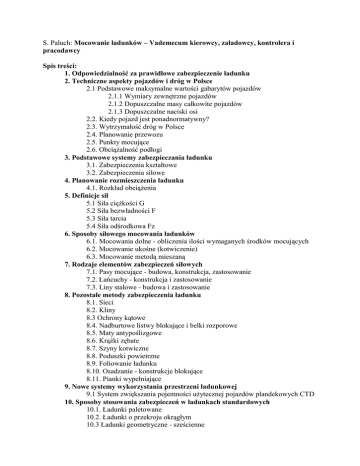 S. Paluch: Mocowanie ładunków – Vademecum kierowcy, załadowcy, kontrolera i pracodawcy Spis treści: 1. Odpowiedzialność za prawidłowe zabezpieczenie ładunku 2. Techniczne aspekty pojazdów i dróg w Polsce 2.1 Podstawowe maksymalne wartości gabarytów pojazdów 2.1.1 Wymiary zewnętrzne pojazdów 2.1.2 Dopuszczalne masy całkowite pojazdów 2.1.3 Dopuszczalne naciski osi 2.2. Kiedy pojazd jest ponadnormatywny? 2.3. Wytrzymałość dróg w Polsce 2.4. Planowanie przewozu 2.5. Punkty mocujące 2.6. Obciążalność podłogi 3. Podstawowe systemy zabezpieczania ładunku 3.1. Zabezpieczenia kształtowe 3.2. Zabezpieczenia siłowe 4. Planowanie rozmieszczenia ładunku 4.1. Rozkład obciążenia 5. Definicje sił 5.1 Siła ciężkości G 5.2 Siła bezwładności F 5.3 Siła tarcia 5.4 Siła odśrodkowa Fz 6. Sposoby siłowego mocowania ładunków 6.1. Mocowania dolne - obliczenia ilości wymaganych środków mocujących 6.2. Mocowanie ukośne (kotwiczenie) 6.3. Mocowanie metodą mieszaną 7. Rodzaje elementów zabezpieczeń siłowych 7.1. Pasy mocujące - budowa, konstrukcja, zastosowanie 7.2. Łańcuchy - konstrukcja i zastosowanie 7.3. Liny stalowe - budowa i zastosowanie 8. Pozostałe metody zabezpieczenia ładunku 8.1. Sieci 8.2. Kliny 8.3 Ochrony kątowe 8.4. Nadburtowe listwy blokujące i belki rozporowe 8.5. Maty antypoślizgowe 8.6. Krążki zębate 8.7. Szyny kotwiczne 8.8. Poduszki powietrzne 8.9. Foliowanie ładunku 8.10. Osadzanie - konstrukcje blokujące 8.11. Pianki wypełniające 9. Nowe systemy wykorzystania przestrzeni ładunkowej 9.1 System zwiększania pojemności użytecznej pojazdów plandekowych CTD 10. Sposoby stosowania zabezpieczeń w ładunkach standardowych 10.1. Ładunki paletowane 10.2. Ładunki o przekroju okrągłym 10.3 Ładunki geometryczne - sześcienne 10.4 Bele papieru 10.5 Worki 10.6. Płaskie ładunki (arkusze blachy, drewna) 10.7. Przewóz drewna 10.8. Kontenery odpadowe 10.9. Przewóz pojazdów 10.10. Przewóz maszyn 11. Praktyczne przykłady zabezpieczeń ładunków w polskim transporcie drogowym