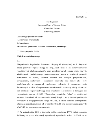 1 17.03.2014r. The Registrar European Court of Human Rights Council of Europe Strasbourg France A Skarżący (osoba fizyczna) 1. Nazwisko: Warszyński 2. Imię: Jerzy D Państwo, przeciwko któremu skierowana jest skarga 33. Rzeczpospolita Polska E Opis stanu faktycznego 34. Na podstawie Regulaminu Trybunału i Reguły 43 (dawnej 44) ust.5. “Trybunał może ponownie wpisać skargę na listę, jeżeli uzna to za usprawiedliwione wyjątkowymi okolicznościami.”, oraz przedstawionych przeze mnie nowych okoliczności narkomanii podmiotowego wykorzystywania prawa w produkcji patologii w Polsce, ochrona zdrowia bez żadnych przymiotników, świadomości, osobowości i tożsamości człowieka oraz pomoc dla osób uzależnionych, osób wykluczonych społecznie, rodzinnie i zawodowo, bezdomnych, a także ofiar postronnych narkomanii i przemocy, ażeby zakończyć ich produkcję usprweiedliwiają takie wyjątkowe okoliczności i domagam się wznowienia sprawy 4812/13 "Warszyński przeciwko Polsce" z poniższymi nowymi dowodami lub też wszczęcie nowej skargi z na podstawie poniższych dowodów z uwzględnieniem skargi 4812/13, z takimi samymi domaganiami słusznego zadośćuczynienia jak w skardze 4812/13 oraz skierowaniem sprawy II C 607/10 do ponownego rozpatrzenia. 1) W pażdzierniku 2013 r telewizja polska publiczna TVP1 nadała program kulinarny w porze wieczornej największej oglądalności dzieci 19:00-19:30, w 2 którym prezentowano wyroby cukiernicze z wymienianiem składników alkoholu "wódka gorzka" i "nalewka domowa",a więc o zawartości alkoholu większej niż piwo i więcej niż 18% w przypadku "wódki gorzkiej" dopuszczone do reklamy tylko w wyznaczonych godzinach 20:00-6:00 oraz promocji i sponsorowania alkoholu do 18% zawartości na urządzeniach medialnych i wewnątrz czasopism. W trakcie audycji prezenter zreflektował się na ekranie i powiedział, że wódka gorzka to może nie dla dzieci o tej porze. Program był powtórzony w innym dniu również w porze dziennej. Program nie zawierał informacji wymaganych przez ustawę o wychowaniu w trzeźwości o szkodliwości konsumpcji alkoholu ani też alkohol nie jest głównym produktem firm sponsorujących produkujących przyprawy kuchenne typu "Kucharek", co uprawniałoby do promocji i prezentacji "wódki gorzkiej" i “nalewki domowej” na ekranie telewizji, tym bardziej w godzinach zabronionych ustawowo. 2) Powiadomiłem elektronicznie Policję nr Ko 775/13 o tym złamaniu ustawy z dnia 26 października 1982r o wychowaniu w trzeźwości Zawiadomienie Prokuratury Rejonowej Warszawa-Mokotów i otrzymałem o odmowie wszczęcia dochodzenia z kwalifikacją czynu art.45(2) ust.1 ustawy. Artykuł ten przewiduje " 1. Kto wbrew postanowieniom zawartym w art. 13.1 prowadzi reklamę lub promocję napojów alkoholowych lub informuje o sponsorowaniu imprezy masowej, z zastrzeżeniem art. 13.1ust. 5 i 6,podlega grzywnie od 10 000 do 500 000 złotych.". 3) Art. 13.1 ustęp 5 ustawy mówi o takiej możliwości tylko "poprzez umieszczanie wewnątrz dzienników i czasopism, na zaproszeniu, bilecie, plakacie, produkcie lub tablicy informacyjnej związanej z określoną imprezą nazwy producenta lub dystrybutora oraz jego znaku towarowego, z zastrzeżeniem ", a ustęp. 6. “Informowanie o sponsorowaniu może być prowadzone w radiu i telewizji pod warunkiem, iż będzie ograniczone wyłącznie do podania nazwy producenta lub dystrybutora napojów zawierających do 18% alkoholu lub jego znaku towarowego, a informacja ta nie będzie prezentowana w telewizji przez osobę fizyczną lub z wykorzystaniem wizerunku postaci ludzkiej." 3 4) Oznacza to, że Policja i Prokuratura nie sprawdziły faktów i jest to dowód na systemowe i kulturowe lekceważenie, pomijanie i przyzwalanie łamania prawa w sprawach narkotyków faktyczne i stanowi dowód na prawdziwość twierdzeń, które zawarłem w skardze 'Warszyński przeciwko Polsce" sygn. akt 4812/13, o świadomej produkcji patologii. 5) Również ustawa z dnia 16 lutego 2007 r. o ochronie konkurencji i konsumentów zabrania takich praktyk w "Art.24. ust.2 pkt. 2) naruszanie obowiązku udzielania konsumentom rzetelnej, prawdziwej i pełnej informacji;", pisząc w ust.3. “Nie jest zbiorowym interesem konsumentów suma indywidualnych interesów konsumentów.” Czyli zdrowie ma pierwszeństwo przed konsumpcją tzw. używających i pełna informacja na opakowaniu produktu nie godzi w niczyje interesy. 6) Również ustawa z dnia 16 kwietnia 1993 r. o zwalczaniu nieuczciwej konkurencji tego zabrania w art. 25. 1. “ Kto, oznaczając lub wbrew obowiązkowi nie oznaczając towarów albo usług, wprowadza klientów w błąd co do pochodzenia, ilości, jakości, składników, sposobu wykonania, przydatności, możliwości zastosowania, naprawy, konserwacji lub innych istotnych cech towarów lub usług albo nie informuje o ryzyku, jakie wiąże się z korzystaniem z nich, i naraża w ten sposób klientów na szkodę, podlega karze aresztu albo grzywny." Więc nie można tłumaczyć podawania pełnej informacji o skutkach alkoholu na opakowaniu, jak się domagałem w sprawie II C 607/10 opisanej w skardze 4812/13 naruszaniem interesów używających, tylko jest to przemyślany zabieg marketingowy dotyczący uzależniania przymusowych konsumentów. 7) W marcu 2014r Dyrektor Państwowej Agencji Rozwiązywania Problemów Alkoholowych w Polsce przyznał w telewizji publicznej, że jest wiadomo, że ok.70% przychodów z alkoholu w Polsce pochodzi z konsumpcji chorobowej, uzależnień, wykluczeń. Obecna ustawa o wychowaniu w treźwości określa też w art. 2.1 ust. 1 pkt. 2)” promocja napojów alkoholowych – publiczną degustację napojów alkoholowych, rozdawanie rekwizytów związanych z napojami 4 alkoholowymi, organizowanie premiowanej sprzedaży napojów alkoholowych, a także inne formy publicznego zachęcania do nabywania napojów alkoholowych;". Świadczy to o aktywnej roli tej ustawy na rzecz public
