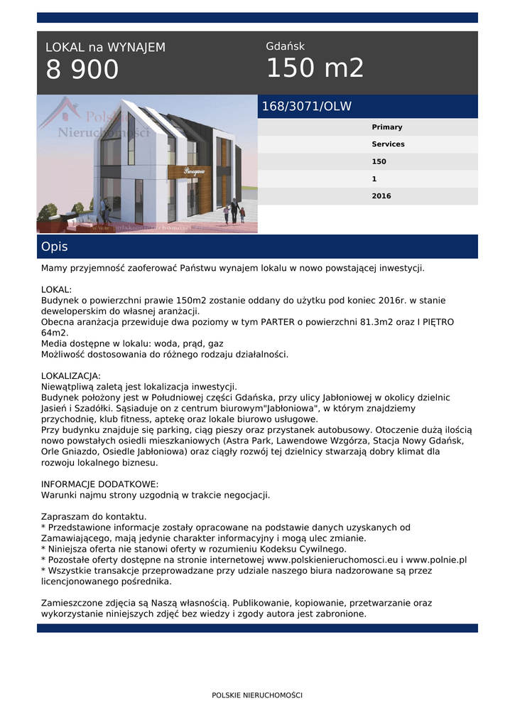 LOKAL na WYNAJEM 8 900 Gdańsk 150 m2 168/3071/OLW Primary Services 150 1 2016 Opis Mamy przyjemność zaoferować Państwu wynajem lokalu w nowo powstającej inwestycji. LOKAL: Budynek o powierzchni prawie 150m2 zostanie oddany do użytku pod koniec 2016r. w stanie deweloperskim do własnej aranżacji. Obecna aranżacja przewiduje dwa poziomy w tym PARTER o powierzchni 81.3m2 oraz I PIĘTRO 64m2. Media dostępne w lokalu: woda, prąd, gaz Możliwość dostosowania do różnego rodzaju działalności. LOKALIZACJA: Niewątpliwą zaletą jest lokalizacja inwestycji. Budynek położony jest w Południowej części Gdańska, przy ulicy Jabłoniowej w okolicy dzielnic Jasień i Szadółki. Sąsiaduje on z centrum biurowym"Jabłoniowa", w którym znajdziemy przychodnię, klub fitness, aptekę oraz lokale biurowo usługowe. Przy budynku znajduje się parking, ciąg pieszy oraz przystanek autobusowy. Otoczenie dużą ilością nowo powstałych osiedli mieszkaniowych (Astra Park, Lawendowe Wzgórza, Stacja Nowy Gdańsk, Orle Gniazdo, Osiedle Jabłoniowa) oraz ciągły rozwój tej dzielnicy stwarzają dobry klimat dla rozwoju lokalnego biznesu. INFORMACJE DODATKOWE: Warunki najmu strony uzgodnią w trakcie negocjacji. Zapraszam do kontaktu. * Przedstawione informacje zostały opracowane na podstawie danych uzyskanych od Zamawiającego, mają jedynie charakter informacyjny i mogą ulec zmianie. * Niniejsza oferta nie stanowi oferty w rozumieniu Kodeksu Cywilnego. * Pozostałe oferty dostępne na stronie internetowej www.polskienieruchomosci.eu i www.polnie.pl * Wszystkie transakcje przeprowadzane przy udziale naszego biura nadzorowane są przez licencjonowanego pośrednika. Zamieszczone zdjęcia są Naszą własnością. Publikowanie, kopiowanie, przetwarzanie oraz wykorzystanie niniejszych zdjęć bez wiedzy i zgody autora jest zabronione. POLSKIE NIERUCHOMOŚCI Marta Wierucka tel. 530 064 100 email: [email protected] POLSKIE NIERUCHOMOŚCI Powered by TCPDF (www.tcpdf.org)