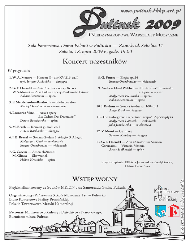 www.pultusk.bkhp.art.pl IM W M ł W programie: 1. W. A. Mozart — Koncert G–dur KV 216: cz. I 8. G. Fauree — Elegia op. 24 — 2. G. F. Haendel — Aria Xerxesa z opery Xerxes W.A.Mozart — Aria Publia z opery „Łaskawość Tytusa” 9. Andrew Lloyd Webber — „Think of me” z musicalu pt. Upiór w operze 3. F. Mendelssohn–Bartholdy — Pieśń bez słów 10. J. Brahms — Sonata A–dur op. 100: cz. I 4. Leonardo Vinci — Aria z opery „La Caduta Dei Decemuiri” 11. „The Unforgiven” z repertuaru zespołu Apocaliptyka 5. M. Bruch — Koncert g–moll: cz. I 12. V. Monti — Czardasz 6. J. B. Breval — Sonata G–dur: 2. Adagio, 3. Allegro 13. G. F. Haendel — Aria z Oratorium Samson Carrissimi — Vittoria, Vittoria 7. G. Caccini — Amor, ch'Attendi M. Glinka — Skowronek Przy fortepianie: Elżbieta Jarszewska–Kordykiewicz, Halina Promińska WSTĘP WOLNY Projekt sfinansowany ze środków MKiDN oraz Samorządu Gminy Pułtusk. Organizatorzy: Państwowa Szkoła Muzyczna I st. w Pułtusku, Biuro Koncertowe Haliny Promińskiej, Polskie Towarzystwo Muzyki Kameralnej Patronat: Ministerstwo Kultury i Dziedzictwa Narodowego, Burmistrz miasta Pułtusk