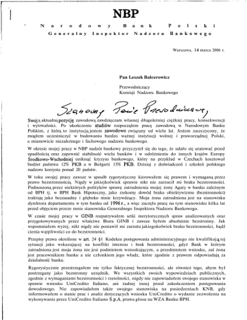 N a r o d G e n e r a l n y o w y B I n s p e k t o r a n k P N a d z o r u o l s k i B a n k o w e g o Warszawa, 14 marca 2006 r. Pan Leszek Balcerowicz Przewodniczący Komisji Nadzoru Bankowego S woj ą aktualną pozycję zawodową zawdzięczam własnej długoletniej ciężkiej pracy, konsekwencji i wytrwałości. Po ukończeniu studiów rozpocząłem pracę zawodową w Narodowym Banku Polskim, z którą to instytucją jestem .zawodowo związany od wielu lat. Jestem zaszczycony, że mogłem uczestniczyć w budowaniu bardzo ważnej instytucji wolnej i praworządnej Polski, a mianowicie niezależnego i fachowego nadzoru bankowego. W okresie mojej pracy w NBP nadzór bankowy przyczynił się do tego, że udało się uratować przed upadłością oraz zapewnić stabilność wielu banków i w odróżnieniu do innych krajów Europy Środkowo-Wschodniej uniknąć kryzysu bankowego, który na przykład w Czechach kosztował budżet państwa 12% PKB a w Bułgarii 13% PKB. Dzisiaj z doświadczeń i szkoleń polskiego nadzoru korzysta ponad 20 państw. W toku swojej pracy zawsze w sposób rygorystyczny kierowałem się prawem i wymaganą przez prawo bezstronnością. Nigdy w jakiejkolwiek sprawie nikt nie zarzucił mi braku bezstronności. Podnoszoną przez niektórych polityków sprawę zatrudnienia mojej żony Agaty w banku zależnym od BPH tj. w BPH Bank Hipoteczny, jako rzekomy dowód braku obiektywizmu (bezstronności) traktuję jako bezzasadny i głęboko mnie krzywdzący. Moja żona zatrudniona jest na stanowisku dyrektora departamentu w tym banku od 1996 r., a więc zaczęła pracę na tym stanowisku kilka lat przed objęciem przeze mnie stanowiska Generalnego Inspektora Nadzoru Bankowego. W czasie mojej pracy w GINB rozpatrywałem setki merytorycznych spraw analizowanych oraz przygotowywanych przez właściwe Biura GINB i zawsze byłem absolutnie bezstronny. Jak wspomniałem wyżej, nikt nigdy nie postawił mi zarzutu jakiegokolwiek braku bezstronności, bądź cienia wątpliwości co do bezstronności. Przepisy prawa określone w art. 24 §1 Kodeksu postępowania administracyjnego nie kwalifikuj ą tej sytuacji jako wskazującej na konflikt interesu i brak bezstronności, gdyż Bank w którym zatrudniona jest moja żona nie jest podmiotem wnioskującym, a przedmiotem wniosku, zaś żona jest pracownikiem banku a nie członkiem jego władz, które zgodnie z prawem odpowiadają za działalność banku. Rygorystycznie przestrzegałem nie tylko faktycznej bezstronności, ale również tego, abym był postrzegany jako bezstronny urzędnik. We wszystkich swoich wypowiedziach publicznych, zgodnie z wymaganiami bezstronności i rzetelności, nigdy nie zapowiadałem swojego stanowiska w sprawie wniosku UniCredito Italiano, ani żadnej innej przed zakończeniem postępowania dowodowego. Nie zapowiadałem także swojego stanowiska na posiedzeniach KNB, gdy informowałem o stanie prac i analiz dotyczących wniosku UniCredito o wydanie zezwolenia na wykonywanie przez UniCredito Italiano S.p.A. prawa głosu na WZA Banku BPH. Wniosek UCI był analizowany w GINB przez 8 miesięcy na podstawie sukcesywnie napływających materiałów. W dniu 10 sierpnia 2005 zaakceptowałem dodatkowy i specjalny tryb prac analitycznych gdzie, oprócz Biura Licencji Bankowych - standardowo prowadzącego sprawę dodatkowo wspomagał Biuro zespół ludzi pod przewodnictwem dyrektora Biura Licencji Bankowych jak i dyr. Biura Analiz Systemu Bankowego składający się z przedstawicieli 4 Biur GINB, który analizował wpływ wniosku UCI na działalność grupy BPH i Pekao SA. Rygorystyczne standardy, jakie zawsze stosowane są w GINB, w tej sprawie były przestrzegane z wyjątkową mocą. Na podstawie analiz sformułowano publicznie dostępną opinię podobnie jak stosowano w praktyce KNB od chwili jej powstania w 1998 r., że analiza całokształtu materiału dowodowego zgromadzonego w toku postępowania nakazuje przyjąć ustalenie, iż nie zachodzą, określone w art. 25 ust. 7 ustawy z dnia 29 sierpnia 1997 r. Prawo Bankowe, przesłanki odmowy zezwolenia na wykonywanie przez spółkę UniCredito prawa głosów na Walnym Zgromadzeniu Akcjonariuszy Banku BPH. Powyższe stanowisko jest stanowiskiem organu wykonawczego KNB i zgodnie z przepisami prawa w żaden sposób nie wpływa i nie ogranicza mnie w pracach KBN. W świetle powyższego czuję się głęboko dotknięty i skrzywdzony zarzutami i insynuacjami o rzekomym braku bezstronności z mojej strony. Tym niemniej, aby nie stwarzać żadnych punktów do podważania autorytetu nadzoru bankowego i wobec oszczerczej ^kampanii prowadzonej przez niektórych polityków przeciwko nadzorowi bankowemu podjąłem decyzję o powstrzymaniu się od głosowania nad wnioskiem UniCredito Italiano o wykonywanie prawa głosów na Walnym Zgromadzeniu Akcjonariuszy Banku BPH. NA ^G l/^^i^Kwaśniak -2-