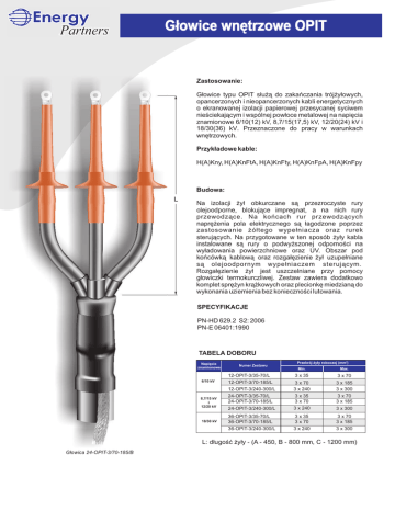 Głowice wnętrzowe OPIT Zastosowanie: Głowice typu OPIT służą do zakańczania trójżyłowych, opancerzonych i nieopancerzonych kabli energetycznych o ekranowanej izolacji papierowej przesycanej syciwem nieściekającym i wspólnej powłoce metalowej na napięcia znamionowe 6/10(12) kV, 8,7/15(17,5) kV, 12/20(24) kV i 18/30(36) kV. Przeznaczone do pracy w warunkach wnętrzowych. Przykładowe kable: H(A)Kny, H(A)KnFtA, H(A)KnFty, H(A)KnFpA, H(A)KnFpy Budowa: L Na izolacji żył obkurczane są przezroczyste rury olejoodporne, blokujące impregnat, a na nich rury przewodzące. Na końcach rur przewodzących naprężenia pola elektrycznego są łagodzone poprzez zastosowanie żółtego wypełniacza oraz rurek sterujących. Na przygotowane w ten sposób żyły kabla instalowane są rury o podwyższonej odporności na wyładowania powierzchniowe oraz UV. Obszar pod końcówką kablową oraz rozgałęzienie żył uzupełniane są olejoodpornym wypełniaczem sterującym. Rozgałęzienie żył jest uszczelniane przy pomocy głowiczki termokurczliwej. Zestaw zawiera dodatkowo komplet sprężyn krążkowych oraz plecionkę miedzianą do wykonania uziemienia bez konieczności lutowania. SPECYFIKACJE PN-HD 629.2 S2: 2006 PN-E 06401:1990 TABELA DOBORU Napięcie znamionowe 6/10 kV 8,7/15 kV i 12/20 kV 18/30 kV Numer Zestawu Przekrój żyły roboczej (mm2) Min. Max. 12-OPIT-3/35-70/L 12-OPIT-3/70-185/L 12-OPIT-3/240-300/L 24-OPIT-3/35-70/L 24-OPIT-3/70-185/L 24-OPIT-3/240-300/L 3 x 35 3 x 70 3 x 70 3 x 240 3 x 35 3 x 70 3 x 240 3 x 185 3 x 300 3 x 70 3 x 185 3 x 300 36-OPIT-3/35-70/L 36-OPIT-3/70-185/L 36-OPIT-3/240-300/L 3 x 35 3 x 70 3 x 240 3 x 70 3 x 185 3 x 300 L: długość żyły - (A - 450, B - 800 mm, C - 1200 mm) Głowica 24-OPIT-3/70-185/B