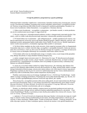 prof. dr hab. Teresa Kostkiewiczowa Instytut Badań Literackich PAN Uwagi do podstawy programowej z języka polskiego Dokument budzi wielorakie wątpliwości i zastrzeżenia: formalne (stylistyczne), koncepcyjne, merytoryczne. Powinien być poddany systematycznej ocenie (oficjalnie zamówionej) i szczegółowej dyskusji. Poniższe uwagi dotyczą tylko kilku kwestii związanych z podstawą gimnazjalną i licealną w zakresie treści kształcenia i lektur literackich, w szczególności z literatury dawnej. 1. Zakres treści kształcenia – szczególnie w gimnazjum – jest bardzo szeroki, w moim przekonaniu nie do zrealizowania (uczciwego) w ciągu trzech lat. 2. Nie jest widoczna w sformułowaniach podstawy troska o zintegrowanie nauczania języka i literatury, a jest to wielka wada dotychczasowego nauczania i nieusuwalny postulat na przyszłość. 3. W listach lektur razi wymienianie – jako obligatoryjnych – tytułów pojedynczych wierszy, mających reprezentować twórczość zazwyczaj bardzo płodnych poetów. Będzie zabawnie, jeśli np. cała populacja uczniów gimnazjum będzie znała jeden wiersz Staffa Wysokie drzewa. Byłoby lepiej pozostawić wybór nauczycielowi, ewentualnie sugerując kilka tytułów w nawiasach. 4. Na liście lektur znajduje się zbyt wiele utworów, które mają być poznane tylko we fragmentach. Generalnie mija się to z celem i niewiele daje, szczególnie w przypadku dramatów, kiedy np. przeczytanie dwu scen Romea i Julii czy dwu scen Nie-Boskiej niczego nie wyjaśnia, a wymaga od nauczyciela więcej czasu na niezbędne informacje niż ewentualne omówienie całości utworu. 5. Pozwalam sobie teraz na sformułowanie uwag w związku z tym, co jest moją ścisłą specjalnością, dlatego dezyderaty te mają charakter bardziej kategoryczny. a. należy zastąpić innym utworem sonet J.A. Morsztyna Do trupa. W dotychczasowych programach funkcjonował on jako swoista „ikona” baroku i został tak zbanalizowany, że budzi to dreszcz przerażenia np. u egzaminatorów na studiach, łatwo też poddaje się uproszczonej i schematycznej lekturze na szkolnych lekcjach. b. cieszę się, że na liście lektur znalazł się Adam Naruszewicz, ale wskazany jako lektura Głos umarłych jest najmniej odpowiednim utworem dla licealistów (b. długi, niemal każde zdanie wymaga dużego komentarza historycznego, artystycznie mniej ciekawy niż wiele innych wierszy tego poety). Proponuję wymianę na odę Na powrót senatorów (jeśli koniecznie ma być wiersz okolicznościowopolityczny) albo na doskonały Balon (mimo niejasności atrybucyjnej). Podobne zastrzeżenia dotyczą (świetnego skądinąd) Gościa w Heilsbergu Trembeckiego – każde zdanie wymaga rozległego komentarza. Proponuję dać raczej jakąś doskonałą bajkę, np. Myszka, kot i kogut, świetnie egzemplifikującą zarówno twórczość tego autora, jak i epokę. Monachomachia, szczególnie poznana tylko przez jedną pieśń, nie jest reprezentatywna dla bogatej twórczości Krasickiego, który w tym miejscu powinien być zaprezentowany przez jakieś wiersze liryczne (Osobność, Do pana Michała, Szczęśliwość) oraz prozę z Uwag (np. Milczenie, Pociecha, Stałość), szerzej i bardziej wszechstronnie, jak na to zasługuje. Pytanie, czy absolwent szkoły średniej z maturą (nawet na poziomie podstawowym) może nie znać nazwiska poety, którego utwory należą do kanonu najbardziej popularnych u nas pieśni – Franciszka Karpińskiego? Myślę, że powinien je znać choćby przez jakieś dwa wiersze (Do Justyny. Tęskność na wiosnę, Tęskność do kraju). c. zapisane w Treściach kształcenia dyspozycje dotyczące baroku i oświecenia nie mają nic wspólnego ze stanem wiedzy historycznoliterackiej na ten temat, utrwalają nieprawdziwe i dawno już odrzucone w nauce stereotypy i błędne opinie. Trzeba to koniecznie zmienić. „Tradycja sarmacka” to nie tylko obyczaje i portret, to dużo ważniejsze sprawy, których nie można w ten sposób banalizować. 1 Albo potraktować sprawę sarmatyzmu poważnie, albo nie dotykać tej trudnej kwestii. Byłabym jednak za jej sensownym, szerszym przedstawieniem. Czy pojęcie baroku w odniesieniu do literatury nie pojawi się w ogóle? To błąd, bo odbiera możliwość dotknięcia wielu tak ważnych spraw, jak koncepcja człowieka, świata, natury, stosunku do sacrum. To jest właśnie ważna XVII-wieczna tradycja kulturowa, która do dziś kształtuje postawy ludzkie, a wykracza poza kategorię sarmatyzmu, szczególnie tak pojmowaną, jak to jest zapisane w 5.4.4. Barok to nie tylko pojęcie z dziedziny stylu, dawno to już zostało dowiedzione w dużej literaturze przedmiotu, a śladu tego nie ma w sformułowaniach Podstawy. Dotyczy to zresztą całości punktów 5.4. (Dziedzictwo kulturowe a tradycja) i 5.7. (Style artystyczne i ich związek z kulturą epoki). Punkt. 5.4.5. szczególnie odbiega od wiedzy na ten temat zawartej w historycznoliterackich i kulturowych opracowaniach. I tak od dawna wiadomo, że „tradycja oświecenia” to nie dydaktyzm (to wielkie uproszczenie i redukcjonizm do banału), nie wyczerpuje się ona w racjonalizmie, laicyzacja jest problemem, a nie dokonaniem. Wszystkie formuły zawarte w tym punkcie są sprzeczne z aktualną wiedzą na temat tej tradycji, utrwalają dawno odrzucone schematy i stereotypy. Podobnie p.5.7.5. uznaje klasycyzm za „styl artystyczny” oświecenia, co jest po prostu błędne, nie można tak twierdzić, jeśli się zna oświeceniową powieść, powiastkę filozoficzną, czy choćby wiersze Karpińskiego. Ale tego wszystkiego nie ma na liście lektur, a jakaś powieść XVIII-wieczna powinna się tam koniecznie znaleźć jako przykład gatunku najbardziej dla tej tradycji ważnego (np. Sterne’a Tristram Shandy albo Przygody Toma Jonesa Fieldinga, albo Laclos). Tradycja oświecenia jest współcześnie często dyskutowana, stanowi ważny problem kultury ponowoczesnej dlatego powinna być przeds