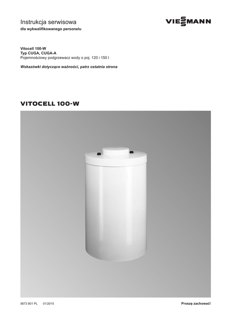 Instrukcja serwisowa VIESMANN dla wykwalifikowanego personelu Vitocell 100-W Typ CUGA, CUGA-A Pojemnościowy podgrzewacz wody o poj. 120 i 150 l Wskazówki dotyczące ważności, patrz ostatnia strona VITOCELL 100-W 5673 801 PL 01/2015 Proszę zachować! Wskazówki bezpieczeństwa Wskazówki dotyczące bezpieczeństwa Prosimy o dokładne przestrzeganie wskazówek bezpieczeństwa w celu wykluczenia ryzyka utraty zdrowia oraz powstania szkód materialnych. Prace naprawcze ! Objaśnienia do wskazówek bezpieczeństwa Niebezpieczeństwo Ten znak ostrzega przed niebezpieczeństwem zranienia. ! Uwaga Ten znak ostrzega przed stratami materialnymi i zanieczyszczeniem środowiska. Wskazówka Tekst oznaczony słowem Wskazówka zawiera dodatkowe informacje. Grupa docelowa Niniejsza instrukcja skierowana jest wyłącznie do wykwalifikowanego personelu. ■ Prace przy podzespołach elektrycznych mogą wykonywać wyłącznie wykwalifikowani elektrycy. ■ Pierwsze uruchomienie powinien przeprowadzić wykonawca instalacji lub wyznaczona przez niego osoba posiadająca odpowiednie uprawnienia. Uwaga Naprawa podzespołów spełniających funkcje zabezpieczające zagraża bezpiecznej eksploatacji instalacji. Uszkodzone podzespoły należy wymieniać na oryginalne części firmy Viessmann. Elementy dodatkowe, części zamienne i szybkozużywalne ! Uwaga Części zamienne i szybko zużywające się, które nie zostały sprawdzone wraz z instalacją, mogą zakłócić jej prawidłowe funkcjonowanie. Montaż niedopuszczonych elementów oraz nieuzgodnione zmiany konstrukcyjne mogą obniżyć bezpieczeństwo pracy instalacji i spowodować ograniczenie praw gwarancyjnych. Stosować wyłącznie oryginalne części zamienne firmy Viessmann lub części przez tę firmę dopuszczone. Obowiązujące przepisy ■ ■ ■ ■ ■ krajowe przepisy dotyczące instalacji ustawowe przepisy bezpieczeństwa i higieny pracy ustawowe przepisy o ochronie środowiska przepisy zrzeszeń zawodowo-ubezpieczeniowych stosowne przepisy bezpieczeństwa norm DIN, EN, DVGW i VDE a ÖNORM, EN i ÖVE, c SEV, SUVA, SVTI, SWKI i SVGW. Prace przy instalacji ■ ■ Uwaga Wyładowania elektrostatyczne mogą doprowadzić do uszkodzenia podzespołów elektronicznych. Przed wykonaniem prac, należy dotknąć uziemionych obiektów, np. rur grzewczych lub wodociągowych, w celu odprowadzenia ładunków statycznych. 5673 801 PL ! Wyłączyć instalację i sprawdzić brak napięcia w obwodach (np. za pomocą oddzielnego bezpiecznika lub wyłącznika głównego). Zabezpieczyć instalację przed ponownym włączeniem. 2 Spis treści Spis treści 1. Informacja Symbole ................................................................................................. Zastosowanie zgodne z przeznaczeniem .............................................. 4 4 2. Pierwsze uruchomienie, przegląd, konserwacja Czynności robocze – Pierwsze uruchomienie, przegląd i konserwacja . 5 3. Wykazy części Zamawianie części zamiennych ............................................................ 9 Pojemnościowy podgrzewacz c.w.u. ..................................................... 10 4. Protokoły .................................................................................................................. 12 5. Dane techniczne .................................................................................................................. 13 6. Poświadczenia 5673 801 PL Deklaracja zgodności ............................................................................. 14 3 Informacja Symbole Symbol Znaczenie Informacja Odsyłacz do innego dokumentu zawierającego dalsze informacje Dodatkowe informacje, nieistotne pod względem bezpieczeństwa 1. Czynność robocza na rysunkach: Numeracja odpowiada kolejności wykonywanych prac. Przebieg pracy podczas pierwszego uruchamiania, przeglądu technicznego i konserwacji został przedstawiony w ustępie „Pierwsze uruchomienie, przegląd i konserwacja” i oznaczony w następujący sposób: Symbol Znaczenie Przebieg pracy wymagany podczas pierwszego uruchamiania Czynności niewymagane podczas pierwszego uruchamiania Przebieg pracy wymagany podczas przeglądu Czynności niewymagane podczas przeglądu Przebieg pracy wymagany podczas konserwacji Czynności niewymagane podczas konserwacji Zastosowanie zgodne z przeznaczeniem Zgodnie z przeznaczeniem urządzenie można instalować i eksploatować tylko w zamkniętych systemach wg EN 12828/DIN 1988 lub instalacjach solarnych wg EN 12977, uwzględniając odpowiednie instrukcje montażu, serwisu i obsługi. Pojemnościowe podgrzewacze wody są przeznaczone wyłącznie do gromadzenia i podgrzewania wody o jakości wody pitnej, natomiast podgrzewacze buforowe wody grzewczej wyłącznie do magazynowania wody o jakości wody pitnej. W kolektorach słonecznych można stosować wyłącznie czynniki grzewcze dopuszczone przez producenta. Niewłaściwe użycie ma miejsce również wówczas, gdy zmieniona zostanie funkcja komponentów systemu (np. poprzez bezpośredni podgrzew wody użytkowej w kolektorze). Należy przestrzegać przepisów ustawowych, przede wszystkim tych dotyczących higieny wody użytkowej. Zastosowanie zgodne z przeznaczeniem zakłada, że instalację stacjonarną wykonano w połączeniu z dopuszczonymi komponentami, charakterystycznymi dla danej instalacji. Zastosowanie komercyjne lub przemysłowe w celu innym niż ogrzewanie budynku lub podgrzew wody użytkowej nie jest zastosowaniem zgodnym z przeznaczeniem. Zastosowanie wykraczające poza podany zakres jest dopuszczane przez producenta w zależności od konkretnego przypadku. 5673 801 PL Niewłaściwe użycie urządzenia wzgl. niefachowa obsługa (np. otwarcie urządzenia przez użytkownika instalacji) jest zabronione i skutkuje wyłączeniem odpowiedzialności. 4 Pierwsze uruchomienie, przegląd, konserwacja Czynności robocze – Pierwsze uruchomienie, przegląd i konserwacja Czynności robocze przy pierwszy