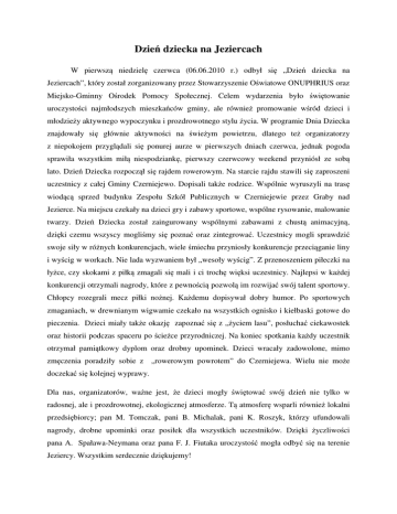 Dzień dziecka na Jeziercach W pierwszą niedzielę czerwca (06.06.2010 r.) odbył się „Dzień dziecka na Jeziercach”, który został zorganizowany przez Stowarzyszenie Oświatowe ONUPHRIUS oraz Miejsko-Gminny Ośrodek Pomocy Społecznej. Celem wydarzenia było świętowanie uroczystości najmłodszych mieszkańców gminy, ale również promowanie wśród dzieci i młodzieży aktywnego wypoczynku i prozdrowotnego stylu życia. W programie Dnia Dziecka znajdowały się głównie aktywności na świeżym powietrzu, dlatego też organizatorzy z niepokojem przyglądali się ponurej aurze w pierwszych dniach czerwca, jednak pogoda sprawiła wszystkim miłą niespodziankę, pierwszy czerwcowy weekend przyniósł ze sobą lato. Dzień Dziecka rozpoczął się rajdem rowerowym. Na starcie rajdu stawili się zaproszeni uczestnicy z całej Gminy Czerniejewo. Dopisali także rodzice. Wspólnie wyruszyli na trasę wiodącą sprzed budynku Zespołu Szkół Publicznych w Czerniejewie przez Graby nad Jezierce. Na miejscu czekały na dzieci gry i zabawy sportowe, wspólne rysowanie, malowanie twarzy. Dzień Dziecka został zaingurowany wspólnymi zabawami z chustą animacyjną, dzięki czemu wszyscy mogliśmy się poznać oraz zintegrować. Uczestnicy mogli sprawdzić swoje siły w różnych konkurencjach, wiele śmiechu przyniosły konkurencje przeciąganie liny i wyścig w workach. Nie lada wyzwaniem był „wesoły wyścig”. Z przenoszeniem piłeczki na łyżce, czy skokami z piłką zmagali się mali i ci trochę więksi uczestnicy. Najlepsi w każdej konkurencji otrzymali nagrody, które z pewnością pozwolą im rozwijać swój talent sportowy. Chłopcy rozegrali mecz piłki nożnej. Każdemu dopisywał dobry humor. Po sportowych zmaganiach, w drewnianym wigwamie czekało na wszystkich ognisko i kiełbaski gotowe do pieczenia. Dzieci miały także okazję zapoznać się z „życiem lasu”, posłuchać ciekawostek oraz historii podczas spaceru po ścieżce przyrodniczej. Na koniec spotkania każdy uczestnik otrzymał pamiątkowy dyplom oraz drobny upominek. Dzieci wracały zadowolone, mimo zmęczenia poradziły sobie z „rowerowym powrotem” do Czerniejewa. Wielu nie może doczekać się kolejnej wyprawy. Dla nas, organizatorów, ważne jest, że dzieci mogły świętować swój dzień nie tylko w radosnej, ale i prozdrowotnej, ekologicznej atmosferze. Tą atmosferę wsparli również lokalni przedsiębiorcy; pan M. Tomczak, pani B. Michalak, pani K. Roszyk, którzy ufundowali nagrody, drobne upominki oraz posiłek dla wszystkich uczestników. Dzięki życzliwości pana A. Spaława-Neymana oraz pana F. J. Fiutaka uroczystość mogła odbyć się na terenie Jeziercy. Wszystkim serdecznie dziękujemy!