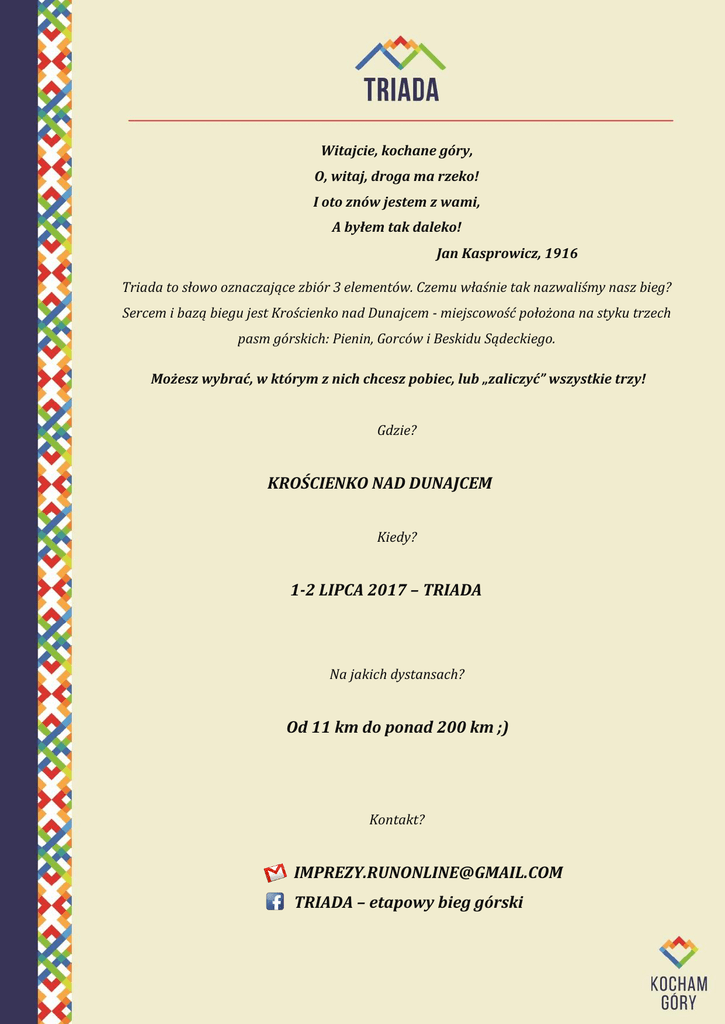 Witajcie, kochane góry, O, witaj, droga ma rzeko! I oto znów jestem z wami, A byłem tak daleko! Jan Kasprowicz, 1916 Triada to słowo oznaczające zbiór 3 elementów. Czemu właśnie tak nazwaliśmy nasz bieg? Sercem i bazą biegu jest Krościenko nad Dunajcem - miejscowość położona na styku trzech pasm górskich: Pienin, Gorców i Beskidu Sądeckiego. Możesz wybrać, w którym z nich chcesz pobiec, lub „zaliczyć” wszystkie trzy! Gdzie? KROŚCIENKO NAD DUNAJCEM Kiedy? 1-2 LIPCA 2017 – TRIADA Na jakich dystansach? Od 11 km do ponad 200 km ;) Kontakt? [email protected] TRIADA – etapowy bieg górski PROGRAM 30.06 - Piątek 18:00 – 21:30 - Biuro zawodów 1.07 - Sobota 04:00 - Start BESKID SĄDECKI 60 07:00 - Start BESKID SĄDECKI 35 07:30 - 08:30 - Biuro zawodów 09:00 - Start BESKID SĄDECKI 17 10:00 – 17:00 – witanie zawodników na mecie 19:00 - 20:00 - Biuro zawodów 21:00 - Start PIENINY NOCNE 11 2.07 - Niedziela 08:00 – 09:30 - Biuro zawodów 10:00 - Start GORCE 34 oraz GORCE 22 16:30 – Uroczysta dekoracja wszystkich finisherów TRIADY „Wybierz bieg dla siebie lub zalicz wszystkie trzy!” Limit uczestników na każdy dystans TRIADY to 150 osób. Bieg TRIADA polega na ukończeniu trzech biegów, których dystanse zależą od wybrania dystansu łącznego (105, 80, 68, 50 km). Istnieje możliwość wystartowania na jednym dystansie. Poniżej umieszczamy również limity czasu na ukończenie poszczególnych dystansów. Limit uczestników na każdy z dystansów SOLO to 100 osób. PAKIET STARTOWY 1. Każdy uczestnik imprezy otrzymuje w pakiecie startowym pamiątkowy kubek. Biegacze zapisani na TRIADĘ mają możliwość wybrać sobie napis jaki umieścimy na kubku. W formularzu będzie miejsce na 80 znaków, w które trzeba wpisać swój napis. Biegacze zapisani na konkurencje SOLO otrzymają kubek bez personalizacji. 2. Każdy uczestnik po ukończeniu swojej konkurencji otrzyma pamiątkowy medal. Uczestnicy TRIADY otrzymują medal podczas uroczystej dekoracji pod warunkiem ukończenia wszystkich trzech biegów. 3. Dla chętnych istnieje możliwość zamówienia okolicznościowych gadżetów. Informacja o uruchomieniu sklepu „Kocham Góry – Wspieram GOPR” zostanie ogłoszona na stronie www oraz stronie facebookowej. Część kwoty ze sprzedaży przeznaczona zostanie na wsparcie Górskiego Ochotniczego Pogotowia Ratunkowego. Gadżety można zamawiać przy okazji opłaty za pakiet lub w innym dowolnym momencie (do 10 czerwca). Gadżety będą do odebrania w biurze zawodów. W tytule przelewu prosimy wpisać odpowiedni numer np. gadżet nr 3. ZAPISY I OPŁATY 1. W biegu mogą brać udział osoby, które mają ukończone 18 lat. Jedynym wyjątkiem są PIENINY 11 oraz BESKID SĄDECKI 17, gdzie uczestnik musi mieć ukończone 16 lat. W tym przypadku wymagane jest złożenie zgody rodzica w biurze zawodów 2. W Biegu mogą wziąć udział osoby, które wypełniły formularz zgłoszeniowy (w formie elektronicznej lub w biurze zawodów) oraz dokonały opłaty wpisowej. 3. Zgłoszenia można dokonać drogą elektroniczną (link) lub w Biurze Zawodów. Dane do przelewu opłaty startowej: XXXXXXXXXXXXXXXXXXXXXXx XXXXXXXXXXXXXXXXXXXXXXX XXXXXXXXXXXXXXXXXXXXXXX OPŁATY STARTOWE DYSTANSE SOLO GRUDZIEŃ STYCZEŃ LUTY MARZEC KWIECIEŃ MAJ CZERWIEC* BIURO** BESKID 17 49 59 69 69 69 69 79 80 LATO GRUDZIEŃ STYCZEŃ LUTY MARZEC KWIECIEŃ MAJ CZERWIEC* BIURO** TRIADA 50 109 119 139 139 149 149 159 160 BESKID 35 69 79 99 99 109 109 119 120 BESKID 60 109 119 139 139 149 149 159 160 TRIADA 68 139 149 169 169 189 189 199 200 PIENINY 11 GORCE 22 GORCE 34 49 59 69 59 59 79 59 79 99 59 79 99 59 79 109 59 79 109 69 89 119 70 90 120 TRIADA 80 159 169 189 199 219 219 239 240 TRIADA ULTRA 105 189 199 219 219 249 249 279 280 * Przelewy przyjmujemy do 20 czerwca. ** Tylko w przypadku niewypełnienia limitu. Brak pewności pełnego pakietu. 1. W przypadku nie pojawienia się potwierdzenia wpłaty na liście startowej prosimy o kontakt – [email protected]. Organizator nie odpowiada za zaginięcie przekazu pocztowego lub przelewu bankowego z winy poczty lub banku. 2. Organizator zastrzega sobie możliwość zwolnienia z opłaty startowej lub obniżenia opłaty dla gości specjalnych oraz osób pomocnych przy organizacji biegu. Zamiana zawodnika! Opłata raz uiszczona nie podlega zwrotowi. Istnieje możliwość bezpłatnego przepisania swojego pakietu startowego na innego zawodnika. Informację o zamianie prosimy zgłaszać w nieprzekraczalnym terminie do 10 czerwca. Po tym terminie można dokonać przepisania pakietu na inną osobę za dodatkową opłatą. Dla dystansu SOLO 15 złotych, dla TRIADY 30 złotych. WYPOSAŻENIE OBOWIĄZKOWE (TABELKA) Na każdym dystansie uczestnik ma obowiązek mieć przy sobie: - numer startowy wraz z chipem pomiarowym, - naładowany telefon komórkowy, - kurtkę lub bluzę na wypadek zmiany pogody, - papierową mapę trasy przekazaną przez organizatora - czołówkę/latarkę (BIEG PIENINY) - pojemniki na wodę co najmniej 1l. Na wypadek upałów 1,5l(nie dotyczy biegu PIENINY) ZAPISY DOTYCZĄCE WSZYSTKICH BIEGÓW Celem Triady jest: - Promocja walorów przyrodniczych i krajobrazowych Gorców, Pienin i Beskidu Sądeckiego; - Popularyzacja zdrowego trybu życia poprzez kontakt z naturą oraz wysiłkiem fizycznym na łonie natury; - Wzrost świadomości ekologicznej i konieczności ochrony przyrody. Organizator zapewnia każdemu uczestnikowi: pamiątkowy medal, zabezpieczenie medyczne, oraz ratownicze, pamiątkowy, bezzwrotny numer startowy, upominki dla najlepszych. Dodatkowo uczestnicy otrzymują mapę z zaznaczoną trasą poszczególnych biegów, napoje oraz korzystają z punktów odżywczych (szczegółowe informacje na mapie). Każdy z uczestników otrzymuje chip pomiarowy do przywiązania do sznurówki (ewentualnie zapięcia zaciskiem). Posiadanie chipa jest warunkiem sklasyfikowania zawodnika. Numery startowe powinny być widoczne dla sędziów. Uczestnicy