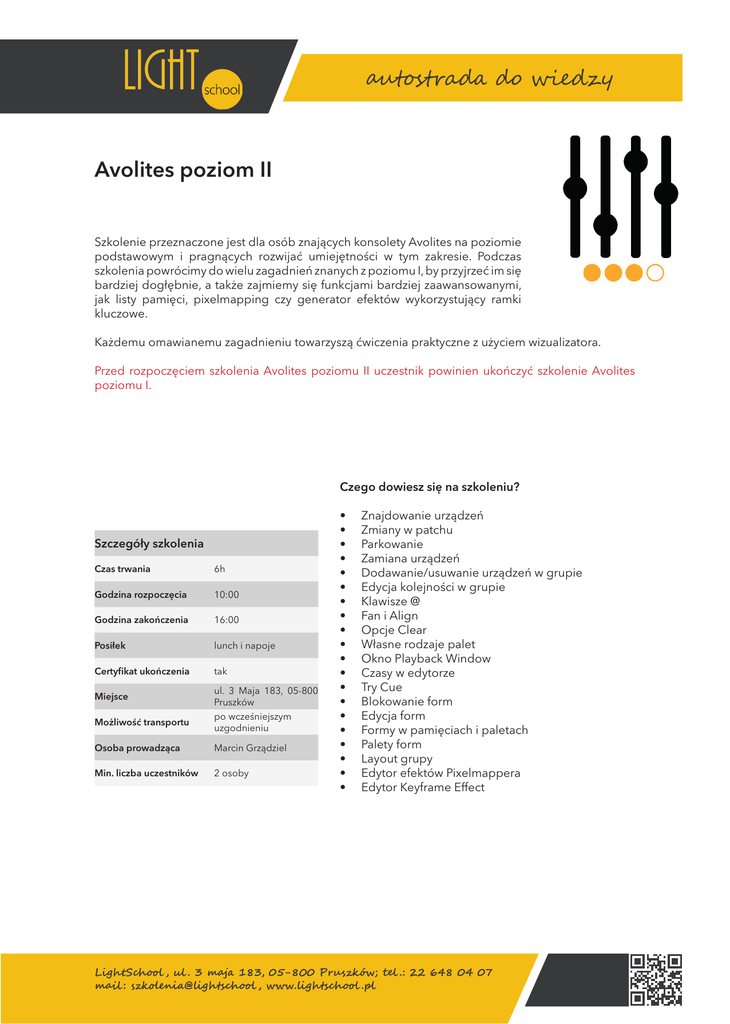 autostrada do wiedzy Avolites poziom II Szkolenie przeznaczone jest dla osób znających konsolety Avolites na poziomie podstawowym i pragnących rozwijać umiejętności w tym zakresie. Podczas szkolenia powrócimy do wielu zagadnień znanych z poziomu I, by przyjrzeć im się bardziej dogłębnie, a także zajmiemy się funkcjami bardziej zaawansowanymi, jak listy pamięci, pixelmapping czy generator efektów wykorzystujący ramki kluczowe. Każdemu omawianemu zagadnieniu towarzyszą ćwiczenia praktyczne z użyciem wizualizatora. Przed rozpoczęciem szkolenia Avolites poziomu II uczestnik powinien ukończyć szkolenie Avolites poziomu I. Czego dowiesz się na szkoleniu? Szczegóły szkolenia Czas trwania 6h Godzina rozpoczęcia 10:00 Godzina zakończenia 16:00 Posiłek lunch i napoje Certyfikat ukończenia tak Miejsce Możliwość transportu ul. 3 Maja 183, 05-800 Pruszków po wcześniejszym uzgodnieniu Osoba prowadząca Marcin Grządziel Min. liczba uczestników 2 osoby • • • • • • • • • • • • • • • • • • • • Znajdowanie urządzeń Zmiany w patchu Parkowanie Zamiana urządzeń Dodawanie/usuwanie urządzeń w grupie Edycja kolejności w grupie Klawisze @ Fan i Align Opcje Clear Własne rodzaje palet Okno Playback Window Czasy w edytorze Try Cue Blokowanie form Edycja form Formy w pamięciach i paletach Palety form Layout grupy Edytor efektów Pixelmappera Edytor Keyframe Effect LightSchool , ul . 3 maja 183, 05-800 Pruszków; tel .: 22 648 04 07 mail : szkolenia@lightschool , www.lightschool .pl
