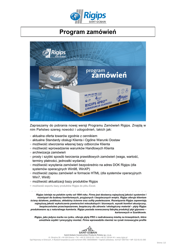 Program zamówień Zapraszamy do pobrania nowej wersji Programu Zamówień Rigips. Znajdą w nim Państwo szereg nowości i udogodnień, takich jak: ❍ ❍ ❍ ❍ ❍ ❍ ❍ ❍ ❍ ❍ aktualna oferta towarów zgodnie z cennikiem aktualne Standardy obsługi Klienta i Ogólne Warunki Dostaw możliwość stworzenia własnej bazy odbiorców Klienta możliwość wprowadzenie warunków Handlowych Klienta archiwizacja zamówień prosty i szybki sposób tworzenia prawidłowych zamówień (waga, wartość, terminy płatności, jednostki wydania) możliwość wysyłania zamówień bezpośrednio na adres DOK Rigips (dla systemów operacyjnych Win98, WinXP) możliwość zapisu zamówień w formacie HTML (dla systemów operacyjnych Win7, Win8) możliwość aktualizacji bazy produktów Rigips możliwość exportu bazy produktów Rigips do pliku Excel. Rigips istnieje na polskim rynku od 1994 roku. Firma jest dostawcą najwyższej jakości systemów i rozwiązań do budowy komfortowych, przyjaznych i bezpiecznych wnętrz. Rigips oferuje klientom ściany działowe, poddasza, okładziny ścienne oraz sufity podwieszane. Rozwiązania Rigips zapewniają najwyższą jakość wykończenia powierzchni mieszkalnych i biurowych, wysoki komfort akustyczny, bezpieczeństwo przeciwpożarowe, bezpieczny dla zdrowia i ekologiczny materiał – płyty Rigips produkowane są z naturalnego kamienia. Rigips posiada nowoczesną fabrykę produkcji płyt gipsowo – kartonowych w Szarbkowie. Rigips, jako jedyna marka na rynku, oferuje płytę PRO z nadrukowaną miarką na krawędziach, która umożliwia szybki i precyzyjny montaż. Firma wprowadziła również na rynek innowacyjne profile Saint-Gobain Construction Products Polska sp. z o.o. Ul. Okrężna 16 • 44-100 Gliwice • Tel. +48 32 339 63 00 • Faks +48 32 339 64 44 • www.rigips.pl Sąd Rejonowy w Gliwicach, X Wydział Gospodarczy pod numerem KRS: 0000086064 • Kapitał zakładowy: 314 627 500 PLN • NIP: 522-01-01-585 Strona: 1/2 ULTRASTIL®, które dzięki specjalnym ryflowaniom są o ponad 50% sztywniejsze i bardziej wytrzymałe, niż zwykłe standardowe profile. Kontakt dla mediów: Katarzyna Kołodziejska Starszy specjalista marketingu Biuro Rigips w Warszawie ul. Cybernetyki 9 02-677 Warszawa e-mail: [email protected] Tel. kom.: +48 668 311 526 Saint-Gobain Construction Products Polska sp. z o.o. Ul. Okrężna 16 • 44-100 Gliwice • Tel. +48 32 339 63 00 • Faks +48 32 339 64 44 • www.rigips.pl Sąd Rejonowy w Gliwicach, X Wydział Gospodarczy pod numerem KRS: 0000086064 • Kapitał zakładowy: 314 627 500 PLN • NIP: 522-01-01-585 Strona: 2/2