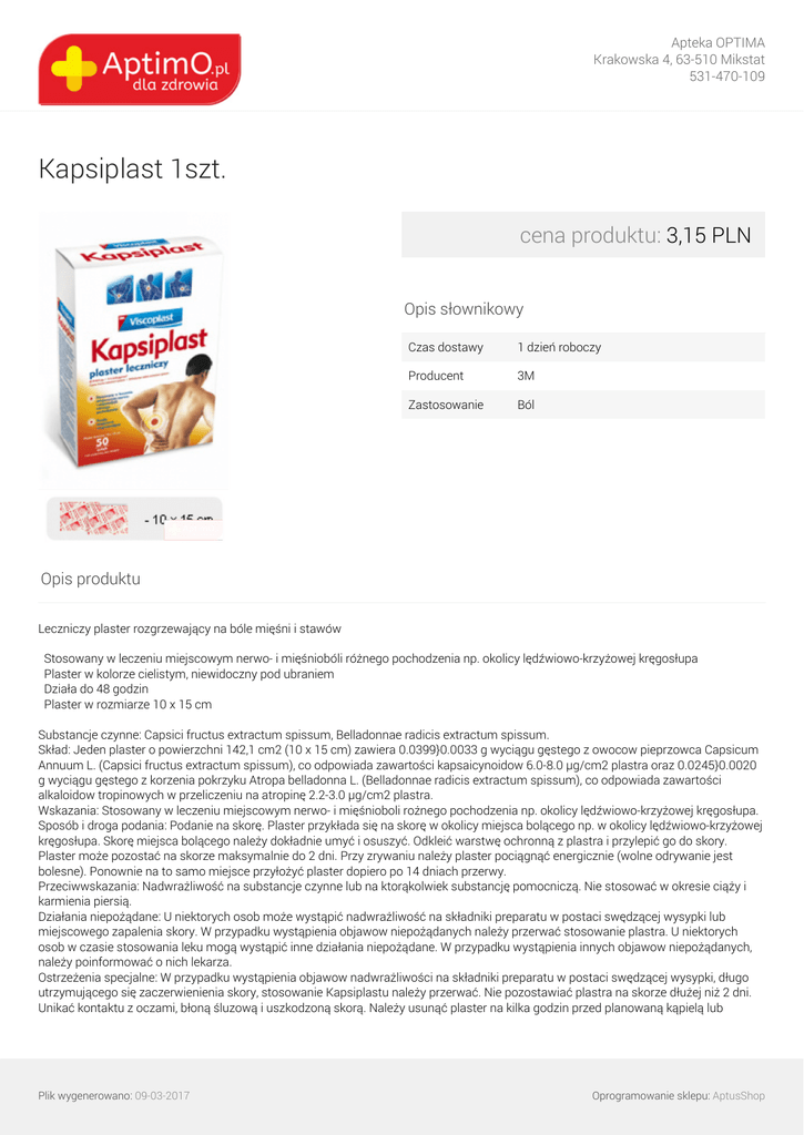 Apteka OPTIMA Krakowska 4, 63-510 Mikstat 531-470-109 Kapsiplast 1szt. cena produktu: 3,15 PLN Opis słownikowy Czas dostawy 1 dzień roboczy Producent 3M Zastosowanie Ból Opis produktu Leczniczy plaster rozgrzewający na bóle mięśni i stawów Stosowany w leczeniu miejscowym nerwo- i mięśniobóli różnego pochodzenia np. okolicy lędźwiowo-krzyżowej kręgosłupa Plaster w kolorze cielistym, niewidoczny pod ubraniem Działa do 48 godzin Plaster w rozmiarze 10 x 15 cm Substancje czynne: Capsici fructus extractum spissum, Belladonnae radicis extractum spissum. Skład: Jeden plaster o powierzchni 142,1 cm2 (10 x 15 cm) zawiera 0.0399}0.0033 g wyciągu gęstego z owocow pieprzowca Capsicum Annuum L. (Capsici fructus extractum spissum), co odpowiada zawartości kapsaicynoidow 6.0-8.0 μg/cm2 plastra oraz 0.0245}0.0020 g wyciągu gęstego z korzenia pokrzyku Atropa belladonna L. (Belladonnae radicis extractum spissum), co odpowiada zawartości alkaloidow tropinowych w przeliczeniu na atropinę 2.2-3.0 μg/cm2 plastra. Wskazania: Stosowany w leczeniu miejscowym nerwo- i mięśnioboli rożnego pochodzenia np. okolicy lędźwiowo-krzyżowej kręgosłupa. Sposób i droga podania: Podanie na skorę. Plaster przykłada się na skorę w okolicy miejsca bolącego np. w okolicy lędźwiowo-krzyżowej kręgosłupa. Skorę miejsca bolącego należy dokładnie umyć i osuszyć. Odkleić warstwę ochronną z plastra i przylepić go do skory. Plaster może pozostać na skorze maksymalnie do 2 dni. Przy zrywaniu należy plaster pociągnąć energicznie (wolne odrywanie jest bolesne). Ponownie na to samo miejsce przyłożyć plaster dopiero po 14 dniach przerwy. Przeciwwskazania: Nadwrażliwość na substancje czynne lub na ktorąkolwiek substancję pomocniczą. Nie stosować w okresie ciąży i karmienia piersią. Działania niepożądane: U niektorych osob może wystąpić nadwrażliwość na składniki preparatu w postaci swędzącej wysypki lub miejscowego zapalenia skory. W przypadku wystąpienia objawow niepożądanych należy przerwać stosowanie plastra. U niektorych osob w czasie stosowania leku mogą wystąpić inne działania niepożądane. W przypadku wystąpienia innych objawow niepożądanych, należy poinformować o nich lekarza. Ostrzeżenia specjalne: W przypadku wystąpienia objawow nadwrażliwości na składniki preparatu w postaci swędzącej wysypki, długo utrzymującego się zaczerwienienia skory, stosowanie Kapsiplastu należy przerwać. Nie pozostawiać plastra na skorze dłużej niż 2 dni. Unikać kontaktu z oczami, błoną śluzową i uszkodzoną skorą. Należy usunąć plaster na kilka godzin przed planowaną kąpielą lub Plik wygenerowano: 09-03-2017 Oprogramowanie sklepu: AptusShop Apteka OPTIMA Krakowska 4, 63-510 Mikstat 531-470-109 prysznicem. Jeżeli objawy nasilą się lub nie ustąpią należy skonsultować się z lekarzem. Preparaty zawierające atropinę nie powinny być stosowane przy jaskrze z zamkniętym kątem, niedrożności przewodu pokarmowego, zwężeniu odźwiernika, chorobie refluksowej żołądka oraz zwężeniu szyi pęcherza moczowego. Podmiot odpowiedzialny: 3M Poland Sp. z o.o. Al. Katowicka 117, Kajetany, 05-830 Nadarzyn. Pozwolenie nr: R/2705. Plik wygenerowano: 09-03-2017 Powered by TCPDF (www.tcpdf.org) Oprogramowanie sklepu: AptusShop