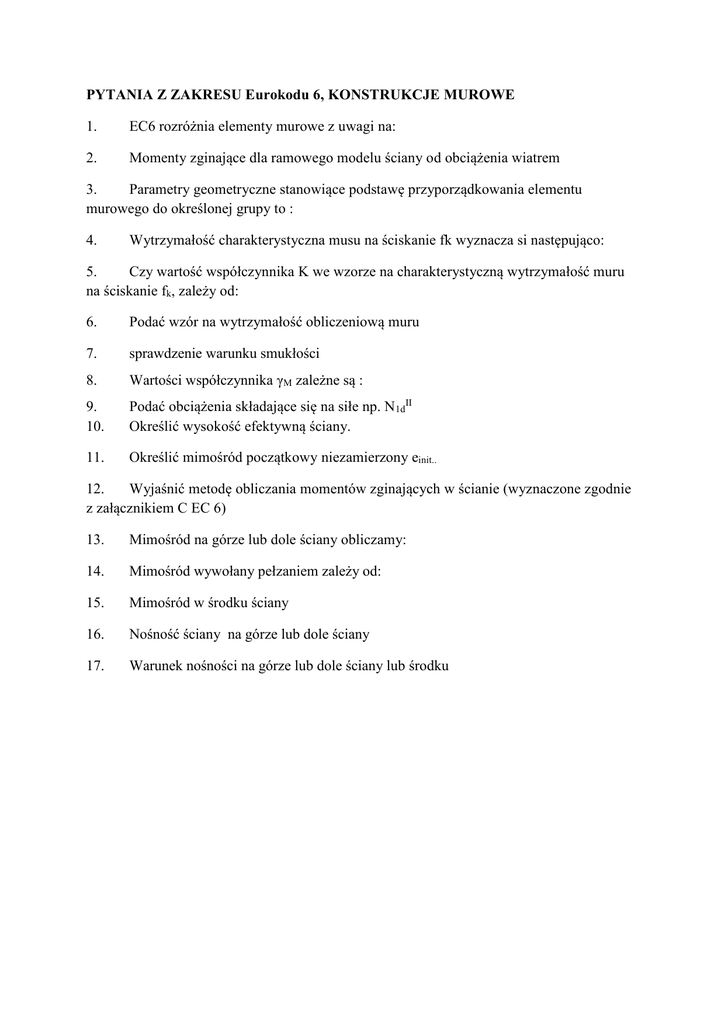 PYTANIA Z ZAKRESU Eurokodu 6, KONSTRUKCJE MUROWE 1. EC6 rozróżnia elementy murowe z uwagi na: 2. Momenty zginające dla ramowego modelu ściany od obciążenia wiatrem 3. Parametry geometryczne stanowiące podstawę przyporządkowania elementu murowego do określonej grupy to : 4. Wytrzymałość charakterystyczna musu na ściskanie fk wyznacza si następująco: 5. Czy wartość współczynnika K we wzorze na charakterystyczną wytrzymałość muru na ściskanie fk, zależy od: 6. Podać wzór na wytrzymałość obliczeniową muru 7. sprawdzenie warunku smukłości 8. Wartości współczynnika γM zależne są : 9. 10. Podać obciążenia składające się na siłe np. N1dII Określić wysokość efektywną ściany. 11. Określić mimośród początkowy niezamierzony einit.. 12. Wyjaśnić metodę obliczania momentów zginających w ścianie (wyznaczone zgodnie z załącznikiem C EC 6) 13. Mimośród na górze lub dole ściany obliczamy: 14. Mimośród wywołany pełzaniem zależy od: 15. Mimośród w środku ściany 16. Nośność ściany na górze lub dole ściany 17. Warunek nośności na górze lub dole ściany lub środku