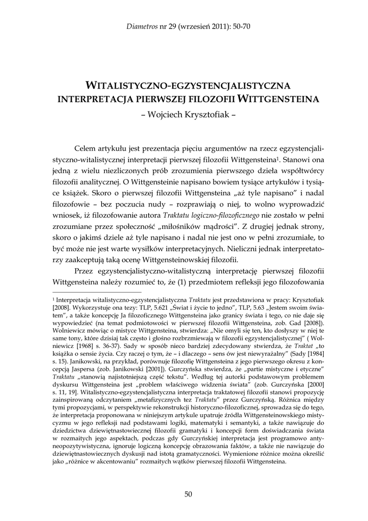 Diametros nr 29 (wrzesień 2011): 50-70 WITALISTYCZNO-EGZYSTENCJALISTYCZNA INTERPRETACJA PIERWSZEJ FILOZOFII WITTGENSTEINA – Wojciech Krysztofiak – Celem artykułu jest prezentacja pięciu argumentów na rzecz egzystencjalistyczno-witalistycznej interpretacji pierwszej filozofii Wittgensteina1. Stanowi ona jedną z wielu niezliczonych prób zrozumienia pierwszego dzieła współtwórcy filozofii analitycznej. O Wittgensteinie napisano bowiem tysiące artykułów i tysiące książek. Skoro o pierwszej filozofii Wittgensteina „aż tyle napisano” i nadal filozofowie – bez poczucia nudy – rozprawiają o niej, to wolno wyprowadzić wniosek, iż filozofowanie autora Traktatu logiczno-filozoficznego nie zostało w pełni zrozumiane przez społeczność „miłośników mądrości”. Z drugiej jednak strony, skoro o jakimś dziele aż tyle napisano i nadal nie jest ono w pełni zrozumiałe, to być może nie jest warte wysiłków interpretacyjnych. Nieliczni jednak interpretatorzy zaakceptują taką ocenę Wittgensteinowskiej filozofii. Przez egzystencjalistyczno-witalistyczną interpretację pierwszej filozofii Wittgensteina należy rozumieć to, że (1) przedmiotem refleksji jego filozofowania Interpretacja witalistyczno-egzystencjalistyczna Traktatu jest przedstawiona w pracy: Krysztofiak [2008]. Wykorzystuje ona tezy: TLP, 5.621 „Świat i życie to jedno”, TLP, 5.63 „Jestem swoim światem”, a także koncepcję Ja filozoficznego Wittgensteina jako granicy świata i tego, co nie daje się wypowiedzieć (na temat podmiotowości w pierwszej filozofii Wittgensteina, zob. Gad [2008]). Wolniewicz mówiąc o mistyce Wittgensteina, stwierdza: „Nie omyli się ten, kto dosłyszy w niej te same tony, które dzisiaj tak często i głośno rozbrzmiewają w filozofii egzystencjalistycznej” ( Wolniewicz [1968] s. 36-37). Sady w sposób nieco bardziej zdecydowany stwierdza, że Traktat „to książka o sensie życia. Czy raczej o tym, że – i dlaczego – sens ów jest niewyrażalny” (Sady [1984] s. 15). Janikowski, na przykład, porównuje filozofię Wittgensteina z jego pierwszego okresu z koncepcją Jaspersa (zob. Janikowski [2001]). Gurczyńska stwierdza, że „partie mistyczne i etyczne” Traktatu „stanowią najistotniejszą część tekstu”. Według tej autorki podstawowym problemem dyskursu Wittgensteina jest „problem właściwego widzenia świata” (zob. Gurczyńska [2000] s. 11, 19]. Witalistyczno-egzystencjalistyczna interpretacja traktatowej filozofii stanowi propozycję zainspirowaną odczytaniem „metafizycznych tez Traktatu” przez Gurczyńską. Różnica między tymi propozycjami, w perspektywie rekonstrukcji historyczno-filozoficznej, sprowadza się do tego, że interpretacja proponowana w niniejszym artykule upatruje źródła Wittgensteinowskiego mistycyzmu w jego refleksji nad podstawami logiki, matematyki i semantyki, a także nawiązuje do dziedzictwa dziewiętnastowiecznej filozofii gramatyki i koncepcji form doświadczania świata w rozmaitych jego aspektach, podczas gdy Gurczyńskiej interpretacja jest programowo antyneopozytywistyczna, ignoruje logiczną koncepcję obrazowania faktów, a także nie nawiązuje do dziewiętnastowiecznych dyskusji nad istotą gramatyczności. Wymienione różnice można określić jako „różnice w akcentowaniu” rozmaitych wątków pierwszej filozofii Wittgensteina. 1 50 Wojciech Krysztofiak ◦ Witalistyczno-egzystencjalistyczna interpretacja pierwszej filozofii... jest całość strumienia doświadczanego życia podmiotu filozofującego; (2) że życie pojęte całościowo jako przedmiot refleksji filozoficznej Wittgensteina jest ujmowane w aspekcie sensu (wartości, celu), czyniącego jego zrozumienie; (3) że fundamentalne pytanie, jakie autor Traktatu stawia, dotyczy „granicy logicznej wyrażalności życia jako całości i jego sensu”2. Prezentowane w tekście argumenty nie mają charakteru nowatorskiego w tym znaczeniu, że są w nich wykorzystane jakieś nowe fakty dotyczące spuścizny filozoficznej Wittgensteina. Bazują one na tym, co w literaturze przedmiotu jest już znane nawet od wielu lat. Nie znaczy to jednak tego, że niniejszy artykuł posiada wyłącznie charakter odtwórczo-dydaktyczny. Jest on bowiem próbą znalezienia nowych powiązań intertekstualnych pomiędzy pierwszą filozofią Wittgensteina a filozoficzną, rozdwojoną tradycją witalizmu przełomu XIX i XX wieku (naturalistyczną oraz transcendentalistyczną). Ujęcie Traktatu w takiej perspektywie interpretacyjnej pozwala na skonstruowanie płaszczyzny pojęciowej umożliwiającej formułowanie „rozsądnych” parafraz filozoficznego dyskursu kontynentalnego na dyskurs analityczny i vice versa. Być może rzekoma, głęboka przepaść czy też niewspółmierność pojęciowa pomiędzy tymi dyskursami ujawni się wówczas jako iluzoryczna3. Stąd też cel zaprezentowania argumentów na rzecz witalistyczno-egzystencjalistycznej interpretacji Traktatu jest motywowany bardziej metafilozoficznie niż historycznie. Celem krytyki filozoficznej bywa niekiedy konstruowanie adaptacyjnych schematów pojęciowych, na gruncie których „dotychczas niewspółmierne” dyskursy filozoficzne zostają zanurzone w pewnym, Przedstawione w skrócie „wyznaczniki” interpretacji egzystencjalistyczno-witalistycznej można dalej rozbudowywać (do postaci opasłej książki). W terminach Traktatu interpretację witalistyczno-egzystencjalistyczną można ująć jako przypisującą filozofowaniu Wittgensteina motyw udzielenia odpowiedzi na pytania: Czy całość subiektywnego życia (danego w potocznym doświadczeniu jednostki) wraz z jego sensem (wartością i celem nadawanym życiu przez Ja) daje się logicznie obrazować? Czy można o sensie życia (wartościach, fundamentalnych celach, imponderabiliach) racjonalnie mówić (racjonalnie opisywać, objaśniać oraz wyjaśniać go)? Pytania te posiadają swoje uszczegółowienia. Jeśli sens