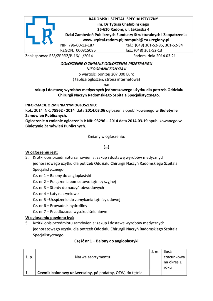 P-16-2014 ogloszenie.. - Radomski Szpital Specjalistyczny im. dr