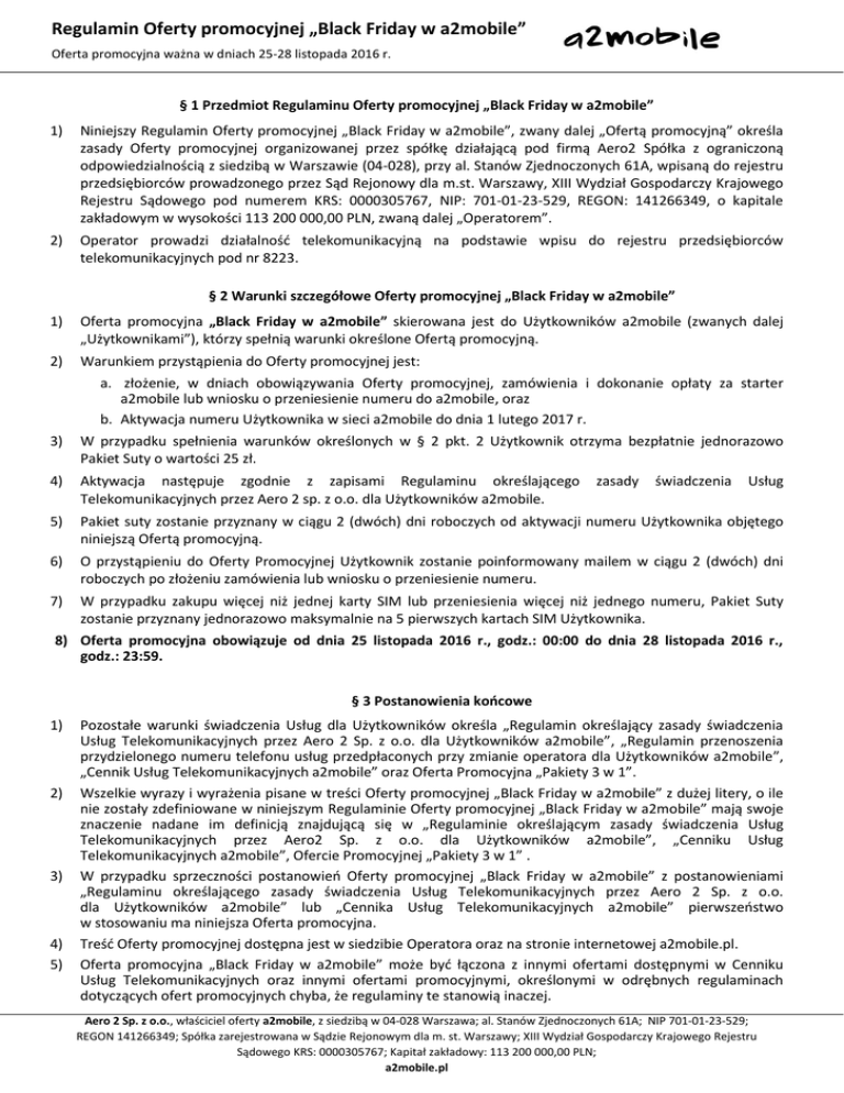 Regulamin Oferty promocyjnej „Black Friday w a2mobile” Oferta promocyjna ważna w dniach 25-28 listopada 2016 r. § 1 Przedmiot Regulaminu Oferty promocyjnej „Black Friday w a2mobile” 1) Niniejszy Regulamin Oferty promocyjnej „Black Friday w a2mobile”, zwany dalej „Ofertą promocyjną” określa zasady Oferty promocyjnej organizowanej przez spółkę działającą pod firmą Aero2 Spółka z ograniczoną odpowiedzialnością z siedzibą w Warszawie (04-028), przy al. Stanów Zjednoczonych 61A, wpisaną do rejestru przedsiębiorców prowadzonego przez Sąd Rejonowy dla m.st. Warszawy, XIII Wydział Gospodarczy Krajowego Rejestru Sądowego pod numerem KRS: 0000305767, NIP: 701-01-23-529, REGON: 141266349, o kapitale zakładowym w wysokości 113 200 000,00 PLN, zwaną dalej „Operatorem”. 2) Operator prowadzi działalność telekomunikacyjną na podstawie wpisu do rejestru przedsiębiorców telekomunikacyjnych pod nr 8223. § 2 Warunki szczegółowe Oferty promocyjnej „Black Friday w a2mobile” 1) Oferta promocyjna „Black Friday w a2mobile” skierowana jest do Użytkowników a2mobile (zwanych dalej „Użytkownikami”), którzy spełnią warunki określone Ofertą promocyjną. 2) Warunkiem przystąpienia do Oferty promocyjnej jest: a. złożenie, w dniach obowiązywania Oferty promocyjnej, zamówienia i dokonanie opłaty za starter a2mobile lub wniosku o przeniesienie numeru do a2mobile, oraz b. Aktywacja numeru Użytkownika w sieci a2mobile do dnia 1 lutego 2017 r. 3) W przypadku spełnienia warunków określonych w § 2 pkt. 2 Użytkownik otrzyma bezpłatnie jednorazowo Pakiet Suty o wartości 25 zł. 4) Aktywacja następuje zgodnie z zapisami Regulaminu określającego Telekomunikacyjnych przez Aero 2 sp. z o.o. dla Użytkowników a2mobile. 5) Pakiet suty zostanie przyznany w ciągu 2 (dwóch) dni roboczych od aktywacji numeru Użytkownika objętego niniejszą Ofertą promocyjną. 6) O przystąpieniu do Oferty Promocyjnej Użytkownik zostanie poinformowany mailem w ciągu 2 (dwóch) dni roboczych po złożeniu zamówienia lub wniosku o przeniesienie numeru. 7) W przypadku zakupu więcej niż jednej karty SIM lub przeniesienia więcej niż jednego numeru, Pakiet Suty zostanie przyznany jednorazowo maksymalnie na 5 pierwszych kartach SIM Użytkownika. zasady świadczenia Usług 8) Oferta promocyjna obowiązuje od dnia 25 listopada 2016 r., godz.: 00:00 do dnia 28 listopada 2016 r., godz.: 23:59. § 3 Postanowienia końcowe 1) 2) 3) 4) 5) Pozostałe warunki świadczenia Usług dla Użytkowników określa „Regulamin określający zasady świadczenia Usług Telekomunikacyjnych przez Aero 2 Sp. z o.o. dla Użytkowników a2mobile”, „Regulamin przenoszenia przydzielonego numeru telefonu usług przedpłaconych przy zmianie operatora dla Użytkowników a2mobile”, „Cennik Usług Telekomunikacyjnych a2mobile” oraz Oferta Promocyjna „Pakiety 3 w 1”. Wszelkie wyrazy i wyrażenia pisane w treści Oferty promocyjnej „Black Friday w a2mobile” z dużej litery, o ile nie zostały zdefiniowane w niniejszym Regulaminie Oferty promocyjnej „Black Friday w a2mobile” mają swoje znaczenie nadane im definicją znajdującą się w „Regulaminie określającym zasady świadczenia Usług Telekomunikacyjnych przez Aero2 Sp. z o.o. dla Użytkowników a2mobile”, „Cenniku Usług Telekomunikacyjnych a2mobile”, Ofercie Promocyjnej „Pakiety 3 w 1” . W przypadku sprzeczności postanowień Oferty promocyjnej „Black Friday w a2mobile” z postanowieniami „Regulaminu określającego zasady świadczenia Usług Telekomunikacyjnych przez Aero 2 Sp. z o.o. dla Użytkowników a2mobile” lub „Cennika Usług Telekomunikacyjnych a2mobile” pierwszeństwo w stosowaniu ma niniejsza Oferta promocyjna. Treść Oferty promocyjnej dostępna jest w siedzibie Operatora oraz na stronie internetowej a2mobile.pl. Oferta promocyjna „Black Friday w a2mobile” może być łączona z innymi ofertami dostępnymi w Cenniku Usług Telekomunikacyjnych oraz innymi ofertami promocyjnymi, określonymi w odrębnych regulaminach dotyczących ofert promocyjnych chyba, że regulaminy te stanowią inaczej. Aero 2 Sp. z o.o., właściciel oferty a2mobile, z siedzibą w 04-028 Warszawa; al. Stanów Zjednoczonych 61A; NIP 701-01-23-529; REGON 141266349; Spółka zarejestrowana w Sądzie Rejonowym dla m. st. Warszawy; XIII Wydział Gospodarczy Krajowego Rejestru Sądowego KRS: 0000305767; Kapitał zakładowy: 113 200 000,00 PLN; a2mobile.pl