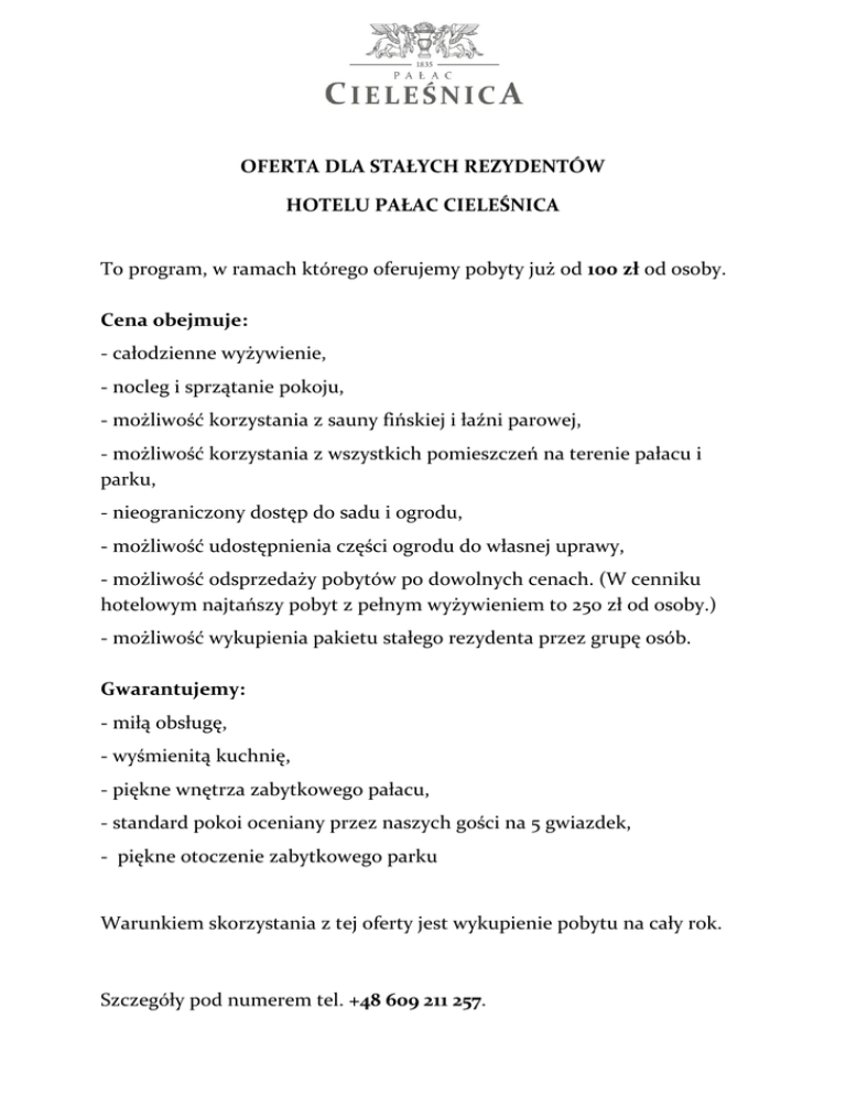 OFERTA DLA STAŁYCH REZYDENTÓW HOTELU PAŁAC CIELEŚNICA To program, w ramach którego oferujemy pobyty już od 100 zł od osoby. Cena obejmuje: - całodzienne wyżywienie, - nocleg i sprzątanie pokoju, - możliwość korzystania z sauny fińskiej i łaźni parowej, - możliwość korzystania z wszystkich pomieszczeń na terenie pałacu i parku, - nieograniczony dostęp do sadu i ogrodu, - możliwość udostępnienia części ogrodu do własnej uprawy, - możliwość odsprzedaży pobytów po dowolnych cenach. (W cenniku hotelowym najtańszy pobyt z pełnym wyżywieniem to 250 zł od osoby.) - możliwość wykupienia pakietu stałego rezydenta przez grupę osób. Gwarantujemy: - miłą obsługę, - wyśmienitą kuchnię, - piękne wnętrza zabytkowego pałacu, - standard pokoi oceniany przez naszych gości na 5 gwiazdek, - piękne otoczenie zabytkowego parku Warunkiem skorzystania z tej oferty jest wykupienie pobytu na cały rok. Szczegóły pod numerem tel. +48 609 211 257.