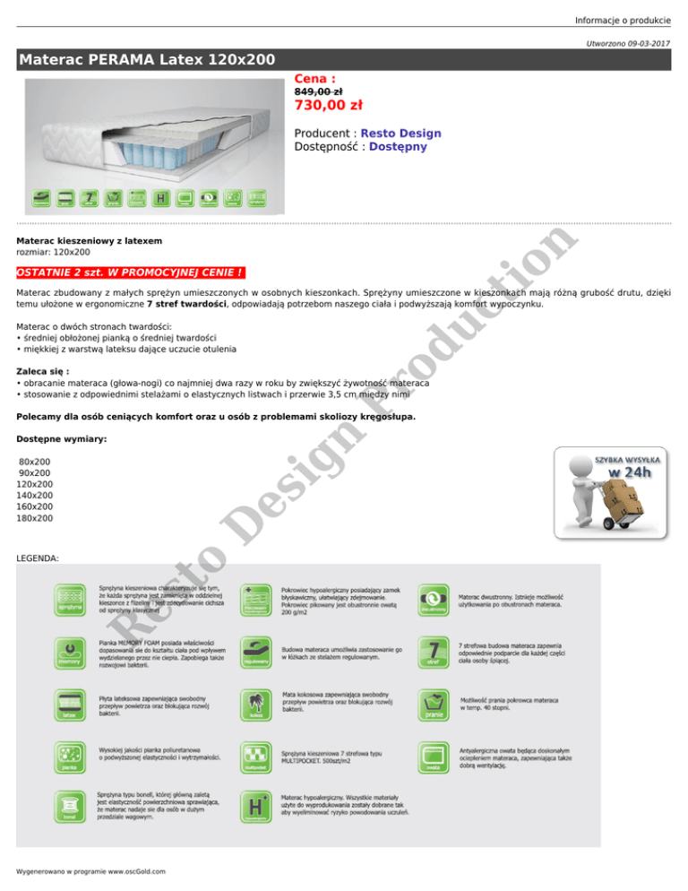Informacje o produkcie Utworzono 09-03-2017 Materac PERAMA Latex 120x200 Cena : 849,00 zł 730,00 zł Producent : Resto Design Dostępność : Dostępny Pr od uc ti o n Materac kieszeniowy z latexem rozmiar: 120x200 OSTATNIE 2 szt. W PROMOCYJNEJ CENIE ! Materac zbudowany z małych sprężyn umieszczonych w osobnych kieszonkach. Sprężyny umieszczone w kieszonkach mają różną grubość drutu, dzięki temu ułożone w ergonomiczne 7 stref twardości, odpowiadają potrzebom naszego ciała i podwyższają komfort wypoczynku. Materac o dwóch stronach twardości: • średniej obłożonej pianką o średniej twardości • miękkiej z warstwą lateksu dające uczucie otulenia Zaleca się : • obracanie materaca (głowa-nogi) co najmniej dwa razy w roku by zwiększyć żywotność materaca • stosowanie z odpowiednimi stelażami o elastycznych listwach i przerwie 3,5 cm między nimi ig n Polecamy dla osób ceniących komfort oraz u osób z problemami skoliozy kręgosłupa. Dostępne wymiary: D es 80x200 90x200 120x200 140x200 160x200 180x200 R es t o LEGENDA: Wygenerowano w programie www.oscGold.com Czas realizacji zamówienia: 2-5 dni Opcje dostawy:: ZAPYTAJ O KOSZT WYSYŁKI: [email protected] Dostępne opcje Materac PERAMA Latex 120x200 R es t o D es ig n Pr od uc ti o n » Rozmiar: 120x200.