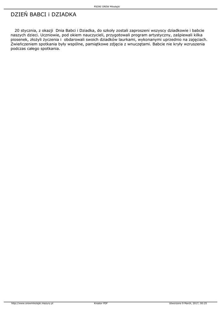 PSONI OREW Mikołajki DZIEŃ BABCI i DZIADKA 20 stycznia, z okazji Dnia Babci i Dziadka, do szkoły zostali zaproszeni wszyscy dziadkowie i babcie naszych dzieci. Uczniowie, pod okiem nauczycieli, przygotowali program artystyczny, zaśpiewali kilka piosenek, złożyli życzenia i obdarowali swoich dziadków laurkami, wykonanymi uprzednio na zajęciach. Zwieńczeniem spotkania były wspólne, pamiątkowe zdjęcia z wnuczętami. Babcie nie kryły wzruszenia podczas całego spotkania. http://www.orewmikolajki.mazury.pl Kreator PDF Utworzono 9 March, 2017, 00:25