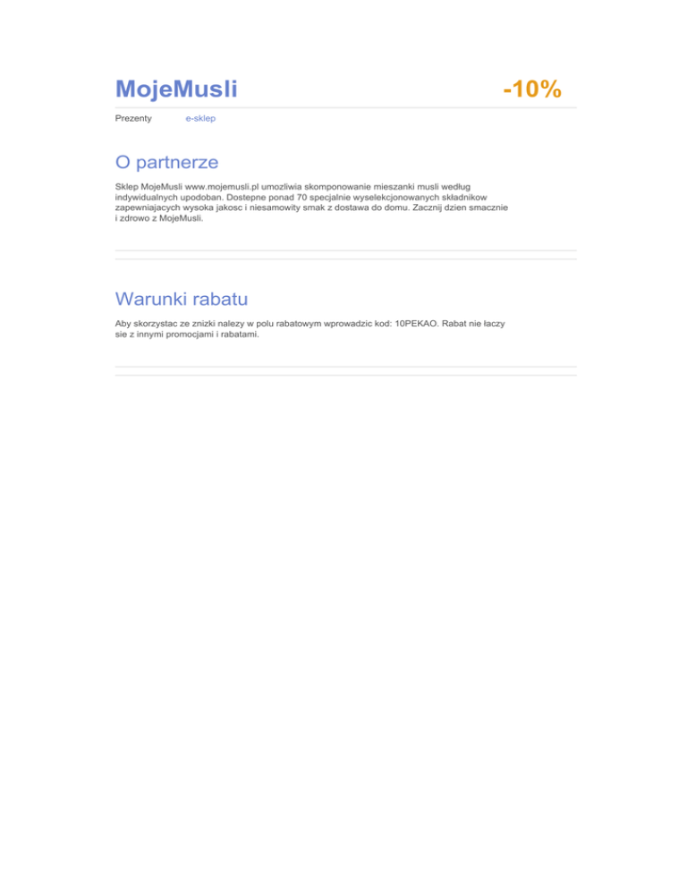 MojeMusli Prezenty -10% e-sklep O partnerze Sklep MojeMusli www.mojemusli.pl umozliwia skomponowanie mieszanki musli według indywidualnych upodoban. Dostepne ponad 70 specjalnie wyselekcjonowanych składnikow zapewniajacych wysoka jakosc i niesamowity smak z dostawa do domu. Zacznij dzien smacznie i zdrowo z MojeMusli. Warunki rabatu Aby skorzystac ze znizki nalezy w polu rabatowym wprowadzic kod: 10PEKAO. Rabat nie łaczy sie z innymi promocjami i rabatami.