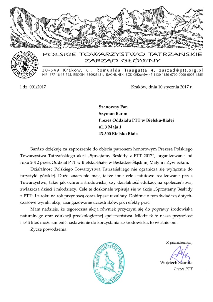 l.dz. 001/2017 Kraków, dnia 10 stycznia 2017 r. Szanowny Pan Szymon Baron Prezes Oddziału PTT w Bielsku‐Białej ul. 3 Maja 1 43‐300 Bielsko Biała Bardzo dziękuję za zaproszenie do objęcia patronem honorowym Prezesa Polskiego Towarzystwa Tatrzańskiego akcji „Sprzątamy Beskidy z PTT 2017”, organizowanej od roku 2012 przez Oddział PTT w Bielsku‐Białej w Beskidzie Śląskim, Małym i Żywieckim. Działalność Polskiego Towarzystwa Tatrzańskiego nie ogranicza się wyłącznie do turystyki górskiej. Duże znaczenie mają także inne cele statutowe realizowane przez Towarzystwo, takie jak ochrona środowiska, czy działalność edukacyjna społeczeństwa, zwłaszcza dzieci i młodzieży. Cele te doskonale wpisują się w akcję „Sprzątamy Beskidy z PTT” i z roku na rok przynoszą coraz lepsze rezultaty. Dobitnie o tym świadczą dotych‐ czasowe wyniki akcji, zaangażowanie uczestników, jak i efekty prac. Mam nadzieję, że tegoroczna akcja również przyczyni się do poprawy środowiska naturalnego oraz edukacji proekologicznej społeczeństwa. Młodzież to nasza przyszłość i jeśli ktoś może zmienić nastawienie do korzystania ze środowiska, to właśnie oni. Życzę powodzenia! Z poważaniem, Wojciech Szarota Prezes PTT