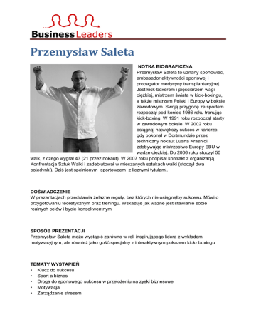 Przemysław Saleta NOTKA BIOGRAFICZNA Przemysław Saleta to uznany sportowiec, ambasador aktywności sportowej i propagator medycyny transplantacyjnej. Jest kick-boxerem i pięściarzem wagi ciężkiej, mistrzem świata w kick-boxingu, a także mistrzem Polski i Europy w boksie zawodowym. Swoją przygodę ze sportem rozpoczął pod koniec 1986 roku trenując kick-boxing. W 1991 roku rozpoczął starty w zawodowym boksie. W 2002 roku osiągnął największy sukces w karierze, gdy pokonał w Dortmundzie przez techniczny nokaut Luana Krasniqi, zdobywając mistrzostwo Europy EBU w wadze ciężkiej. Do 2006 roku stoczył 50 walk, z czego wygrał 43 (21 przez nokaut). W 2007 roku podpisał kontrakt z organizacją Konfrontacja Sztuk Walki i zadebiutował w mieszanych sztukach walki (stoczył dwa pojedynki). Dziś jest spełnionym sportowcem z licznymi tytułami. DOŚWIADCZENIE W prezentacjach przedstawia żelazne reguły, bez których nie osiągnąłby sukcesu. Mówi o przygotowaniu teoretycznym oraz treningu. Wskazuje jak ważne jest stawianie sobie realnych celów i bycie konsekwentnym SPOSÓB PREZENTACJI Przemysław Saleta może wystąpić zarówno w roli inspirującego lidera z wykładem motywacyjnym, ale również jako gość specjalny z interaktywnym pokazem kick- boxingu TEMATY WYSTĄPIEŃ • Klucz do sukcesu • Sport a biznes • Droga do sportowego sukcesu w przełożeniu na zyski biznesowe • Motywacja • Zarządzanie stresem RODZAJE WYSTĄPIEŃ Wykłady motywacyjne, prezentacje, szkolenia Kontakt: email: [email protected] telefon: +48 604 951 393