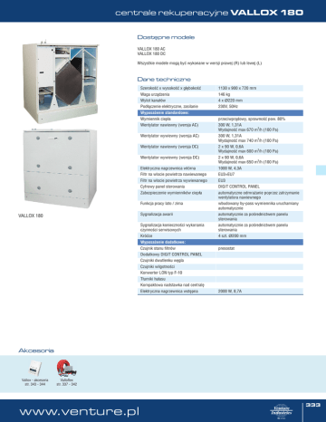 centrale rekuperacyjne VALLOX 180 Dostêpne modele VALLOX 180 AC VALLOX 180 DC Wszystkie modele mog¹ byæ wykonane w wersji prawej (R) lub lewej (L) Dane techniczne Szerokoœæ x wysokoœæ x g³êbokoœæ 1130 x 900 x 720 mm Waga urz¹dzenia 146 kg Wylot kana³ów 4 x O220 mm Pod³¹czenie elektryczne, zasilanie 230V, 50Hz Wyposa¿enie standardowe: VALLOX 180 Wymiennik ciep³a przeciwpr¹dowy, sprawnoœæ pow. 80% Wentylator nawiewny (wersja AC) 300 W, 1,31A Wydajnoœæ max 670 m3/h (100 Pa) Wentylator wywiewny (wersja AC) 300 W, 1,31A Wydajnoœæ max 740 m3/h (100 Pa) Wentylator nawiewny (wersja DC) 2 x 90 W, 0,6A Wydajnoœæ max 600 m3/h (100 Pa) Wentylator wywiewny (wersja DC) 2 x 90 W, 0,6A Wydajnoœæ max 650 m3/h (100 Pa) Elektryczna nagrzewnica wtórna 1000 W, 4,3A Filtr na wlocie powietrza nawiewanego EU3+EU7 Filtr na wlocie powietrza wywiewanego EU3 Cyfrowy panel sterowania DIGIT CONTROL PANEL Zabezpieczenie wymienników ciep³a automatyczne odmra¿anie poprzez zatrzymanie wentylatora nawiewnego Funkcja pracy lato / zima wbudowany by-pass wymiennika uruchamiany automatycznie Sygnalizacja awarii automatycznie za poœrednictwem panelu sterowania Sygnalizacja koniecznoœci wykonania czynnoœci serwisowych automatycznie za poœrednictwem panelu sterowania Króæce 4 szt. O200 mm Wyposa¿enie dodatkowe: Czujnik stanu filtrów presostat Dodatkowy DIGIT CONTROL PANEL Czujniki dwutlenku wêgla Czujniki wilgotnoœci Konwerter LON typ F-10 T³umiki ha³asu Kompaktowa nadstawka nad centralê Elektryczna nagrzewnica wstêpna 2000 W, 8,7A Akcesoria Vallox - akcesoria str. 343 - 344 Valloflex str. 337 - 342 www.venture.pl 333 centrale rekuperacyjne VALLOX 180 Charakterystyka pracy Wymiary [mm] VALLOX 180 VALLOX 180 [Pa] 3 [dm /s] Poziom dŸwiêku Œrednia czêstotliwoœæ drgañ (Hz) Hz 63 125 250 500 1000 2000 4000 8000 Lw,dB Lwa,dB Emisja dŸwiêku z centrali do przewodów nawiewnych Emisja dŸwiêku z centrali do przewodów wywiewnych dla wybranych czêstotliwoœci dla wybranych czêstotliwoœci 2 4 6 8 2 4 6 8 65 l/s 97 l/s 128 l/s 171 l/s 78 l/s 111 l/s 143 l/s 188 l/s 67 64 43 39 38 31 74 68 51 46 43 37 21 78 73 54 51 47 42 27 72 56 42 36 37 32 15 76 64 49 41 43 39 27 68 47 75 53 79 57 84 78 60 57 52 47 34 21 85 63 72 46 76 52 79 69 56 46 48 43 33 22 79 56 83 73 61 52 52 48 39 31 84 61 Emisja dŸwiêku z centrali do pomieszczenia przez obudowê Pozycja regulatora/przep³yw powietrza LpA, db (A) 2 4 6 8 66/78 l/s 98/111 l/s 129/142 l/s 174/186 l/s 36 42 47 52 VALLOX 180 AC 334 Venture Industries Sp. z o.o. ul. Mokra 27, 05-092 £omianki - Kie³pin tel. +48 22 751 95 50, 751 20 31 fax +48 22 751 22 59, 751 12 02 e-mail: [email protected] centrale rekuperacyjne VALLOX 180 Charakterystyka pracy Wymiary [mm] VALLOX 180 VALLOX 180 [Pa] [dm3/s] Poziom dŸwiêku Œrednia czêstotliwoœæ drgañ (Hz) Hz 63 125 250 500 1000 2000 4000 8000 Lw, dB Lwa,dB Emisja dŸwiêku z centrali do przewodów nawiewnych Emisja dŸwiêku z centrali do przewodów wywiewnych dla wybranych czêstotliwoœci dla wybranych czêstotliwoœci 2 4 6 8 2 4 6 8 51 l/s 86 l/s 124 l/s 155 l/s 55 l/s 95 l/s 129 l/s 160 l/s 60 54 42 42 38 31 17 66 66 52 49 49 39 22 68 69 59 54 53 44 29 72 72 60 59 56 50 34 63 53 43 40 38 32 13 68 63 51 48 48 42 27 61 44 69 54 72 58 76 61 63 43 69 53 72 67 57 53 51 46 35 26 73 57 76 70 60 57 54 51 40 32 77 60 Emisja dŸwiêku z centrali do pomieszczenia przez obudowê Pozycja regulatora/przep³yw powietrza LpA, db (A) 2 4 6 8 54/60 l/s 92/96 l/s 127/130 l/s 160/163 l/s 40 47 50 54 www.venture.pl VALLOX 180 DC 335