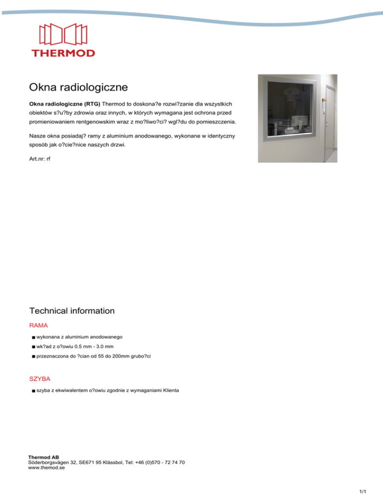 Okna radiologiczne Okna radiologiczne (RTG) Thermod to doskona?e rozwi?zanie dla wszystkich obiektów s?u?by zdrowia oraz innych, w których wymagana jest ochrona przed promieniowaniem rentgenowskim wraz z mo?liwo?ci? wgl?du do pomieszczenia. Nasze okna posiadaj? ramy z aluminium anodowanego, wykonane w identyczny sposób jak o?cie?nice naszych drzwi. Art.nr: rf Technical information RAMA ■ wykonana z aluminium anodowanego ■ wk?ad z o?owiu 0.5 mm - 3.0 mm ■ przeznaczona do ?cian od 55 do 200mm grubo?ci SZYBA ■ szyba z ekwiwalentem o?owiu zgodnie z wymaganiami Klienta Thermod AB Söderborgsvägen 32, SE671 95 Klässbol, Tel: +46 (0)570 - 72 74 70 www.themod.se 1/1