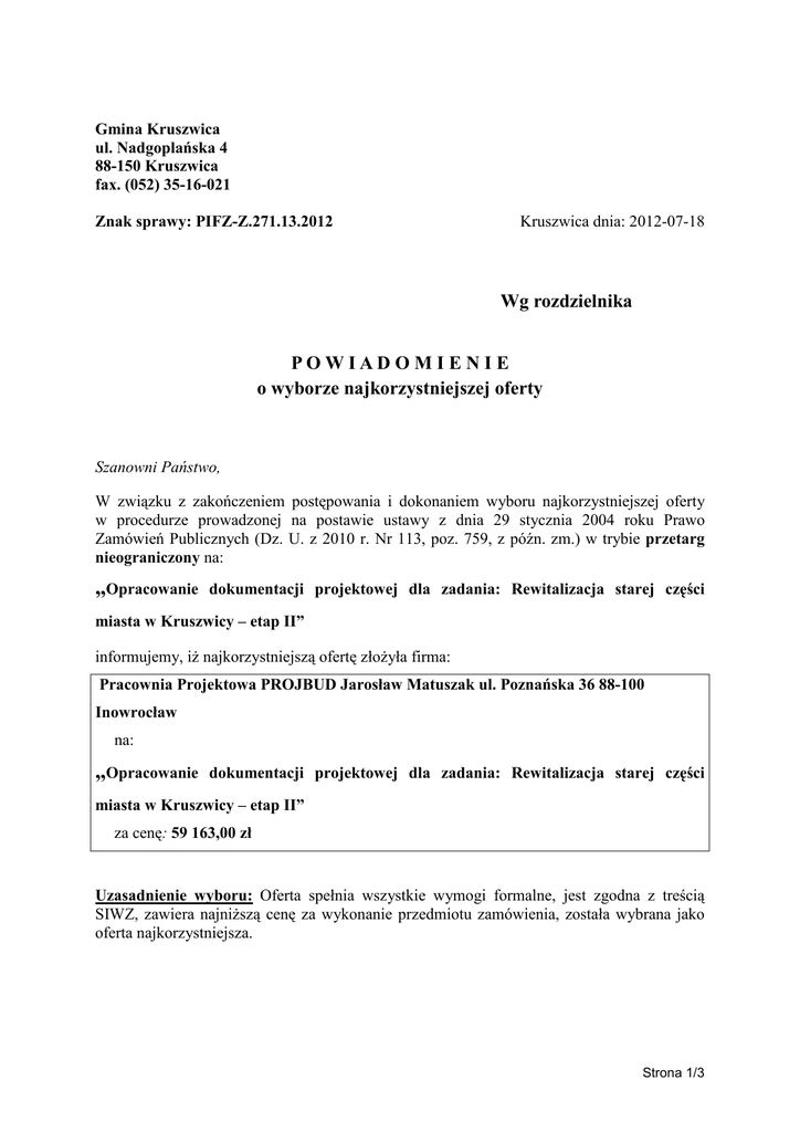 Gmina Kruszwica ul. Nadgoplańska 4 88-150 Kruszwica fax. (052) 35-16-021 Znak sprawy: PIFZ-Z.271.13.2012 Kruszwica dnia: 2012-07-18 Wg rozdzielnika POWIADOMIENI E o wyborze najkorzystniejszej oferty Szanowni Państwo, W związku z zakończeniem postępowania i dokonaniem wyboru najkorzystniejszej oferty w procedurze prowadzonej na postawie ustawy z dnia 29 stycznia 2004 roku Prawo Zamówień Publicznych (Dz. U. z 2010 r. Nr 113, poz. 759, z późn. zm.) w trybie przetarg nieograniczony na: „Opracowanie dokumentacji projektowej dla zadania: Rewitalizacja starej części miasta w Kruszwicy – etap II” informujemy, iŜ najkorzystniejszą ofertę złoŜyła firma: Pracownia Projektowa PROJBUD Jarosław Matuszak ul. Poznańska 36 88-100 Inowrocław na: „Opracowanie dokumentacji projektowej dla zadania: Rewitalizacja starej części miasta w Kruszwicy – etap II” za cenę: 59 163,00 zł Uzasadnienie wyboru: Oferta spełnia wszystkie wymogi formalne, jest zgodna z treścią SIWZ, zawiera najniŜszą cenę za wykonanie przedmiotu zamówienia, została wybrana jako oferta najkorzystniejsza. Strona 1/3 Streszczenie oceny i porównania złoŜonych ofert: Nr tem atu 1 1 1 1 Nazwa i adres wykonawcy (Nr oferty) Pracownia Projektowa PROJBUD Jarosław Matuszak ul. Poznańska 36 88-100 Inowrocław (4) Palmett- Markowe Ogrody S. C. Marek Stefański, Bartłomiej Gasparski, ul. Arbuzowa14/26 02-747 Warszawa (2) MBZ Andler, Tomczak sp. j. ul. Jana Pawła II 79 87-800 Włocławek (3) BD PROJEKT Piotr Doniec ul. Hawajska 15m. 44 02-776 Warszawa (1) Liczba pkt w kryterium Cena (koszt) Razem 100,00 100,00 68,50 68,50 51,17 51,17 42,68 42,68 W toku postępowania odrzucone zostały następujące oferty: Lp.: Nr oferty, nazwa i adres wykonawcy: Uzasadnienie odrzucenia oferty: Zamawiający wykluczył z postępowania: Lp.: Nazwa i adres wykonawcy: Uzasadnienie wykluczenia wykonawcy: Jednocześnie informujemy, Ŝe umowa w spawie zamówienia publicznego moŜe być zawarta, z zastrzeŜeniem art. 183 ustawy Prawo Zamówień Publicznych, w terminie nie krótszym niŜ 5 dni od dnia przesłania niniejszego zawiadomienia o wyborze najkorzystniejszej oferty. Zamawiający moŜe zawrzeć umowę w sprawie zamówienia publicznego przed upływem terminu, o którym mowa powyŜej, jeŜeli zachodzą okoliczności wymienione w art. 94 ust. 2 ustawy Prawo Zamówień Publicznych. Równocześnie zawiadamiamy, iŜ wyłącznie od niezgodnej z przepisami ustawy Prawo Zamówień Publicznych czynności Zamawiającego Strona 2/3 podjętej w postępowaniu o udzielenie zamówienia lub zaniechania czynności, do której Zamawiający jest zobowiązany na podstawie ustawy Prawo Zamówień Publicznych przysługuje odwołanie, z zastrzeŜeniem art. 180 ust. 2 ustawy Prawo Zamówień Publicznych. Odwołanie wnosi się w terminach i formie, określonych w art. 182 oraz art. 180 ust. 4 ustawy Prawo Zamówień Publicznych. Sporządziła:M.Winiarczyk Strona 3/3